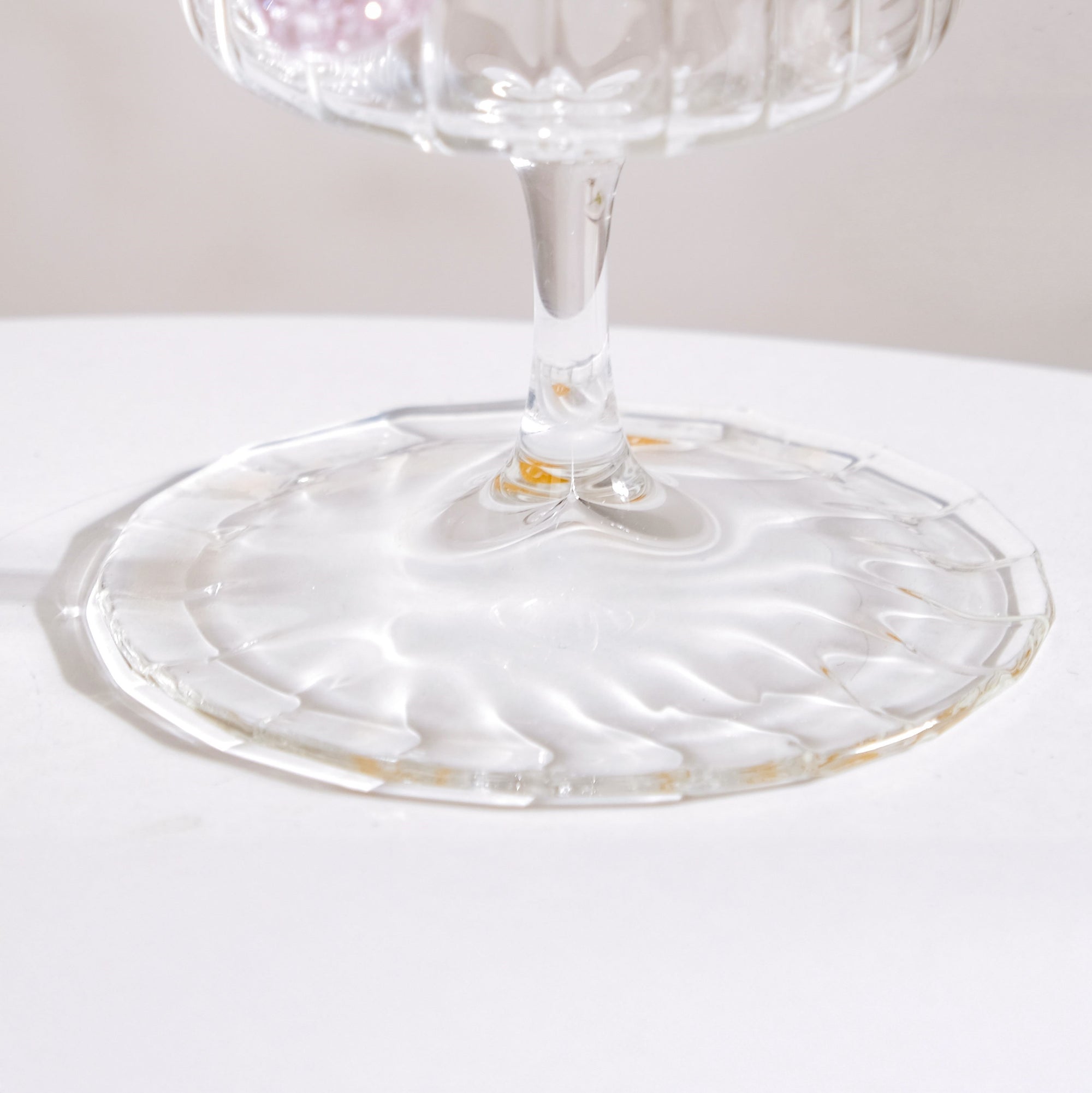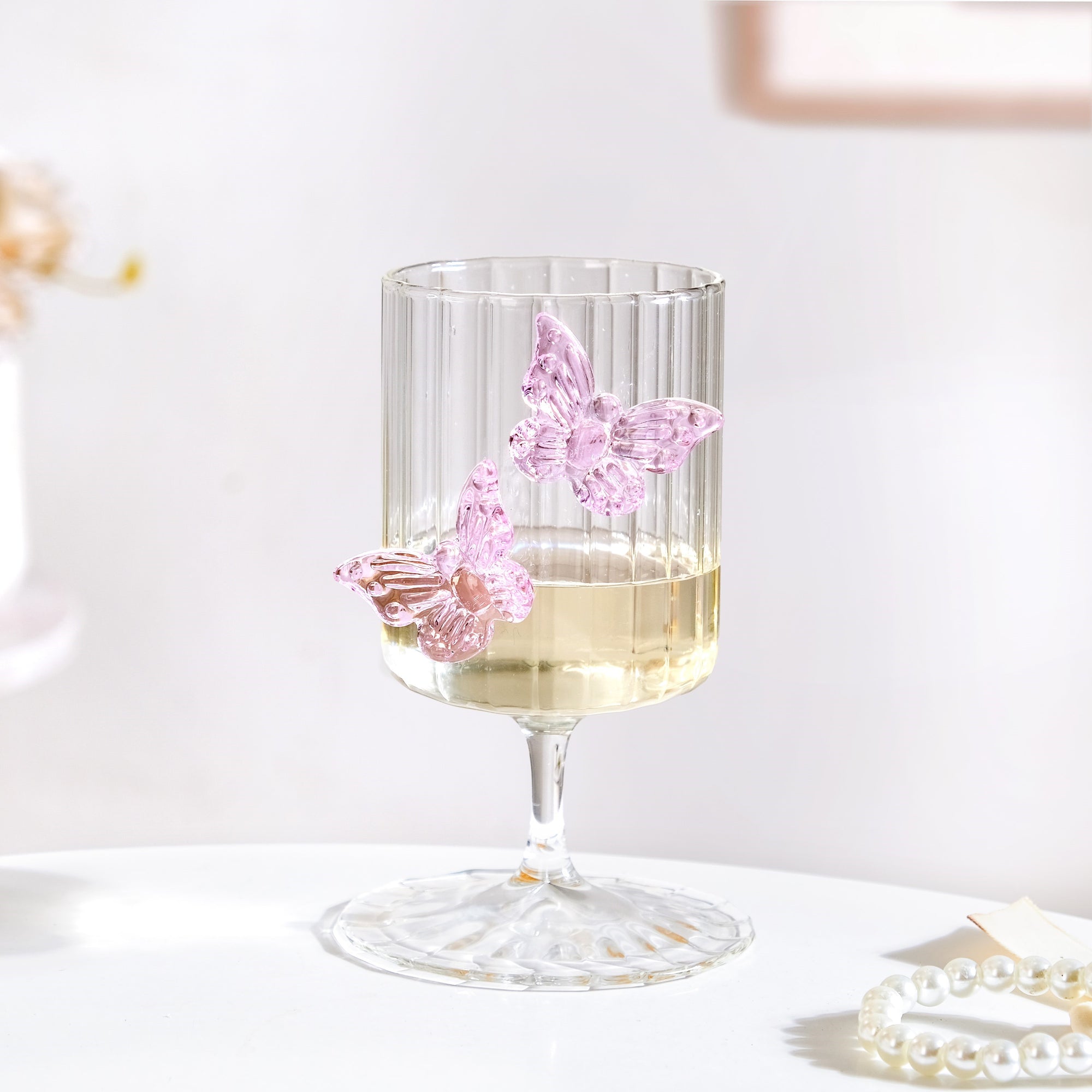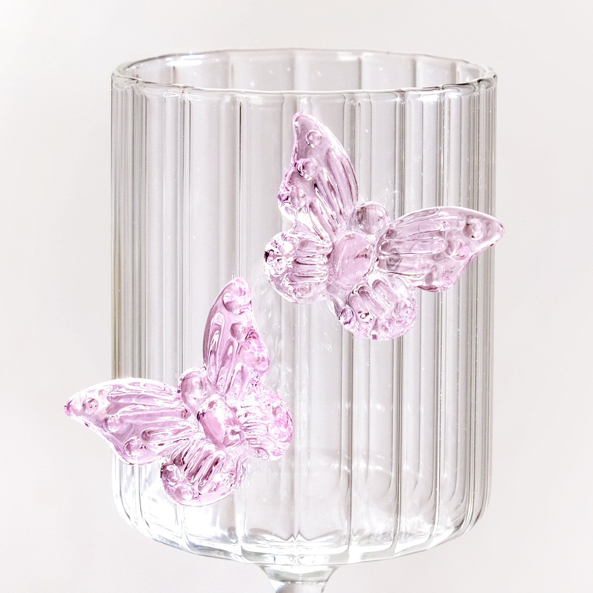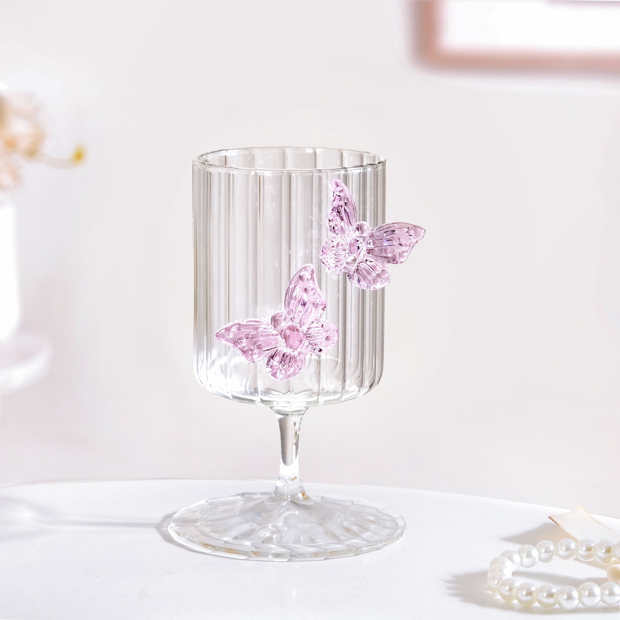 Design: This stemmed wine glass features two blush-pink butterfly motifs crafted from crystal-like textured glass, delicately attached to the clear body. Inside, a ribbed surface adds depth and visual brilliance as it catches the light. The silhouette is sleek and slender, paired with a stable base and an elongated stem that enhances its refined, elegant appearance.