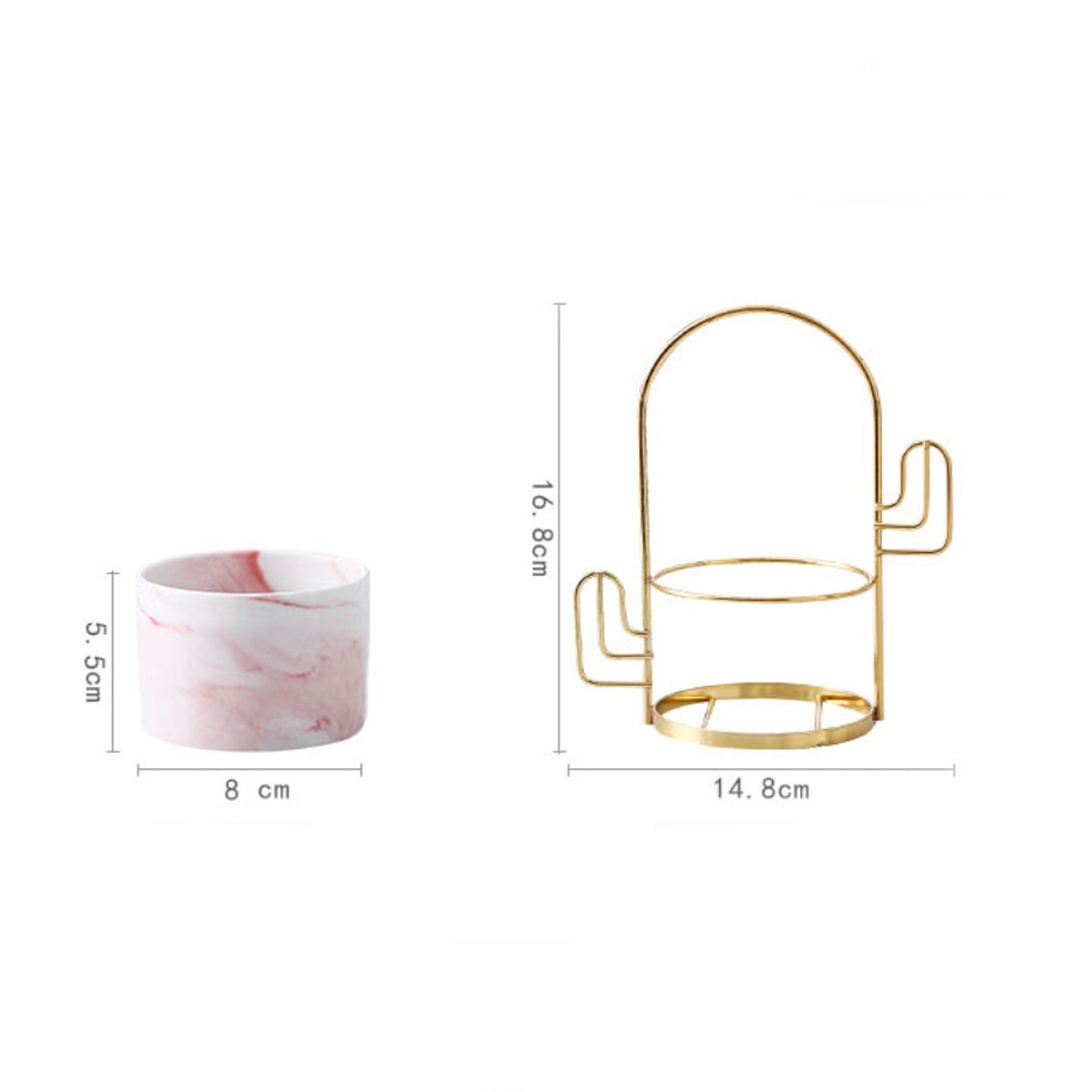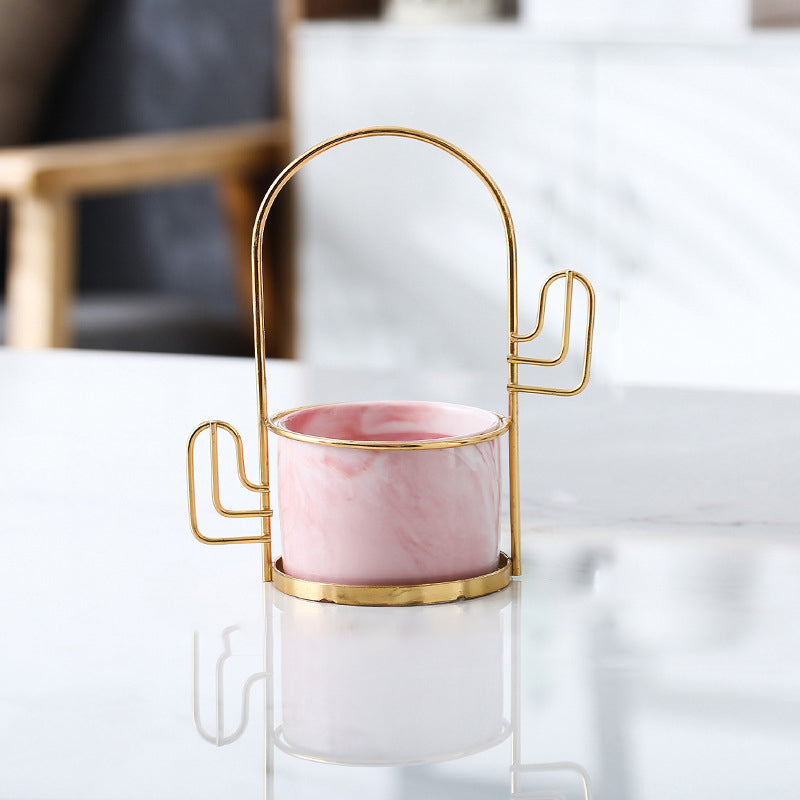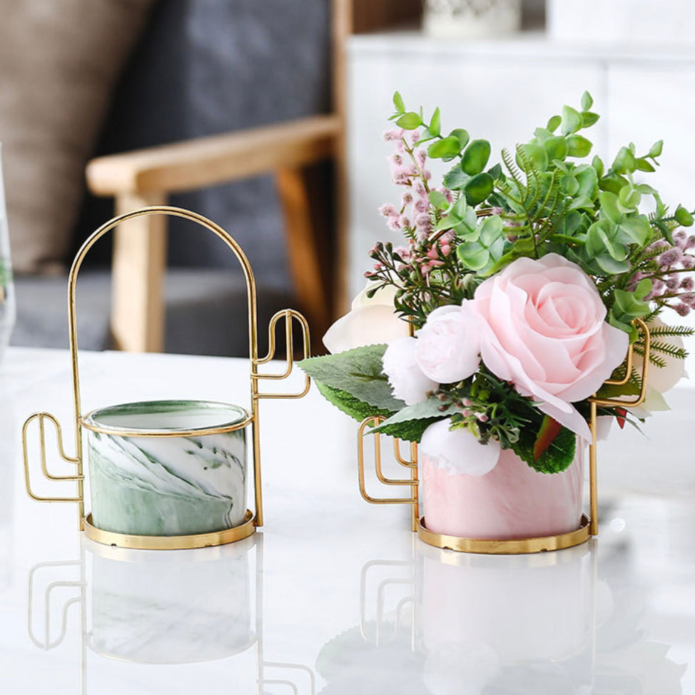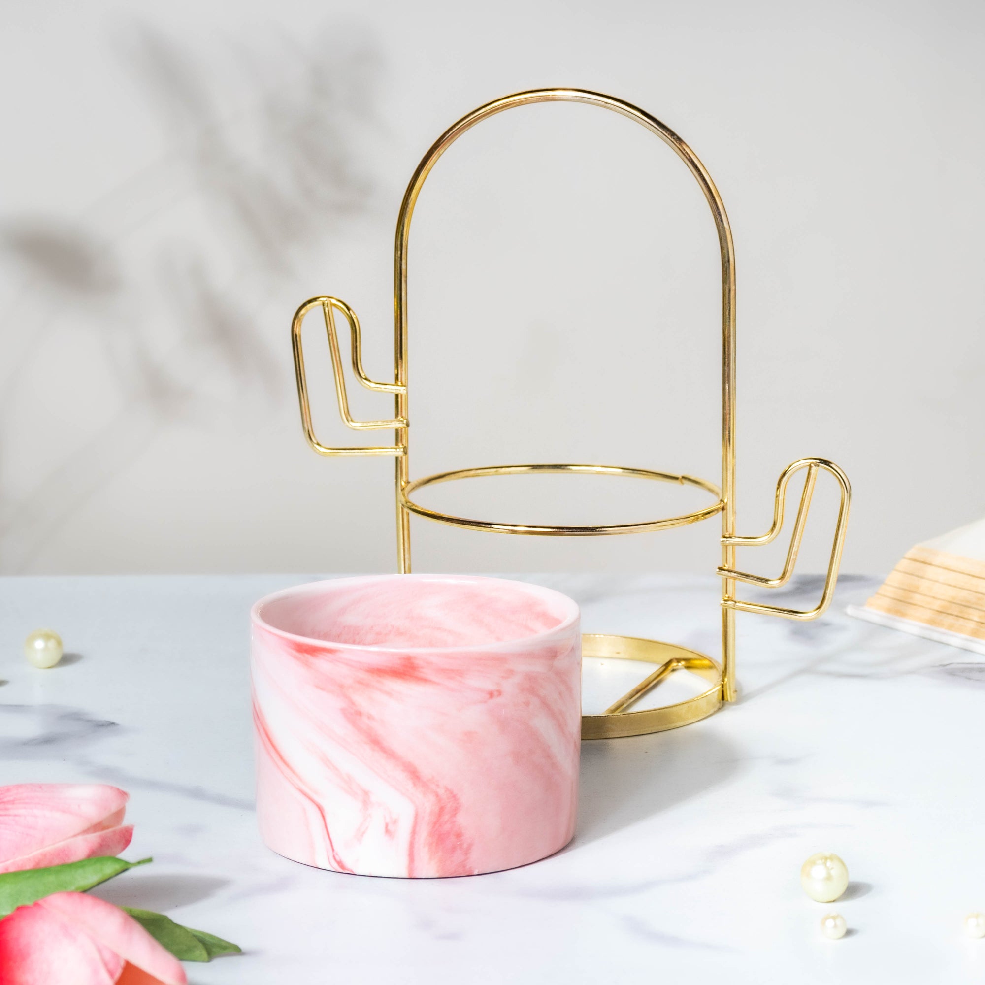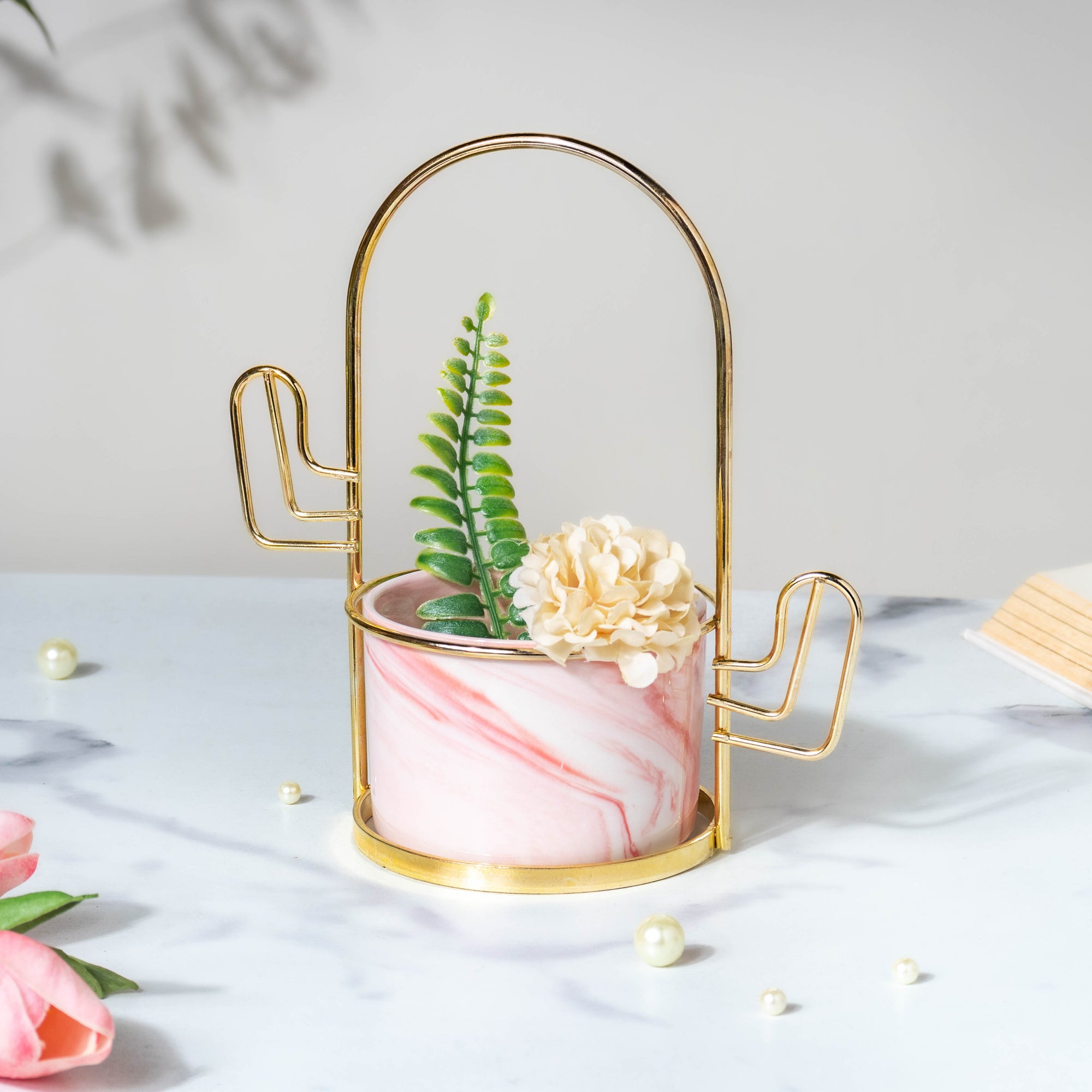 The elegant planter in a light shade of pink, blends in easily with the contemporary interiors of a modern house. The planter sits elegantly in a cactus-shaped metal frame that exudes sophistication. The simple yet spectacular planter stands out in a living room décor when adorned with multicoloured floral arrangements. The planter does not have a drainage hole, hence, it's advisable to not pour excess water in the soil while nurturing greens.