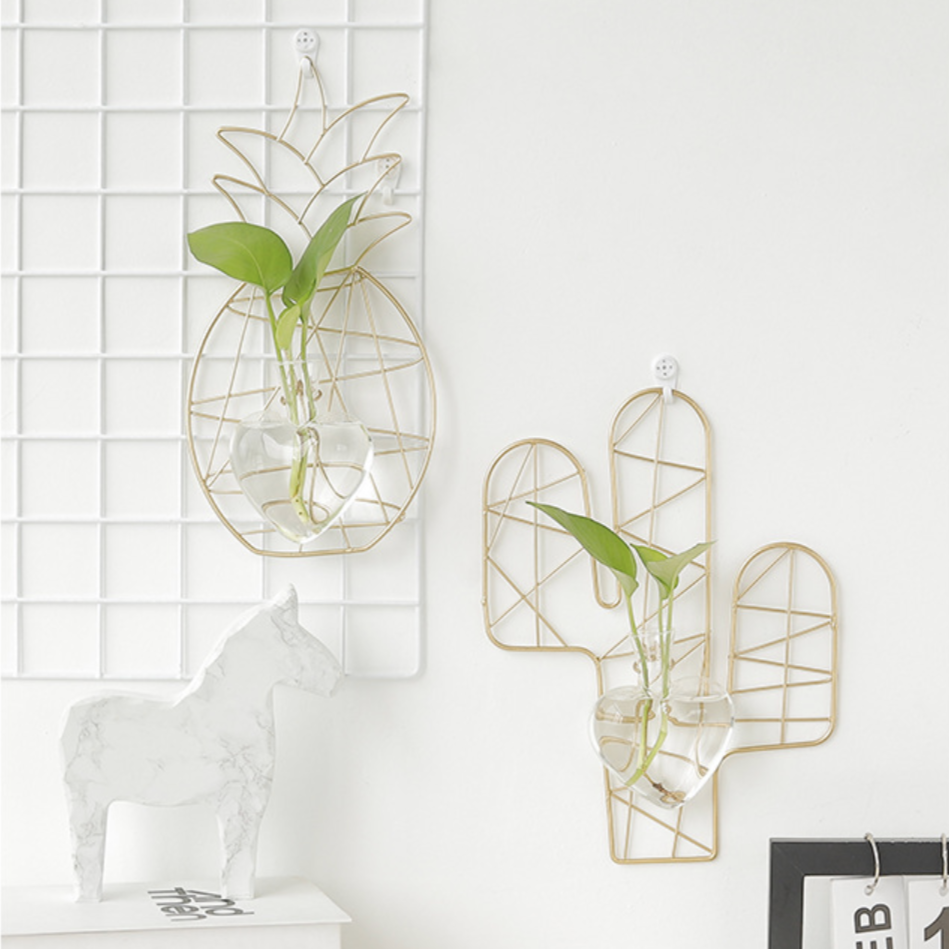 A glass planter hooked to a metal frame which comes in the shape of a long cactus and can be mounted on the wall. The planter is detachable, transparent and is in a heart shape which looks unconventional and neat. The frame can also be used without the planter which adds elegance and uplifts the aesthetics of a wall effortlessly. It can also be used as a unique gifting item for occasions. Plant is not included.
