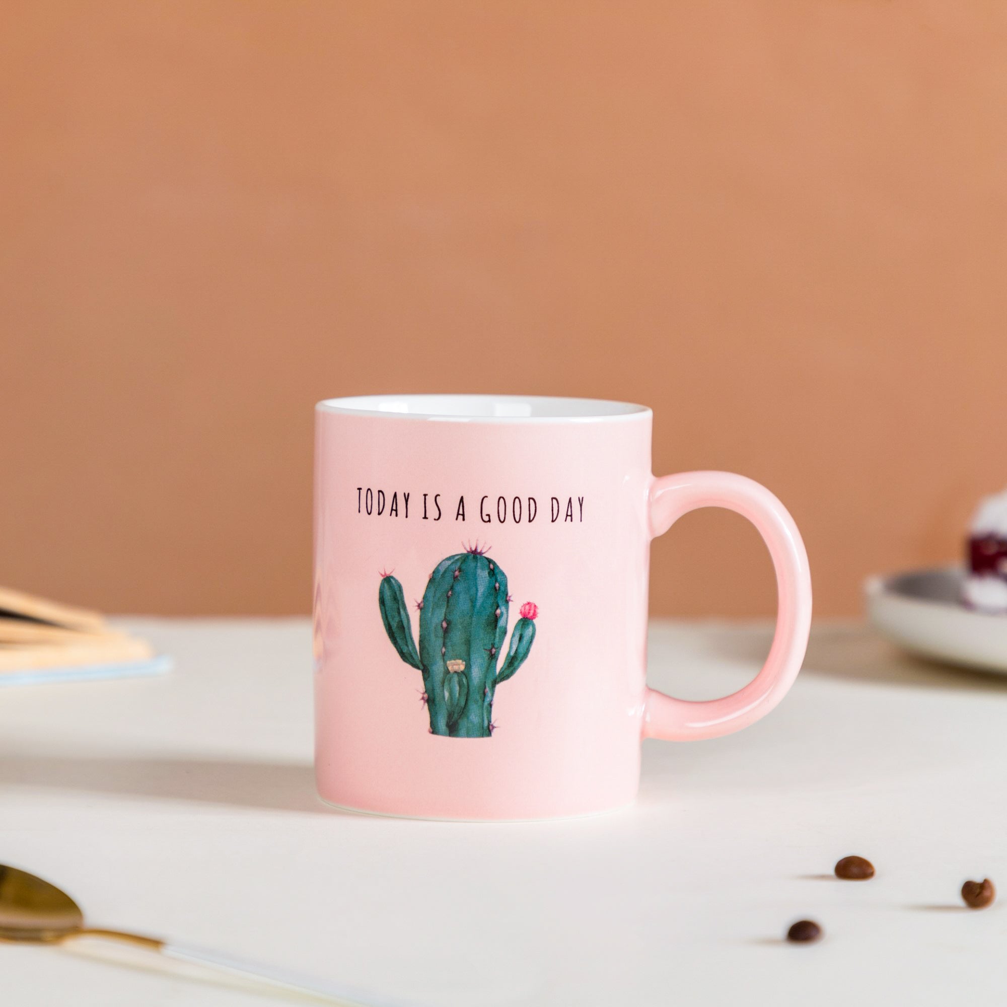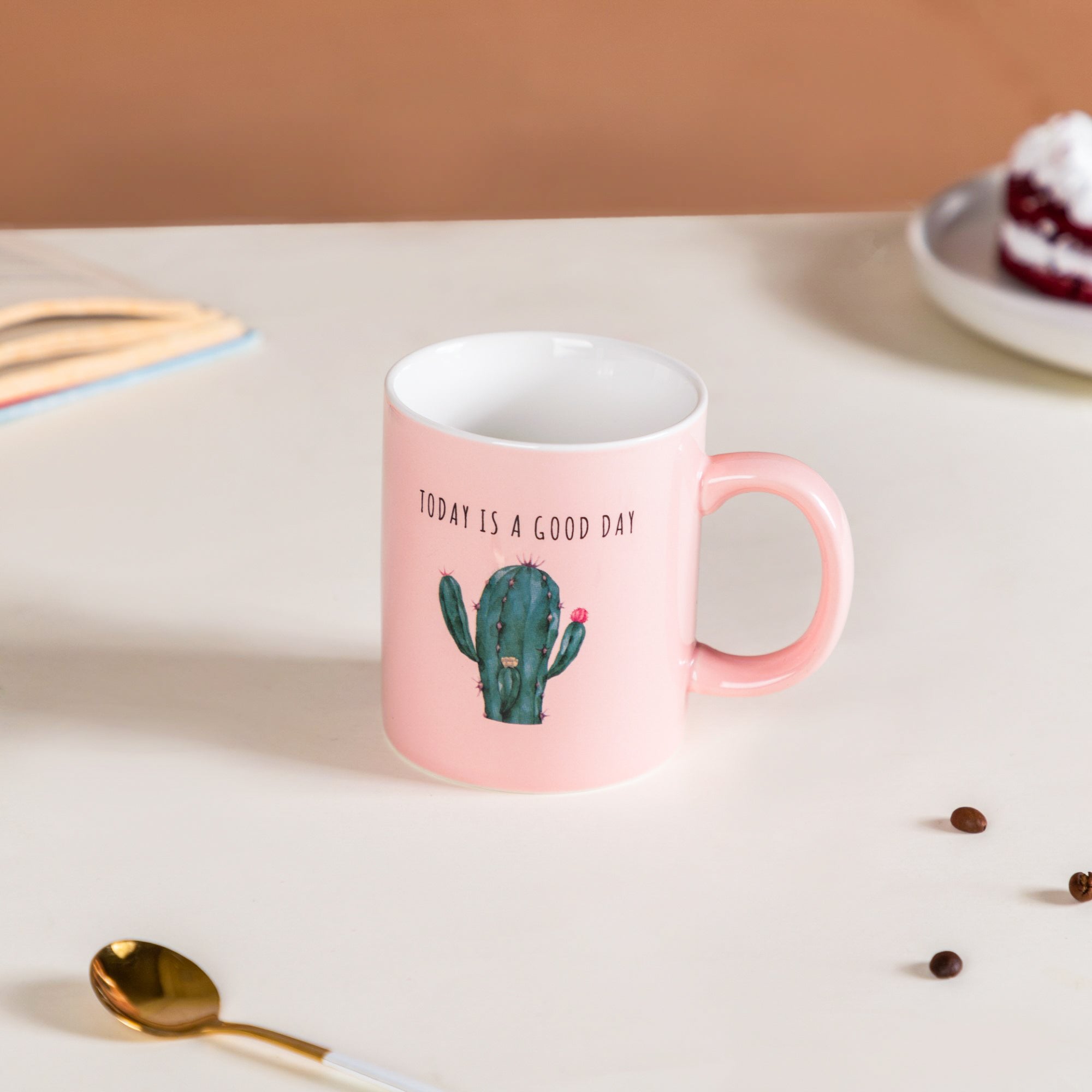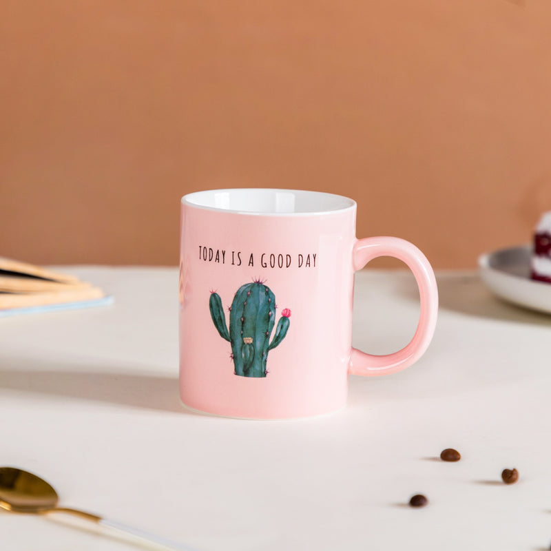 Mug with a cactus print that says today is a good day and it is the right kind of motivation that one needs everyday. The tea cup is perfect for morning tea that will help one start with a positive reinforcement. Have warm beverages like coffee, milk or flavoured tea in the coffee cup.