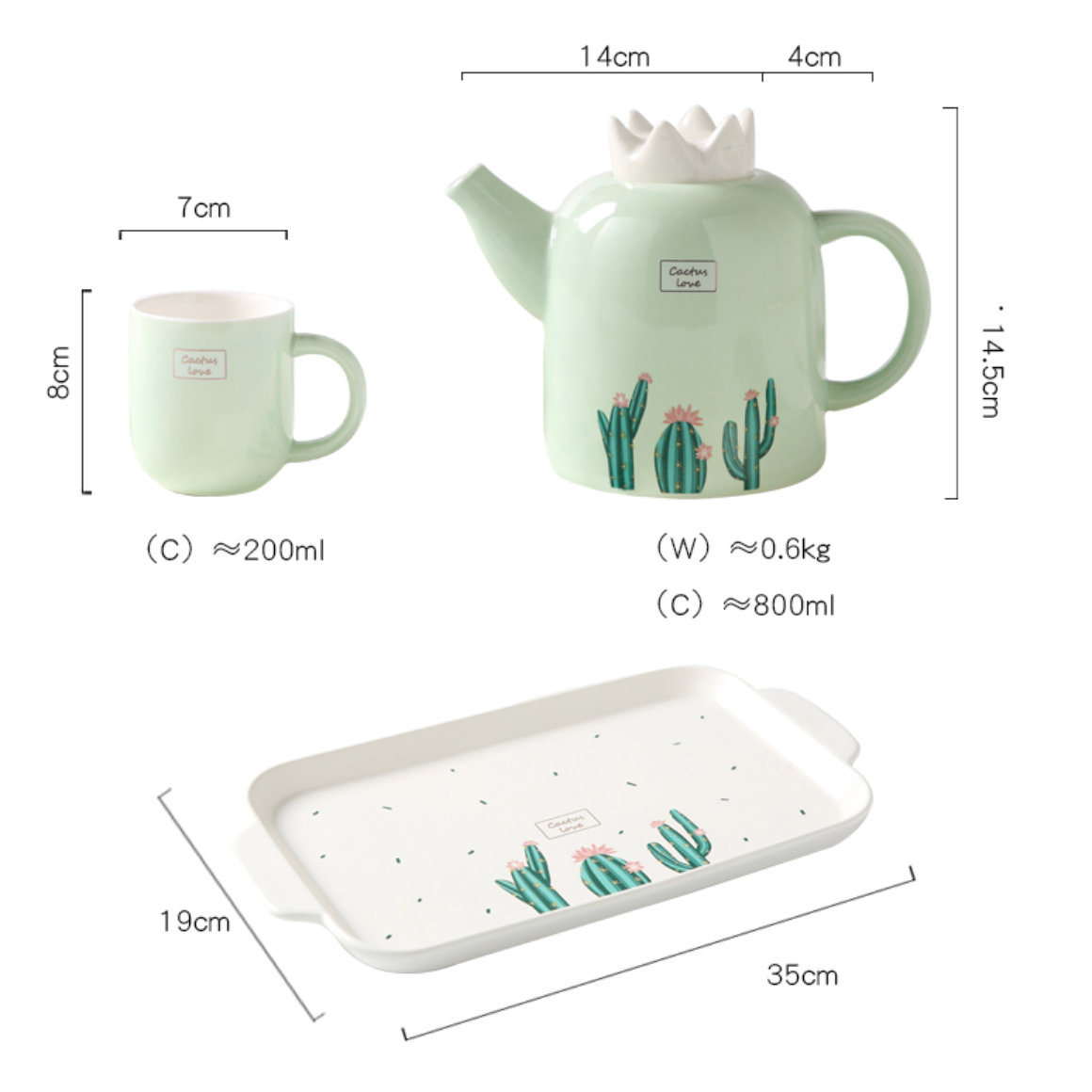 Cactus tea set in pastel green shade with fine print of cactus plant on the surface. The unique tea pot set comes with 4 tea cups, a teapot with lid and a serving tray to add to the convenience of serving. The tea set can be used in many fun ways for serving warm drinks and caffeine at a tea party. The brightness and the quirkiness of the product makes it a must have. The set is not microwave safe.