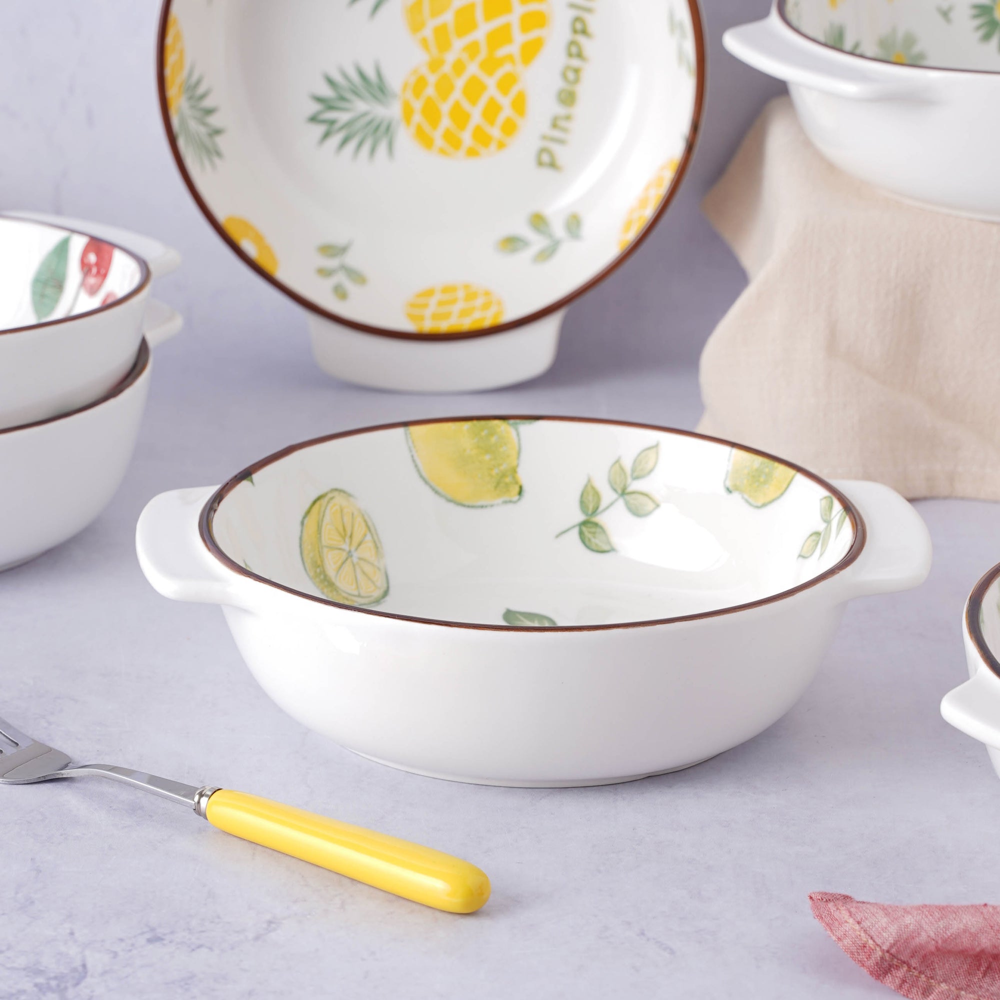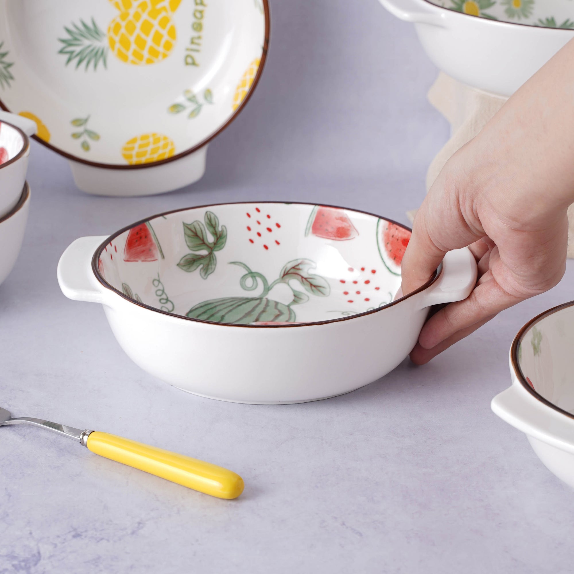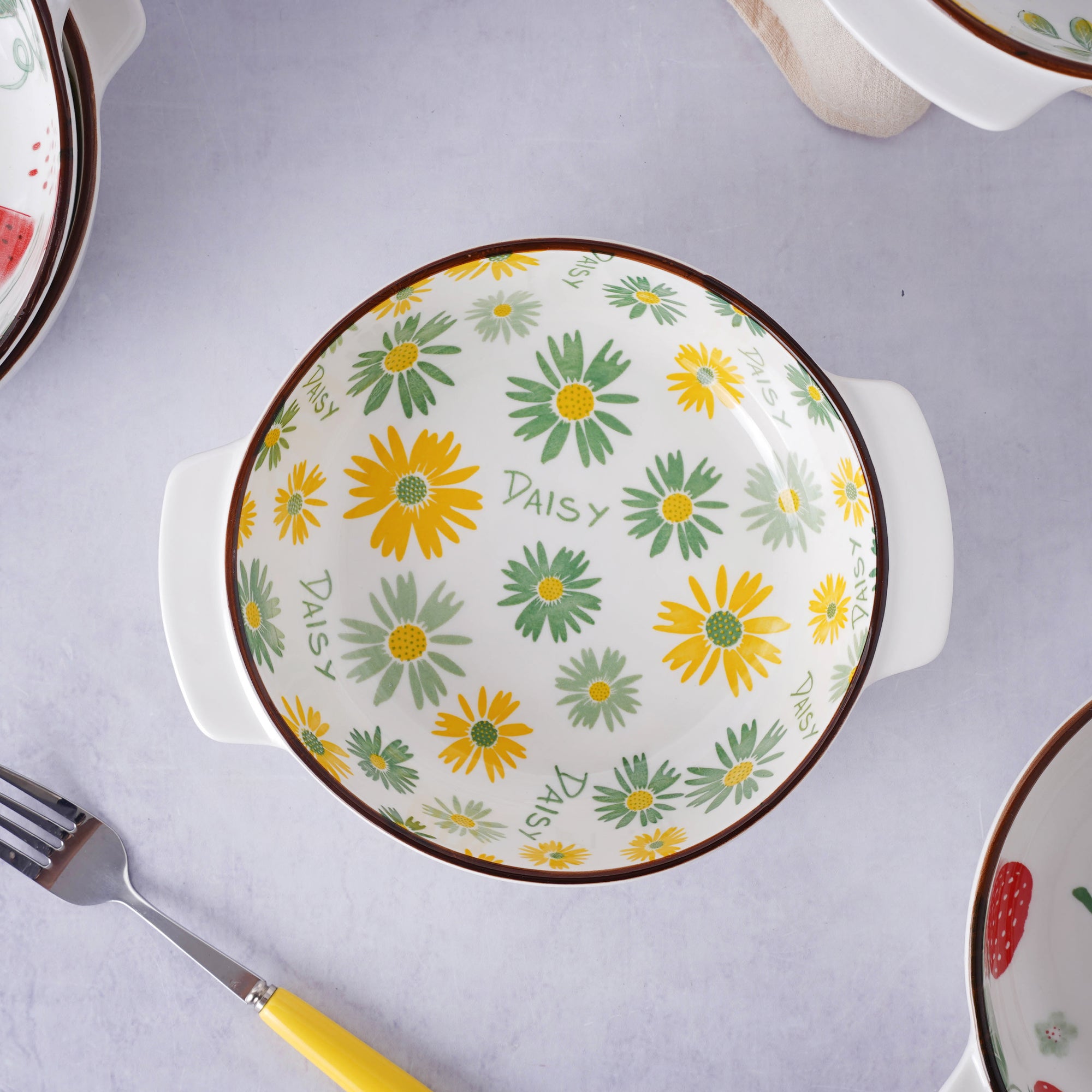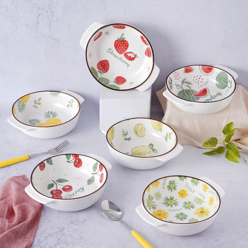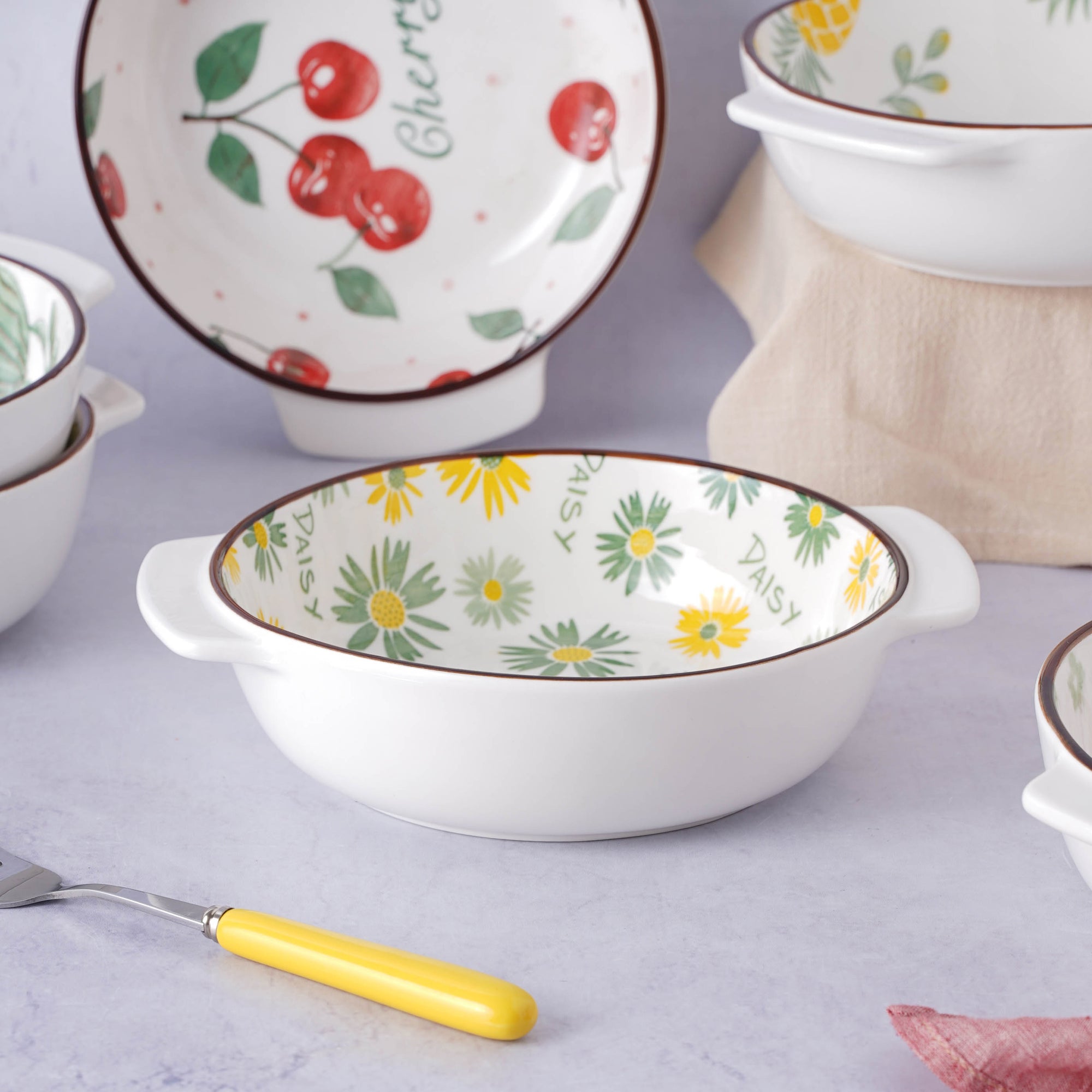 Cake pans made in ceramic with a white exterior and colourful patterns on the inside. The baking pans are available in different styles, each with a unique pattern. One can bake chocolate cakes, fudge, vegetables, chicken, and more. Both sides of the ceramic baking pans have handles, making them convenient to hold and serve. The colorful bakeware can be used to add appeal and colour to a dining table and are also oven, microwave and dishwasher friendly. The microwave safe bowls can be used to serve breakfast or heat food as well. Create a cake pan set with the cake pans for oven and gift it to the baker friend or family member.