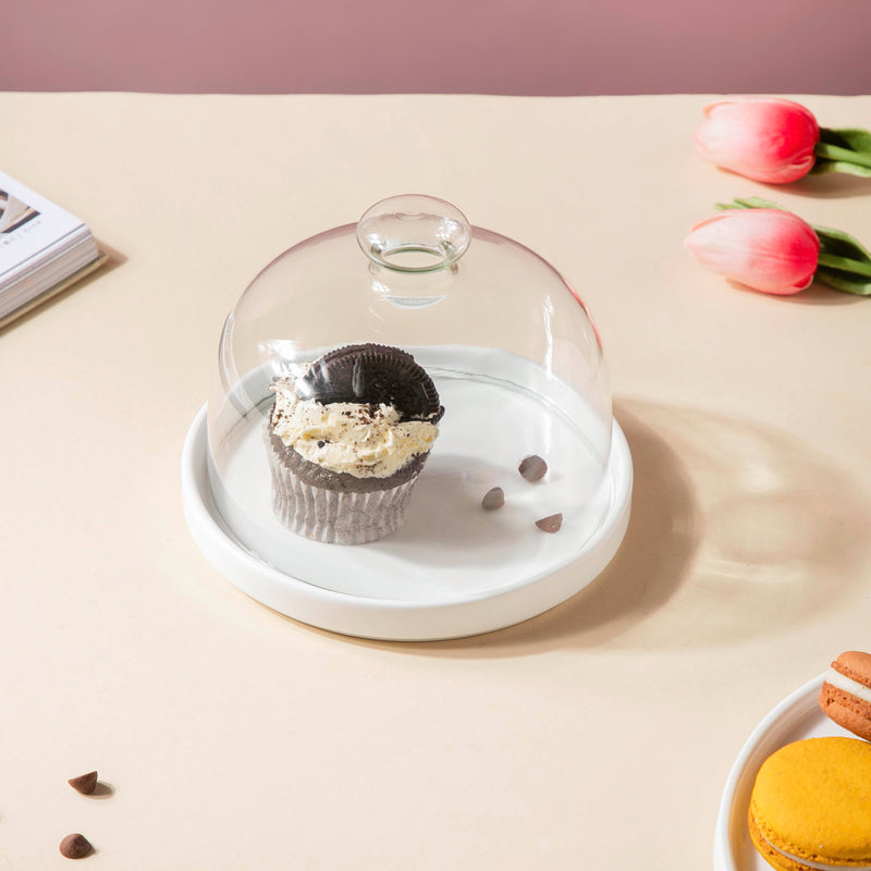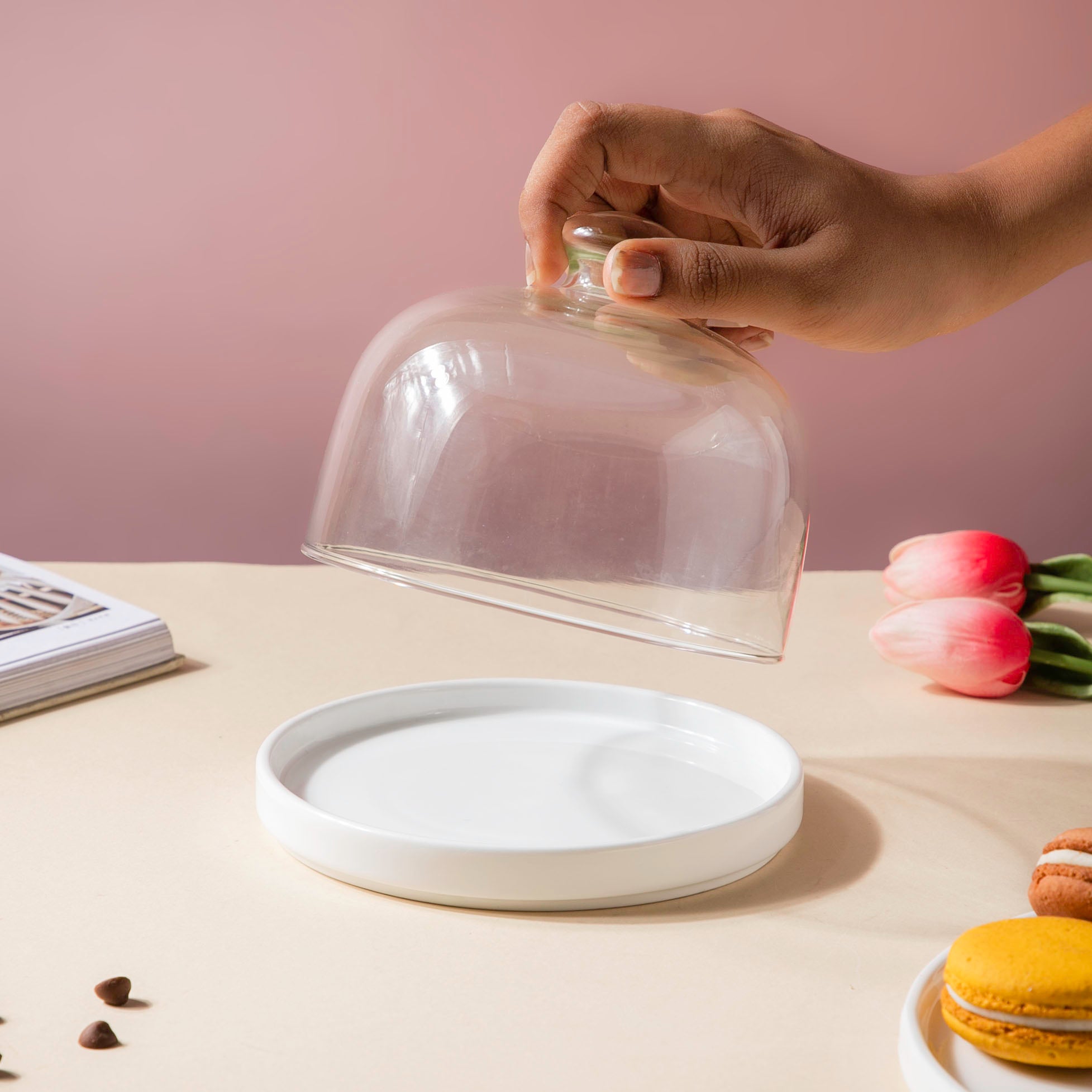 The stunning white pedestal features the 7.5-inch cake plate and offers as a delightful resting place for berries or sweet treats. The inner elements are kept fresh and secured by the dome on top. The serving set, which is superb in its simplicity and convenience, is ideal for presenting not just scrumptious cakes, chocolates, and pastries, but also nibbles and finger food for elegant, classy cocktail parties.