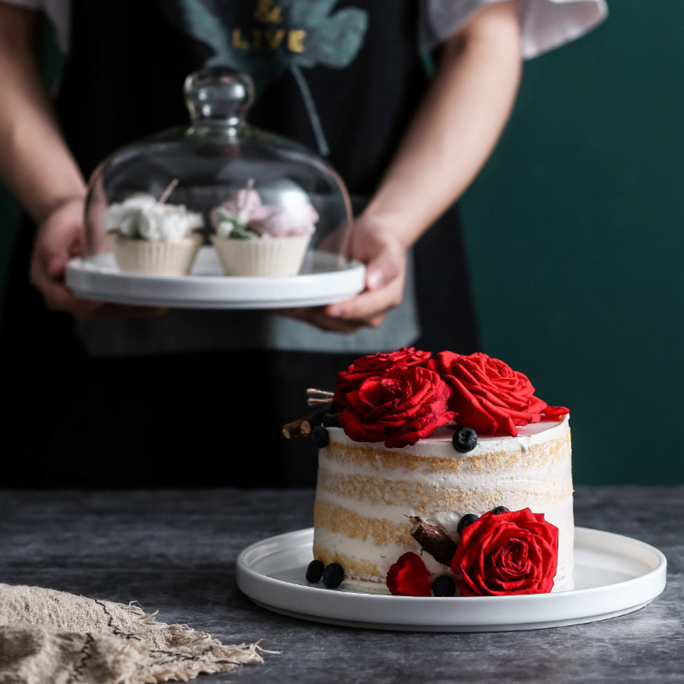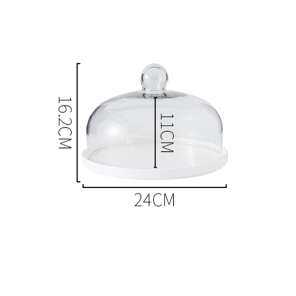 The cake stand with dome is a collection of a ceramic plate and a glass cloche which can be used to keep food warm and fresh. The plate is apt for being used as a tray, cheese board, or a fruit platter. The cake stand is an artistic spin on a traditional form that will elevate both appetizers and desserts to the status they deserve. The beautiful cake plate will look great on the dinner table or on the kitchen counter as a permanent collection. The cake plate can also be used to exhibit cupcakes, muffins, waffles, and croissants in a sweet way!