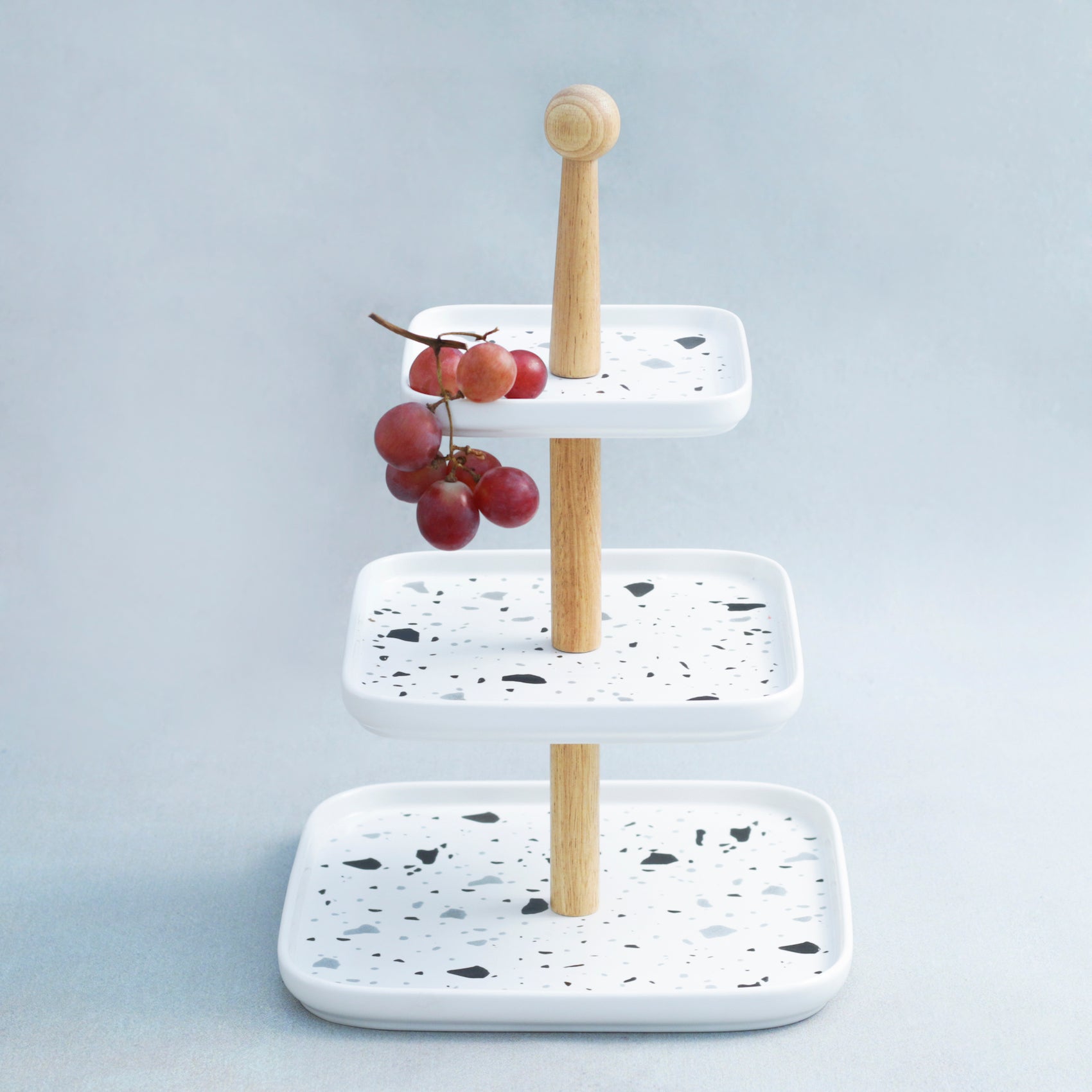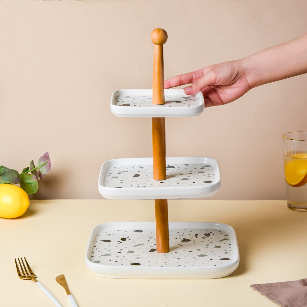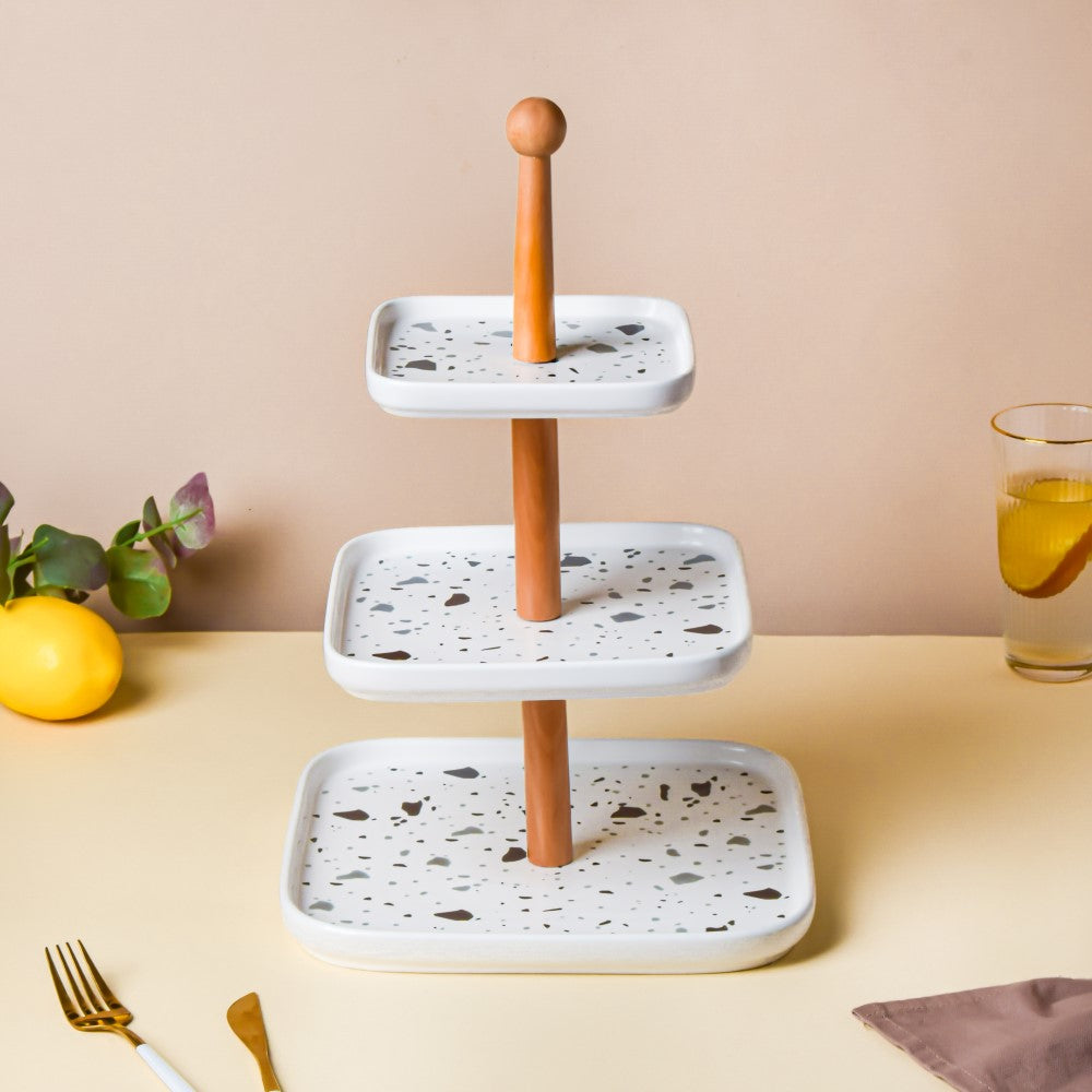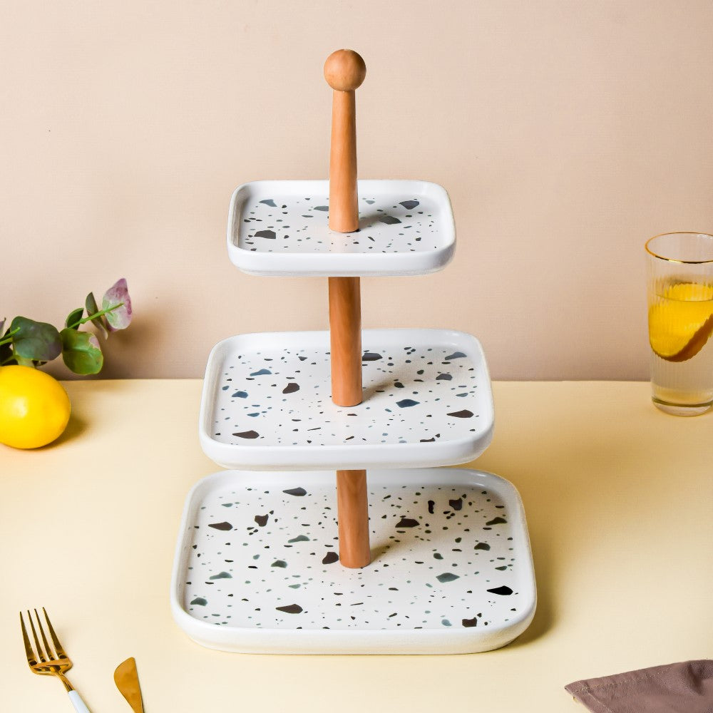 The terrazzo three-tier cake stand is a centerpiece decoration for all kinds of tables. The stand can be used as cupcake stands, cake stands, and fruit stands or can be used for displaying breakfast buns and loaves of bread. At home, the stand can be used for displaying various snacks and dips during a party. The three-tier stand gives height to a food display, making a table setting look organized. Only the plates can be placed in the microwave oven and dishwasher. Nestip: The three-tier cake stand can be used on the dressing table to store perfumes, jewellery, and knick-knacks.Size:Total height- 40cm Small plate- 15cm sideMedium plate- 20cm sideLarge plate- 25.5cm sideMaterial: Ceramic and woodColour: Black, white, and greyItem Included: 1 three tier-standStyle: SZT20J01