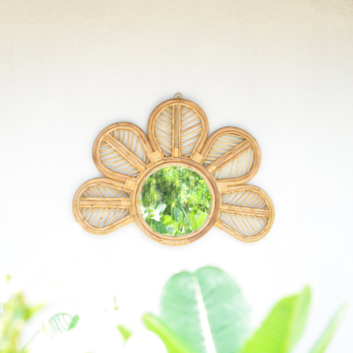 Mirrors are an essential part of wall decor at home. Featured here is a semi-floral rattan wall mirror. The artistic and unique design of the mirror makes it a good addition to all spaces. This can be used in the living room and entryway as a decor accent, in the dressing area and also in outdoor spaces.