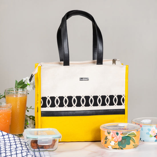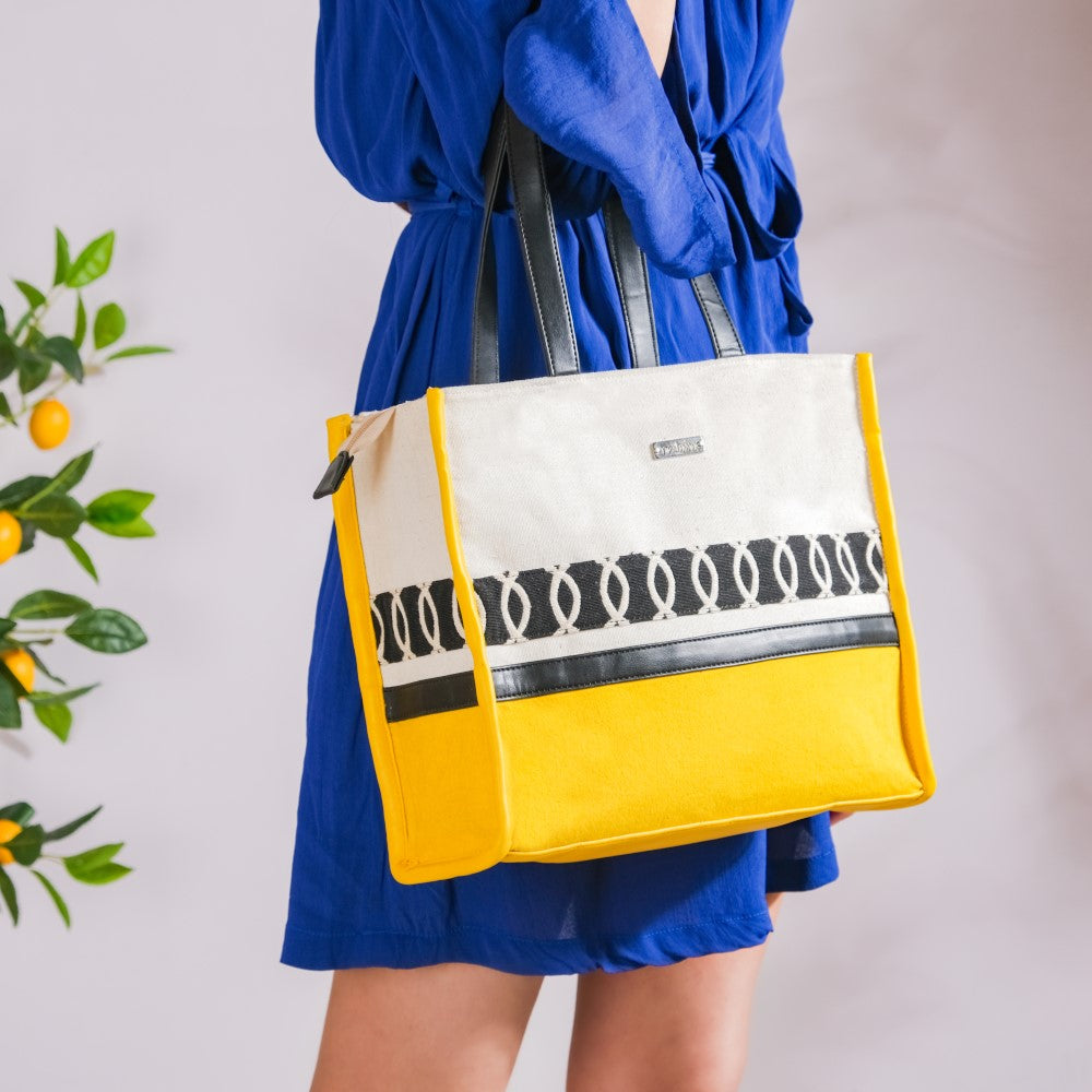With the help of this chic yellow and white tote bag, bring out your inner diva. Thanks to its handcrafted design from high-quality canvas material, this small canvas tote bag is the right combination of practicality and flair. Our tote bag's spacious interior, which also has a safe metal zipper mechanism, is perfect for storing your everyday essentials. This versatile tote bag will be your trustworthy travel companion whether you're going to work or on a vacation.