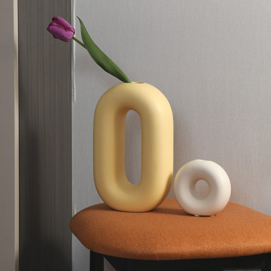 Crafted with meticulous artistry, this ceramic vase boasts a seamless fusion of form and function, transcending the boundaries of conventional decor. Behold the epitome of elegance and refinement embodied in our exquisite donut vase. The eccentric oval shape of the vase lends a sense of positivity and calm to the entire space. With its minimalistic design, the vase magnifies the elements of modern art. The splendour of this beautiful and elegant vase is that it is the perfect conversation starter for your family and friends.