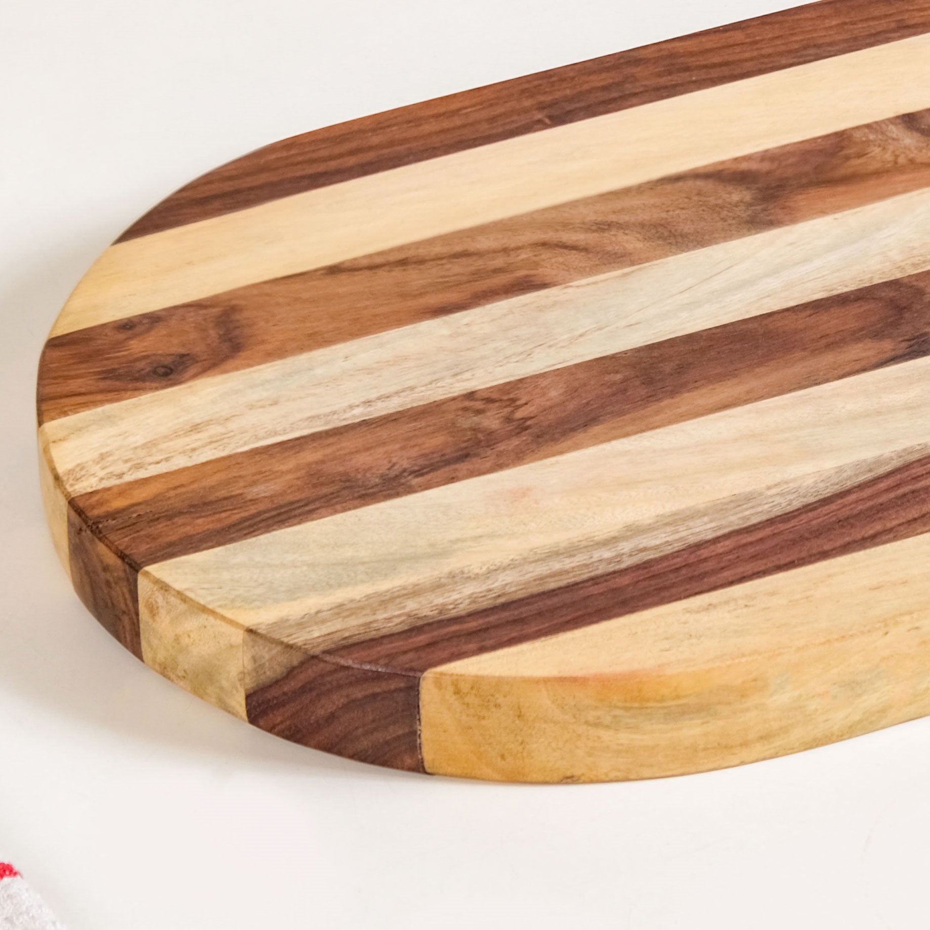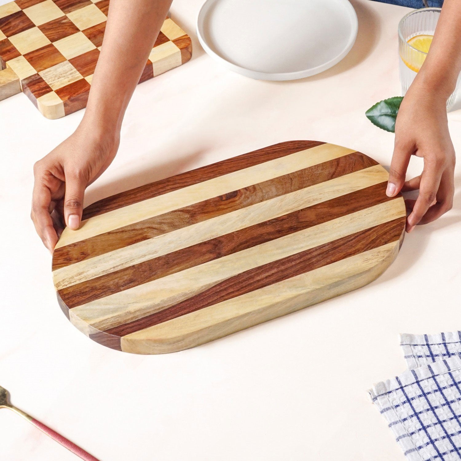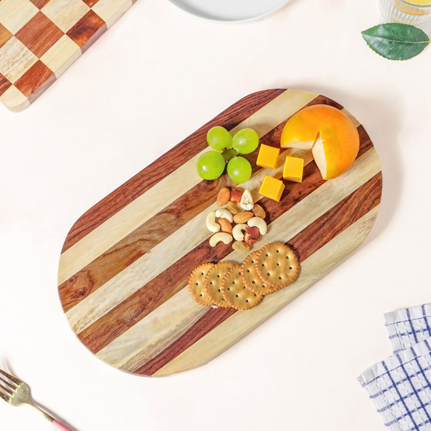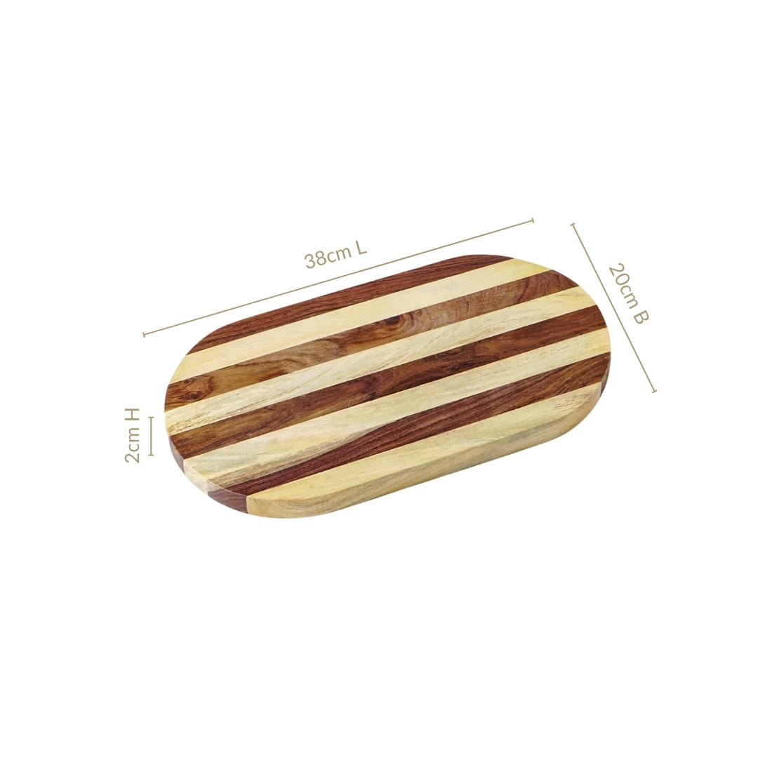 Design: Ideal for everyday dining or festive hosting, the platter doubles up as a cheese platter or appetiser tray. Designed with alternating light and dark wood strips, the platter reflects an elegant striped aesthetic. The rounded rectangular shape offers a contemporary yet rustic charm, while its polished finish highlights the earthy tones of Sheesham. Rich brown hues paired with golden streaks make this board an eye-catching centrepiece for every dining setup.