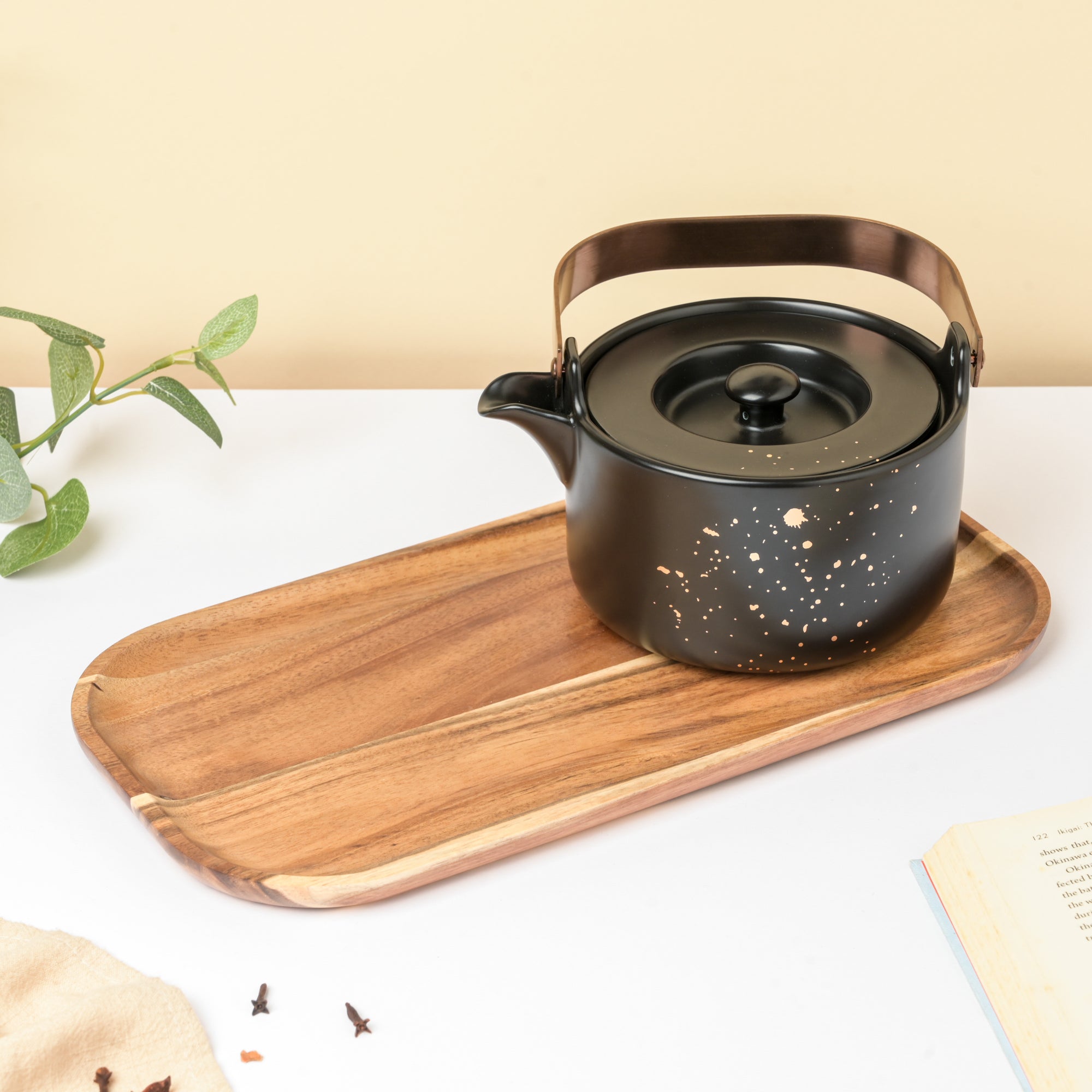 For those who consider teatime the best part of the day, the Cara black ceramic tea set is a must-have for them. The exquisite tea set with a teapot, 4 cups, and a wooden tray is adorned with a stylish and regal black colour, perfect for a formal or informal setting. The black color speckled with gold has a luxurious elegance and the metal handle adds a chic element to the set. The teacups are embellished with a golden rim near the round brim. The teapot has a little strainer, which will help you to serve tea without any hassle. The wooden tray completes the look and makes it easy to carry and serve. The ceramic tea set is so versatile that it can be given as a gift on any occasion- be it a festive occasion, anniversary, birthday, or housewarming.
