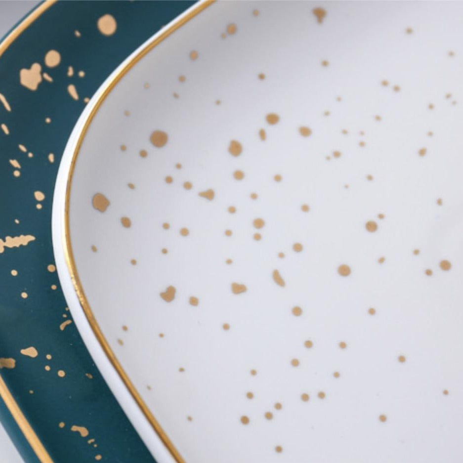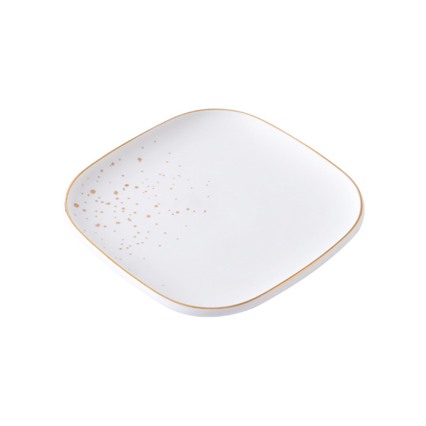 Round edged square Cara salad plate with luxe gold specs to serve salads, starters, desserts and more. The salad plate can be used as a snack plate or an appetizer plate to serve up some starters or buns. The ceramic plates can also be used as breakfast plates.