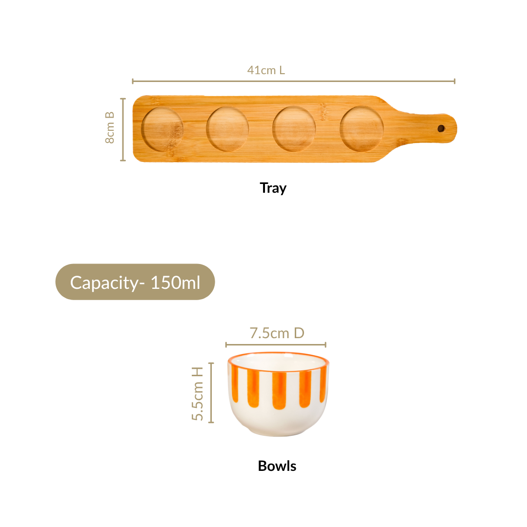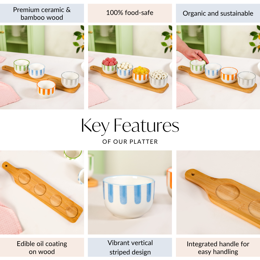 Design: The set features four small, round ceramic bowls, each showcasing a delightful, vibrant vertical striped design in four cheerful colours: blue, green, orange, and grey. The colourful stripes and matching rims contrast beautifully with the white base of the bowls and the light, natural tone of the bamboo serving tray. The tray is rectangular with rounded corners and an integrated handle, adding a rustic touch to the bowls' playful design. The bowls rest snugly on the slots of the bamboo tray.