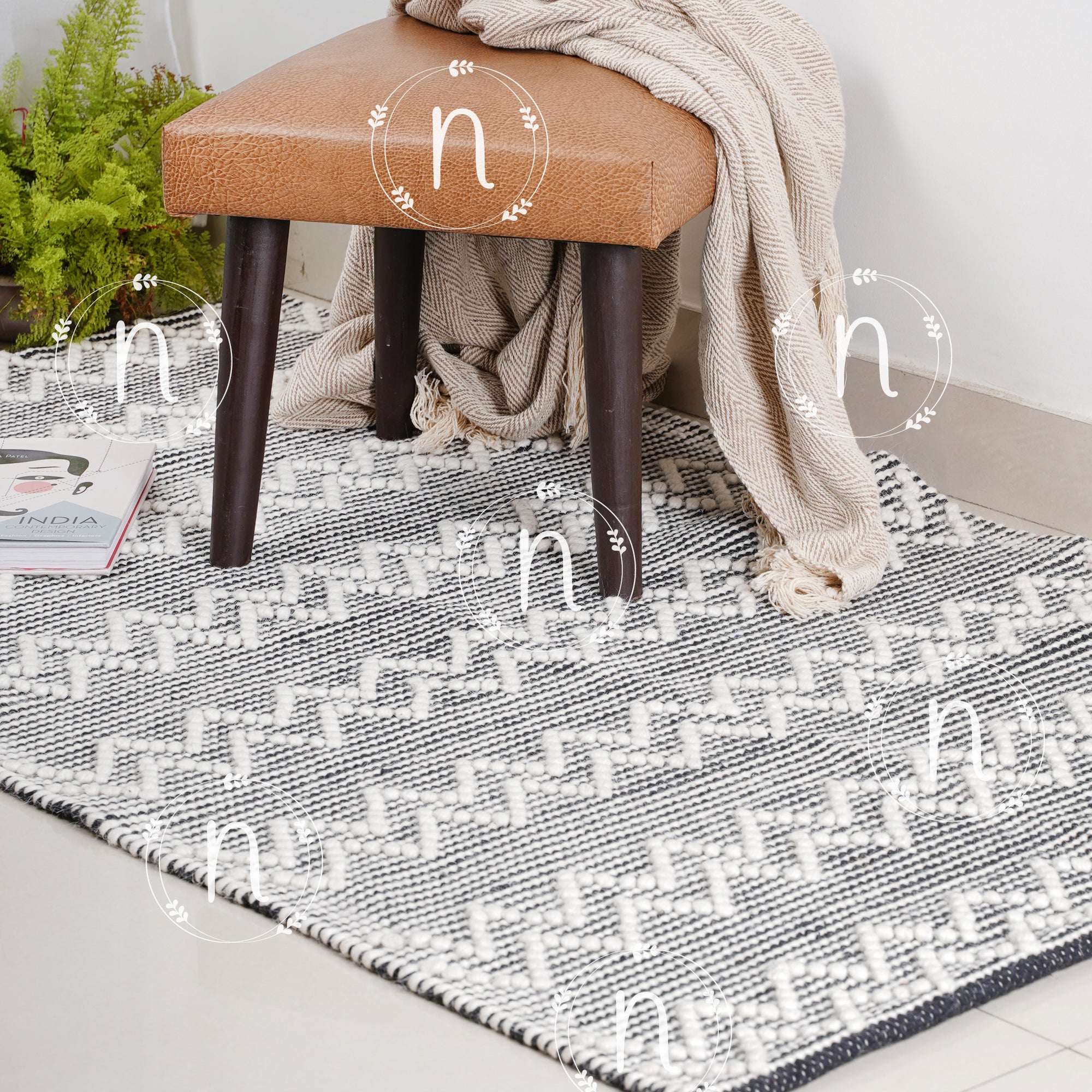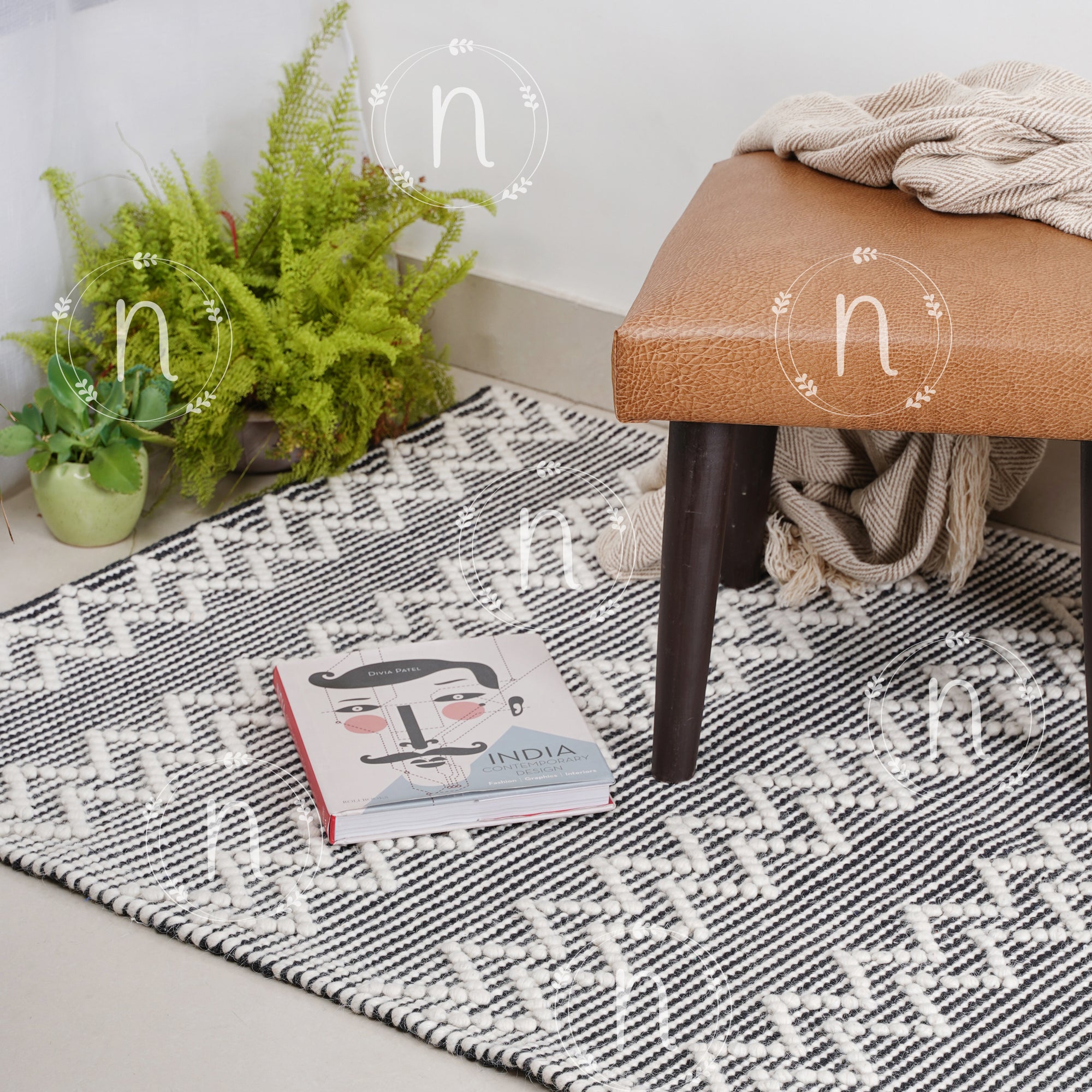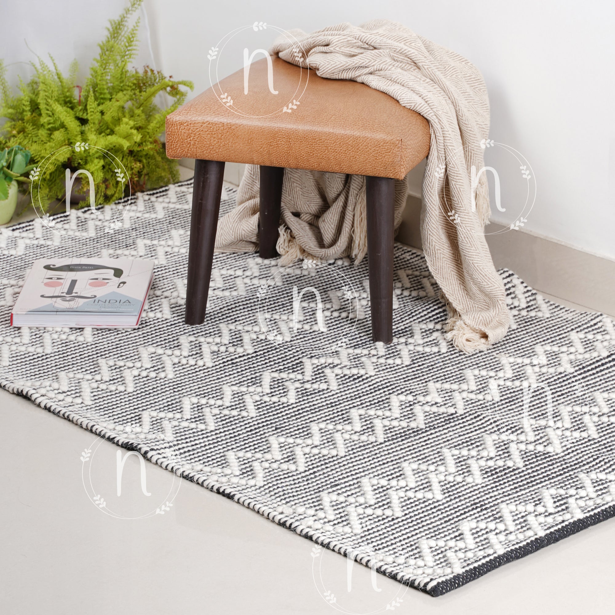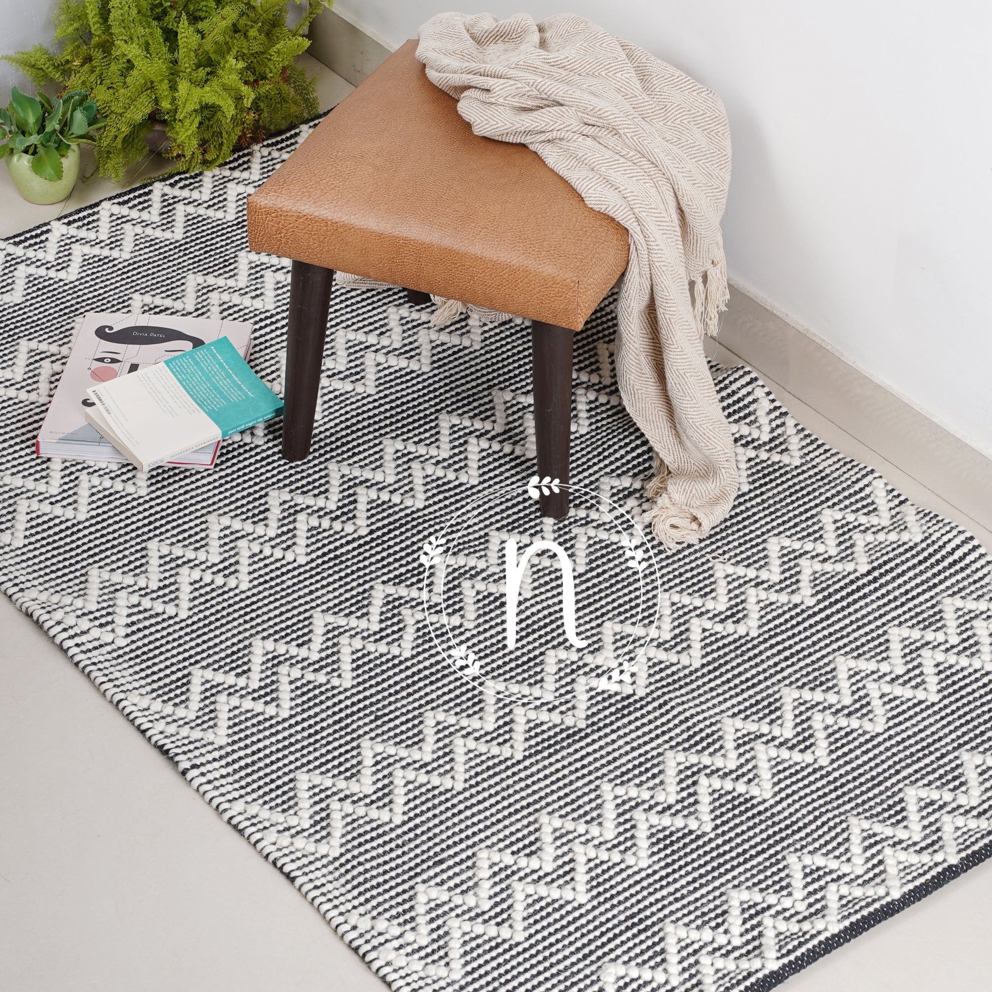 Wool and cotton handwoven rug with geometric and jagged motifs to liven up the space. The rug has a pleasing black and white colour scheme and is composed of soft fibres with chevron and zig zag prints, adding a sophisticated touch to the area. It can be used as an area rug in the living room or dining space area.