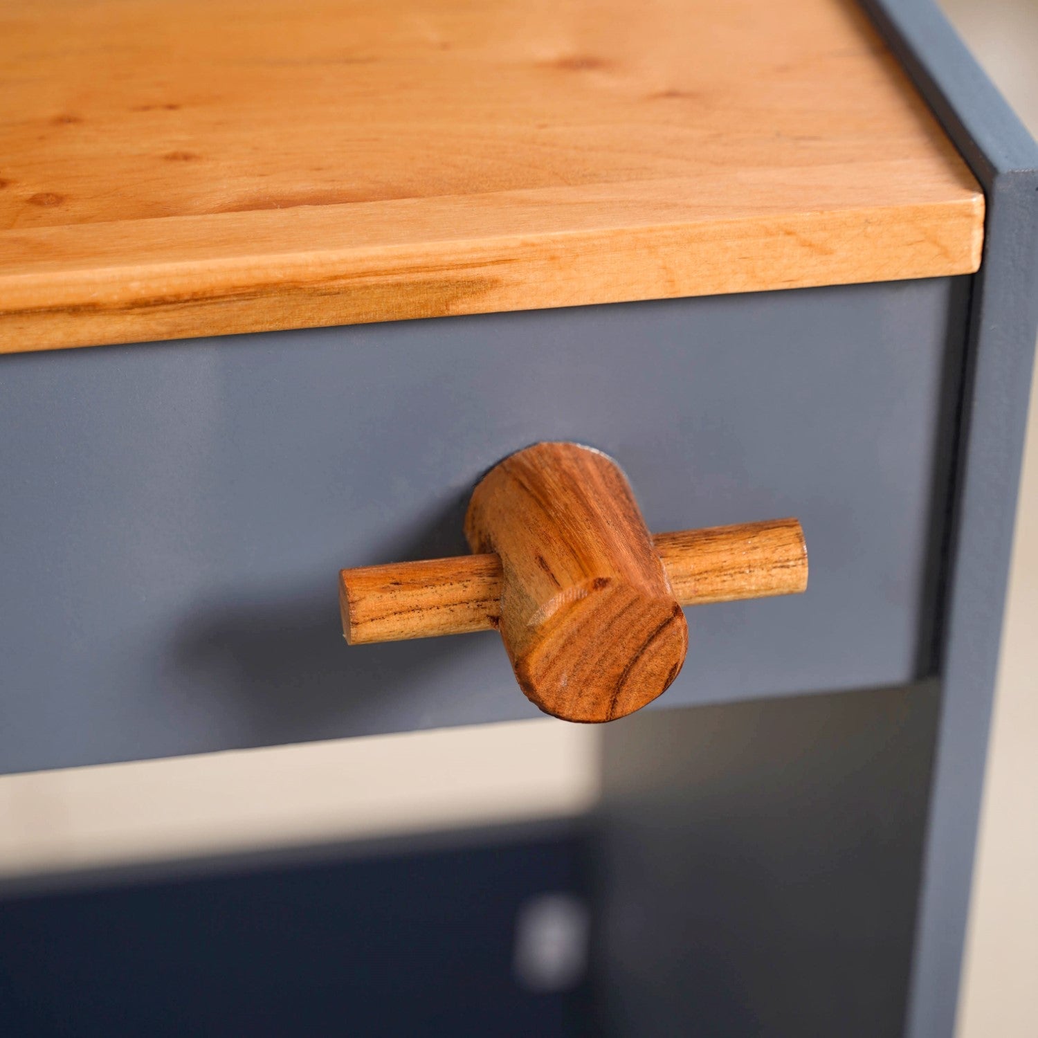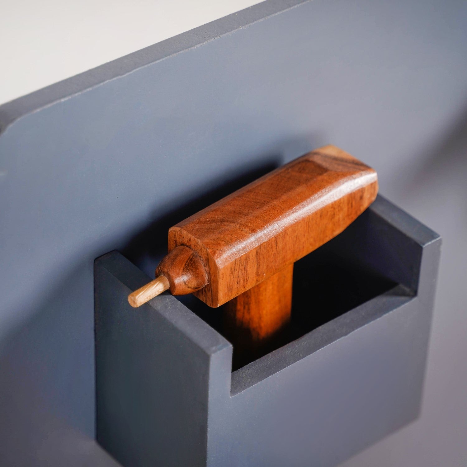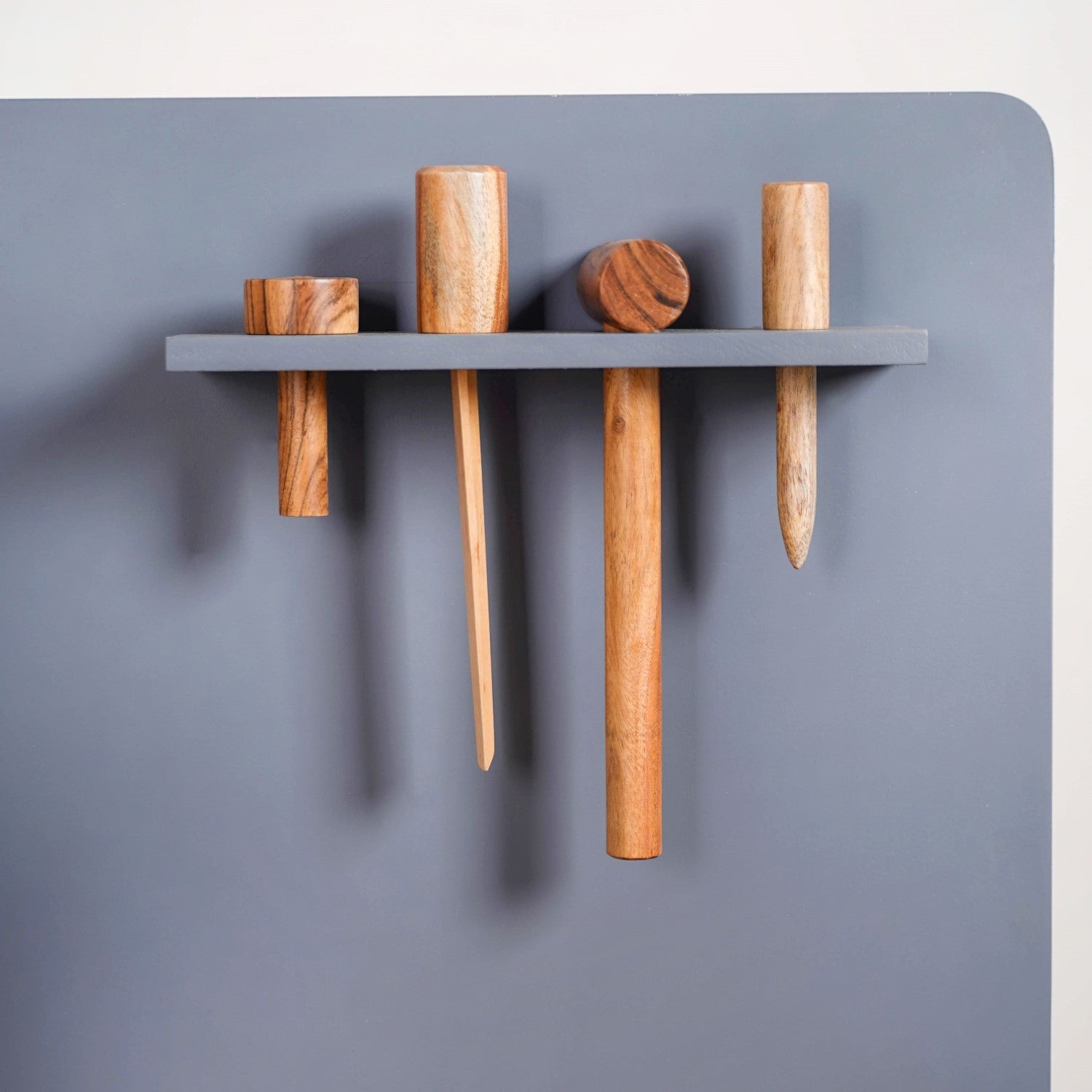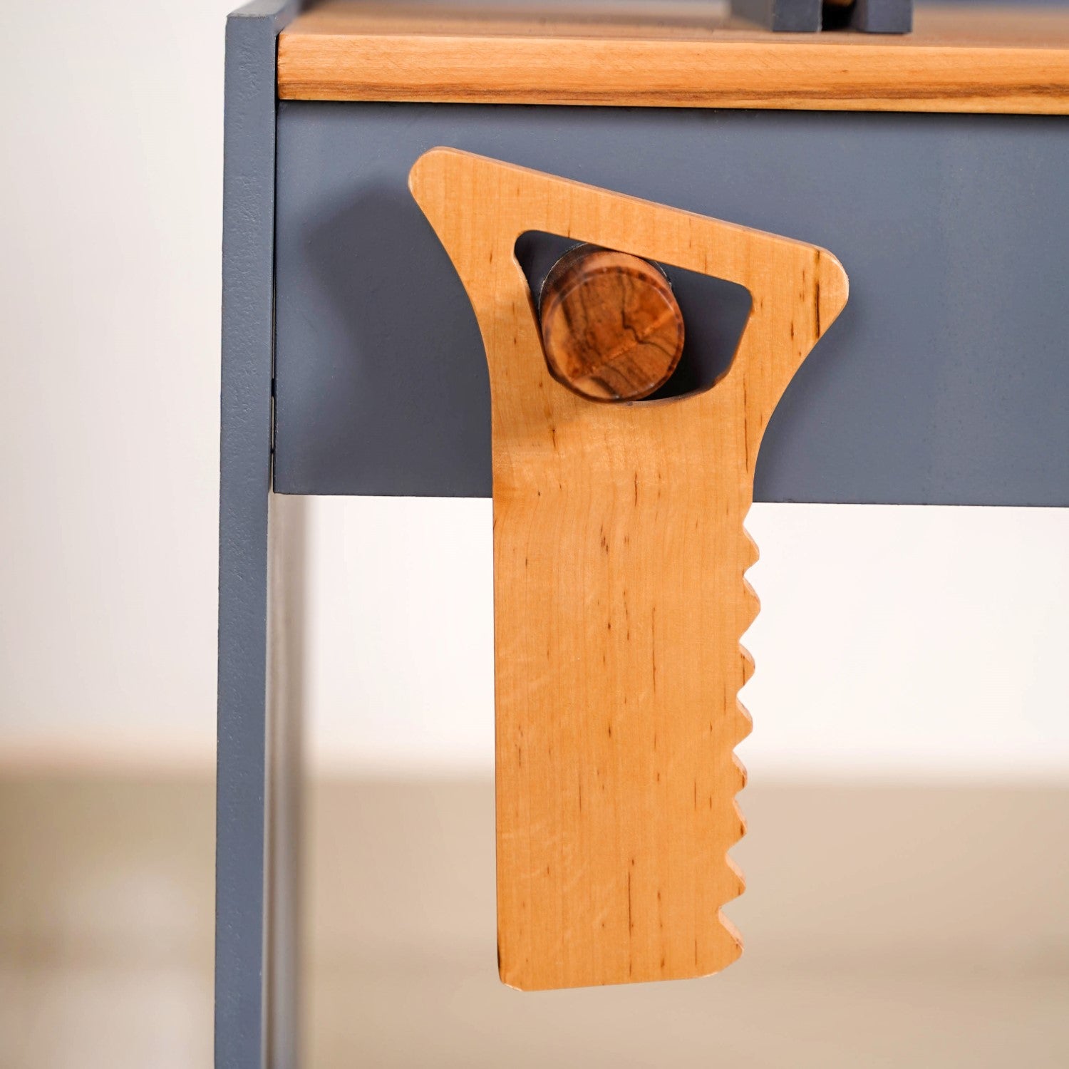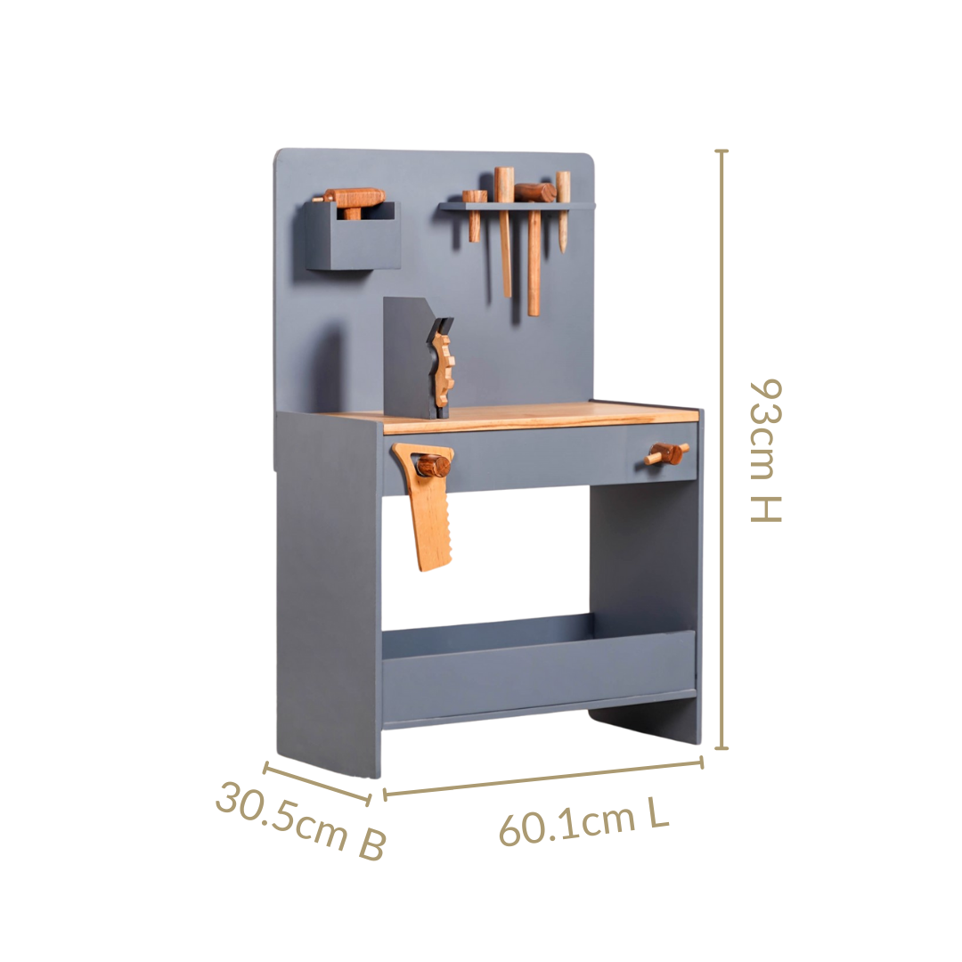 Encourage your child’s imagination and hands-on creativity with this realistic kids carpenter set, designed to spark hours of pretend play. Crafted with durable MDF and acacia wood, this wooden tool set offers a safe yet authentic play experience for your little builder. The natural wood finish adds a timeless touch to the design, featuring essential tools such as a saw, hammer, drill, screwdriver, chisel, and a nail, perfectly sized for tiny hands. A pretend machine saw and clamp add to the realism, while the desk area provides a spacious surface for all the action. Finished in a soft steel blue colour, the carpenter's workspace is complemented by a neutral beige base, making it a stylish addition to any playroom.