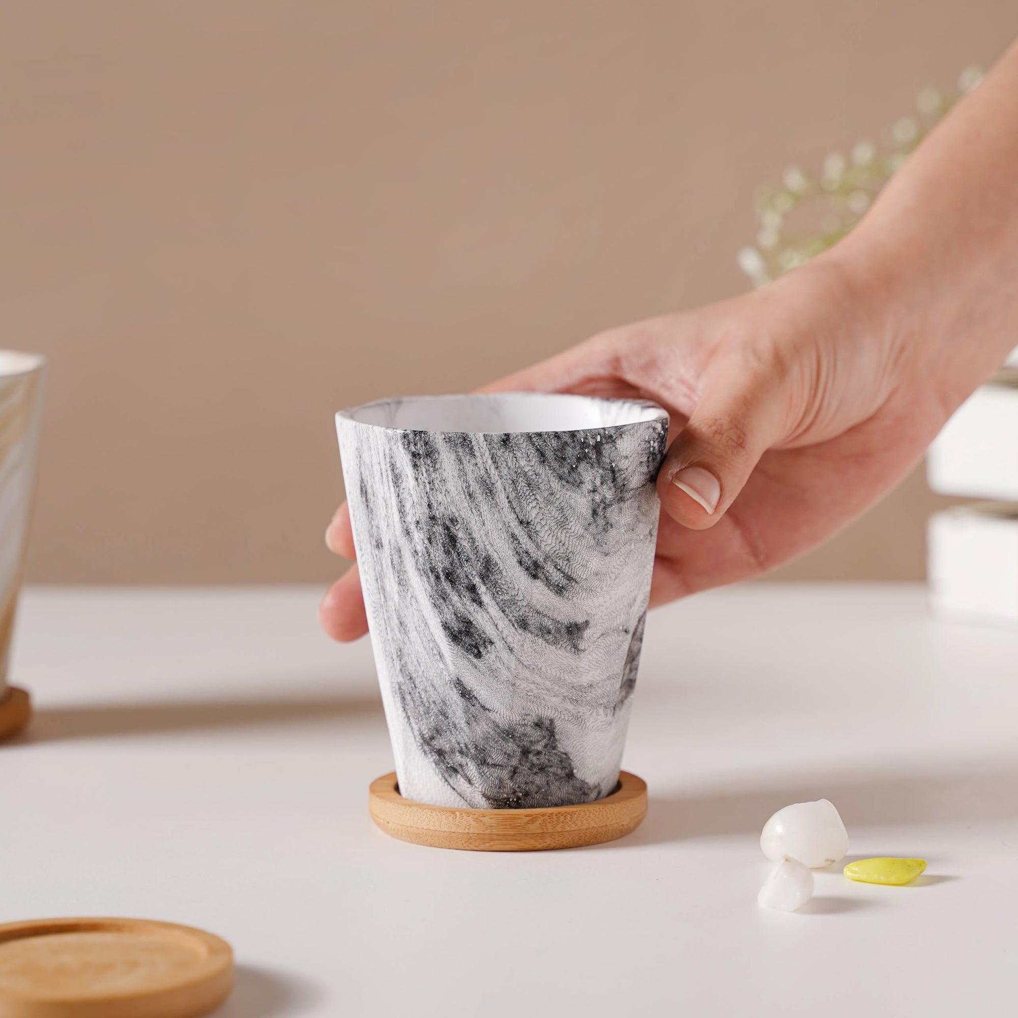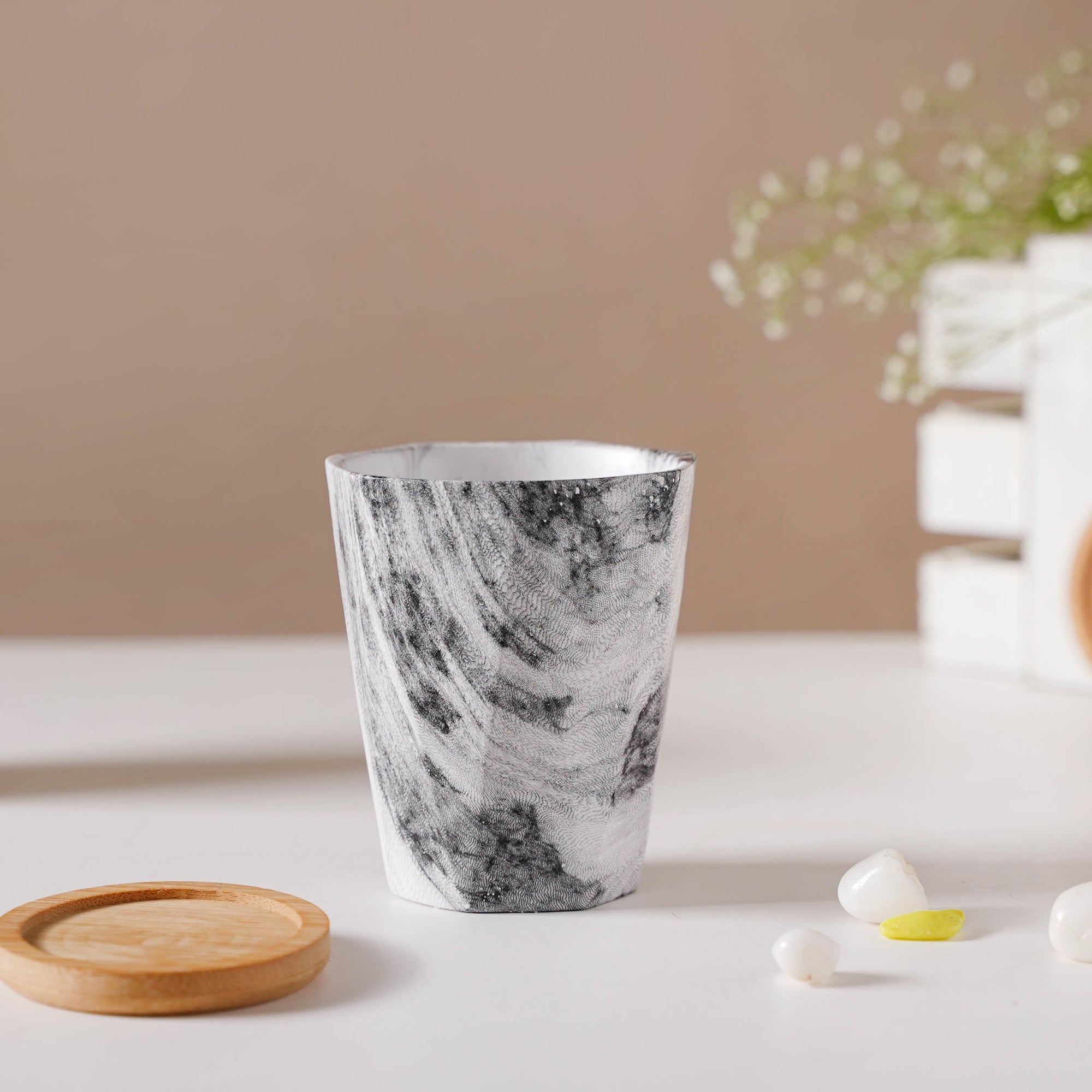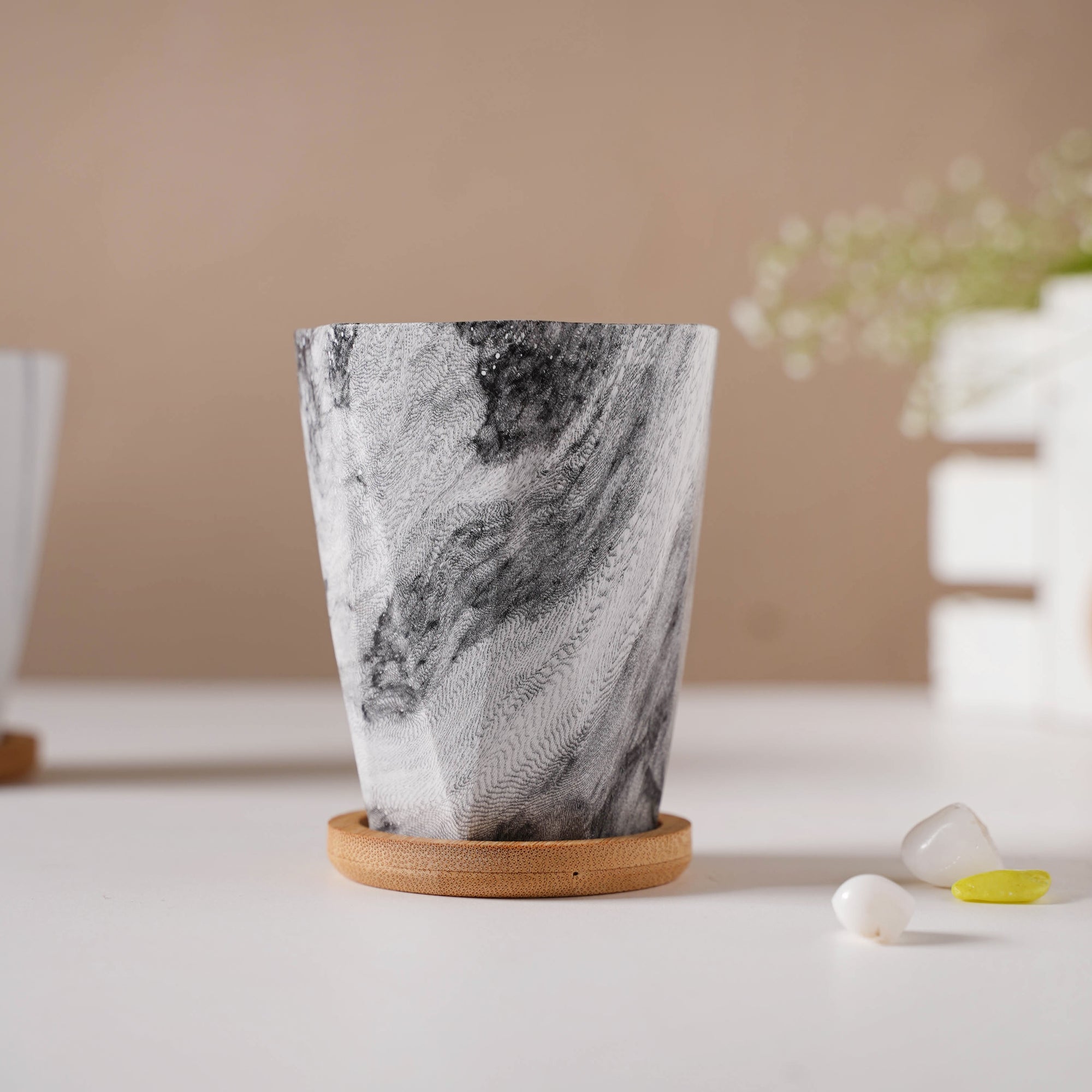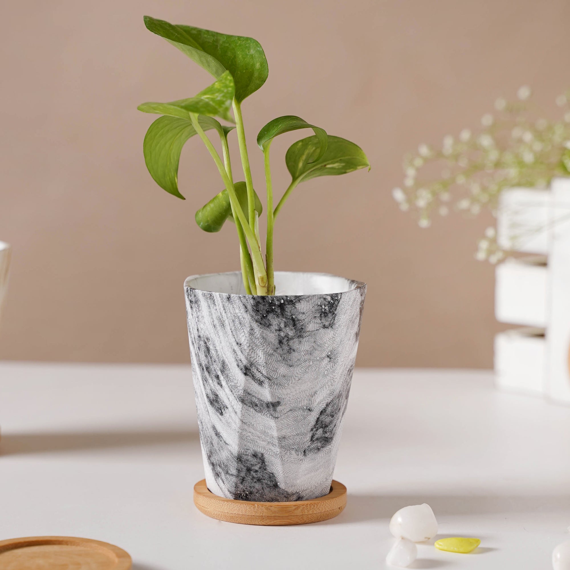 The charcoal grey planter exudes a regal vibe with a patterned surface that almost seems to be carved out of stone. The textured ceramic planter has an outlet at the base to let the excess water out, ensuring that greens receive the optimum amount of water. The planter comprises a wooden coaster to ensure that there is no spillage of the water onto the floor or the table where the planter has been kept.