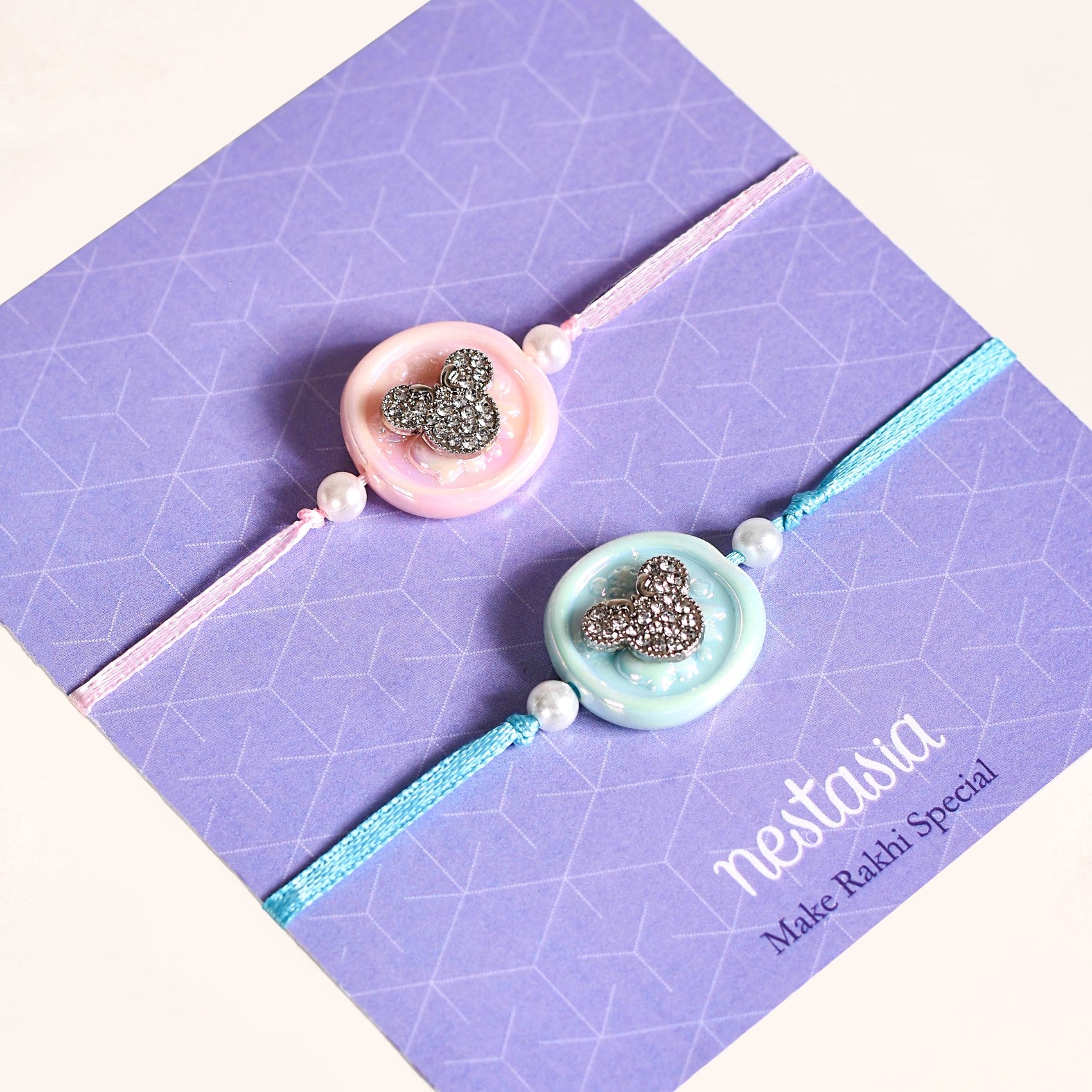 This stunning gift hamper houses a set of 2 Rakhis, one in a soft baby blue hue with a cute glossy charm that features an embossed bunny on one side, a crystal-studded Mini Mouse on the other side, and pearl embellishments. The other boasts a pretty pink hue, faux pearls, and a sparkly stone Mini Mouse. Complemented by a reusable roli-chawal set, a wish card, and a pack of dry fruits to make the little ones beam with joy, this lovely gift box is a great way to spoil your adorable siblings.