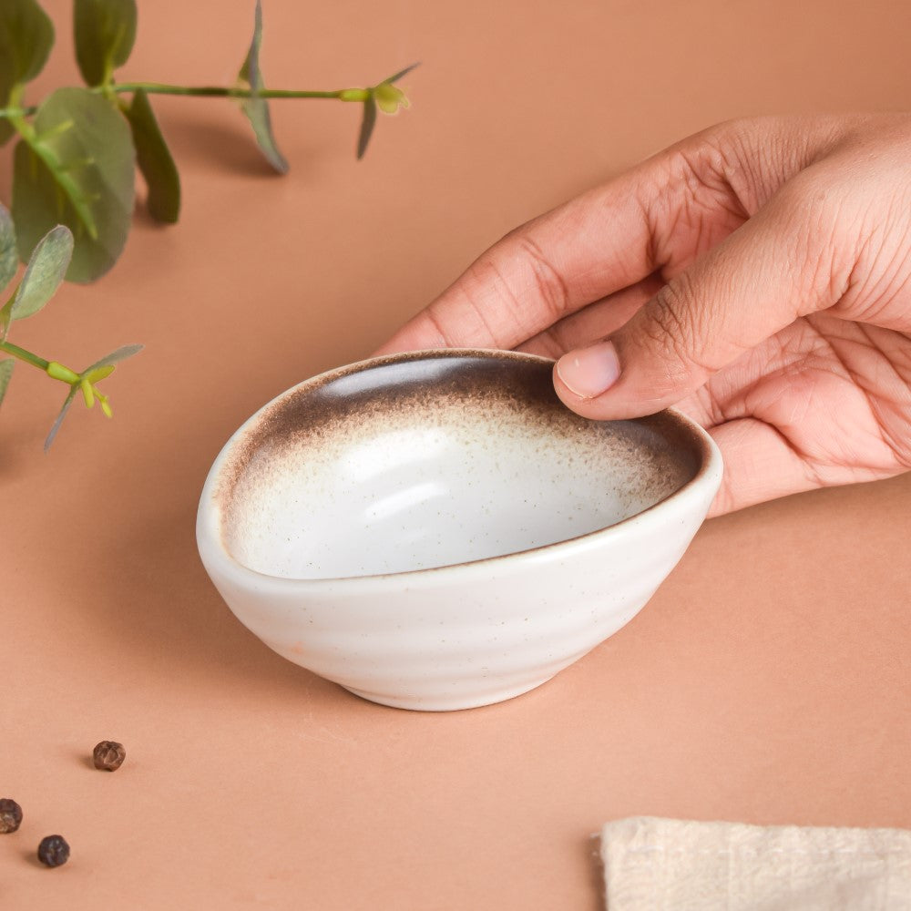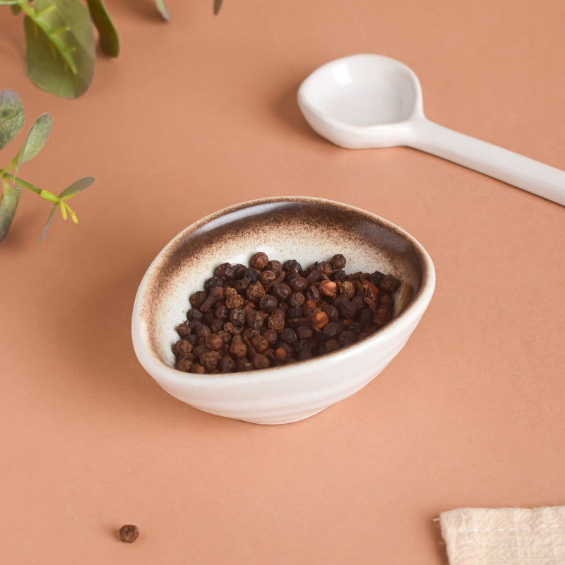 The food-grade ceramic molded dip bowl is sure to be an exception in the existing ceramic cupboard. The seashell-shaped clay craft dip bowl is stunning on the outer surface and filled with utility. The spray painted dip bowl can be gifted at housewarming parties or as a Diwali gift when paired with other bowls and plates. Nestip: The dip bowl can be paired with other dip bowls of Nestasia. Size: 10cm L x 8cm W x 4cm H Capacity: 50ml Colour: White, brown Material: Ceramic Products included: 1 dip bowl Style: DBAC110T199