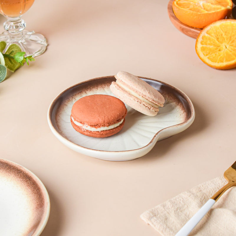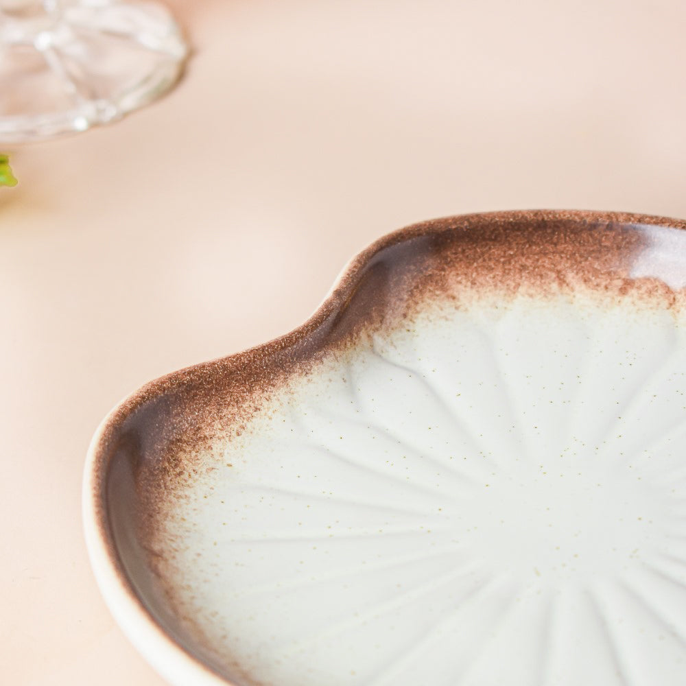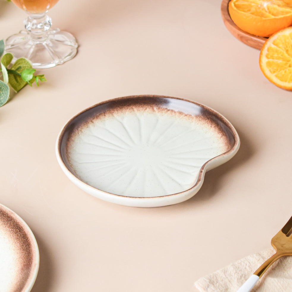 The handcrafted rustic ceramic stoneware small leaf plate features a glossy finish and textured surface. With an abstract shape and unique speckled patterns, the gradient clay plate features a unique form to grace the table with elegance. Serve delicious desserts or evening munchies such as sushi or sashimi on the ceramic plate. Nestip: The small plate may be used as a saucer for a teacup. Size: 13cm D x 2cm H Colour: White, brown Material: Ceramic Products included: 1 plate Style: DBAC110T55