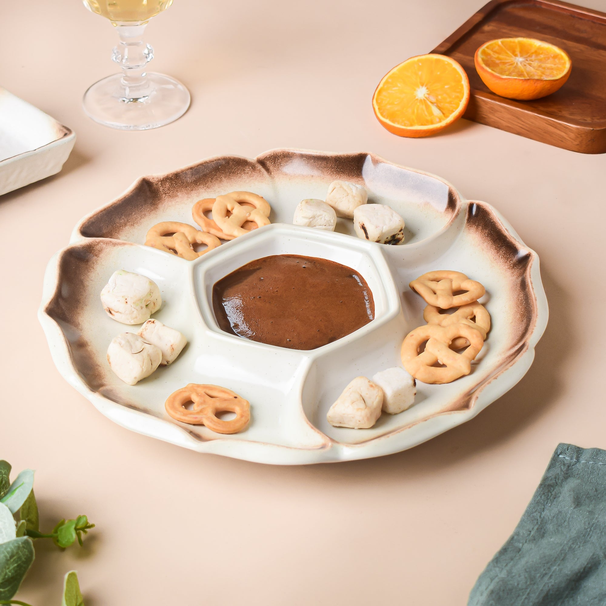Featuring the shape of a beautiful blooming flower, the hand-crafted sectioned plate is the ideal accessory to amp up snack time. The plate features 4 slots in total, including 1 slot at the centre for placing dips or chutneys of choice, while the 3 slots surrounding the rim may be used for placing the fries and fritters. Not only is the earthen snack plate the perfect buddy for evening get-togethers, but it also features a sturdy form and a stark white plate, along with an ombre-inspired burnt brown colour at the rim.