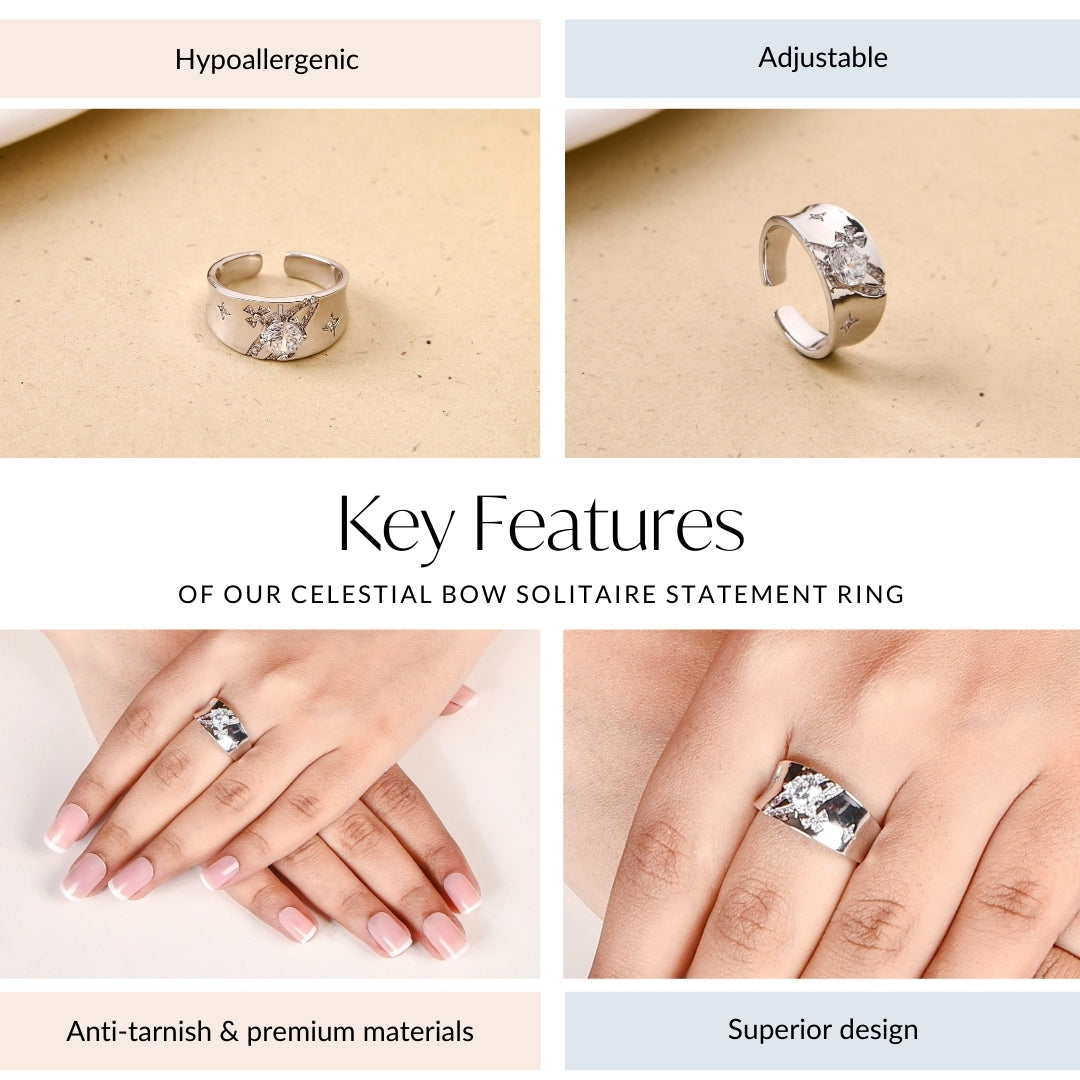 A radiant blend of celestial charm and vintage elegance, this silver-toned adjustable ring features a wide band adorned with delicate star and bow motifs, each encrusted with shimmering stones. At its heart, a brilliant round-cut solitaire rests in a regal crown setting, adding a touch of timeless sophistication. Inspired by celestial beauty and vintage charm, the intricate details mirror the twinkling night sky and the grace of classic heirlooms. Designed for both comfort and versatility, the adjustable fit ensures effortless wear, making it a perfect blend of refinement and modern allure.