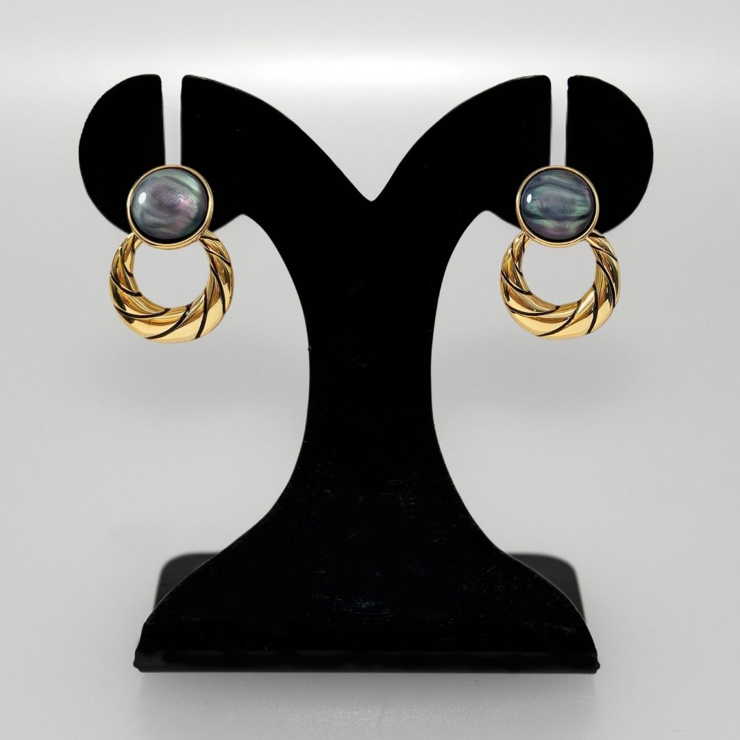 Catch the light with every move with these gorgeous dangler earrings, featuring a gold-plated metal hoop dangling from a dark grey round faux opal with an iridescent finish. The shimmery finish reflects a beautiful array of colours, adding an elegant touch to your look. Inspired by the natural beauty of the opal gemstone, the earring design captures its enchanting play of light and rich tonal hues. Perfect for adding a sophisticated flair to both casual and formal outfits, these hoop danglers bring timeless style and subtle glamour to any occasion.