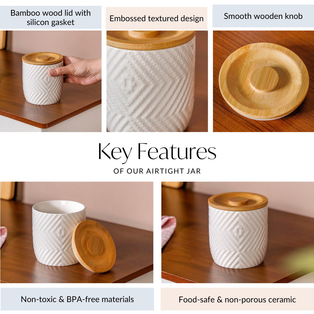 Design: This cylindrical storage jar is made from thick, durable ceramic with a glossy finish and a white embossed diamond texture. It’s paired with an airtight bamboo lid featuring a centred knob for a clean, cohesive look.