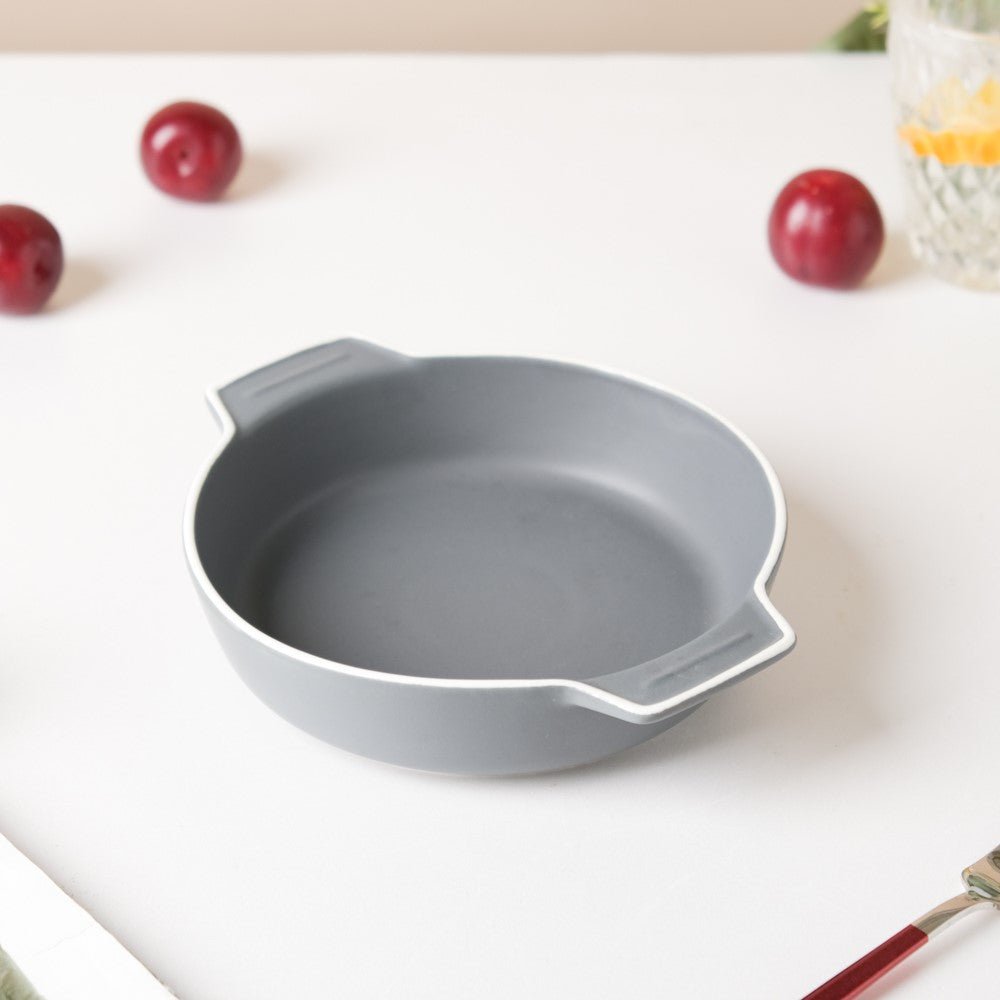 The baking pan with handle features a sleek grey colour. The handles of the baking dish make it easy to pick and place. The baking bowl is oven and microwave safe, hence can be used for baking as well as reheating food items. From baking cakes to grilling different types of meat and veggies everything is possible with the baking bowl.