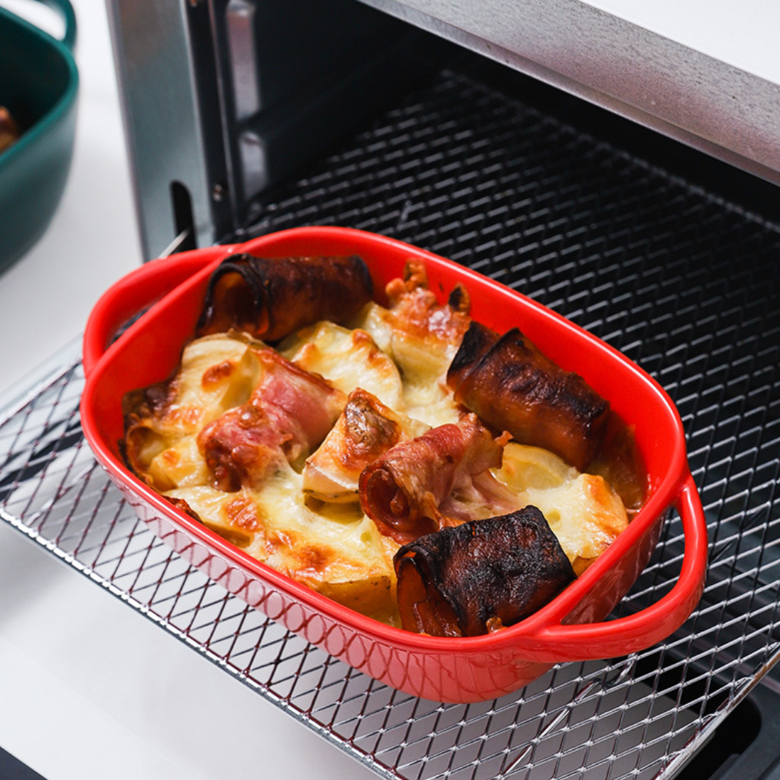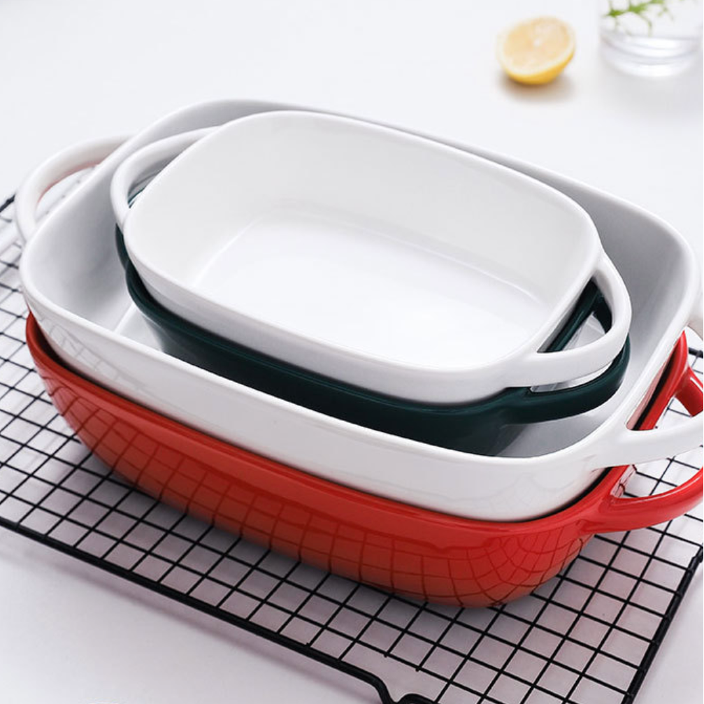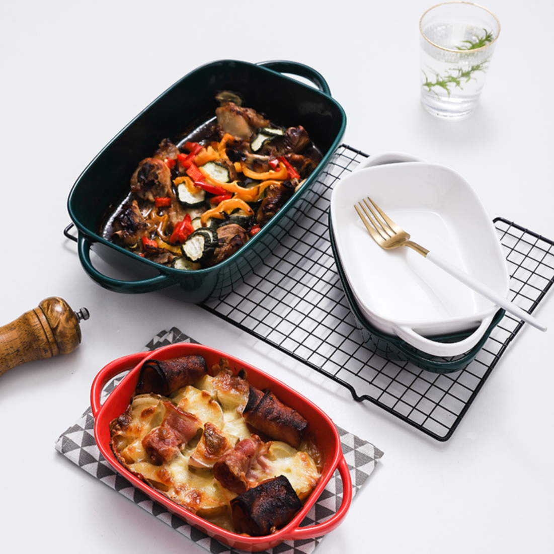 A single tone ceramic baking dish with two handles in red and dark green. The tray can be used for baking pastas and cakes or for grilling vegetables. The single tone of the dishes can make a meal look sumptuous whereas the handles make it convenient to use.