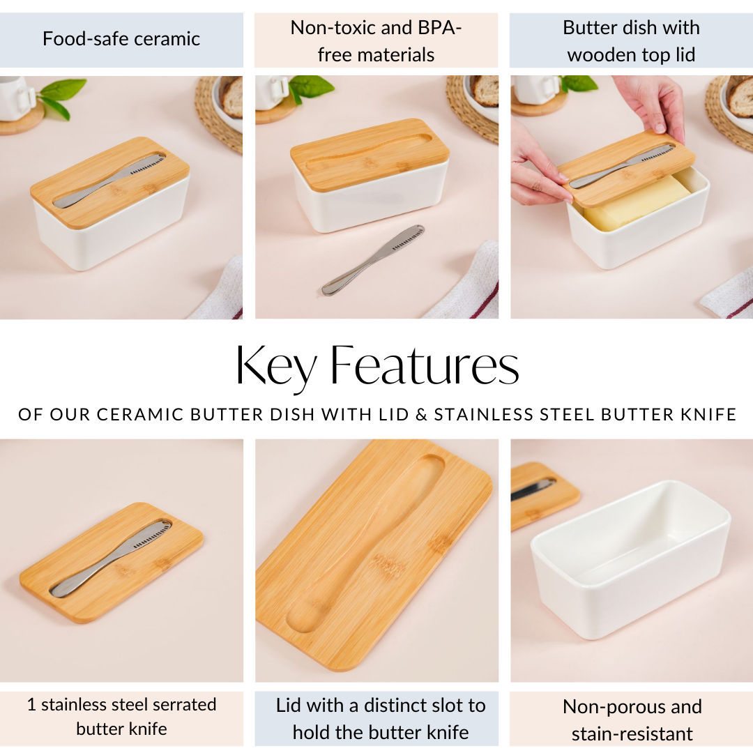 Benefits: Made from international food-grade ceramic, the butter dish is non-toxic and BPA-free, ensuring a safe and healthy choice for your kitchen. The wooden lid and stainless steel butter knife are chosen for their durability and high-quality finish.