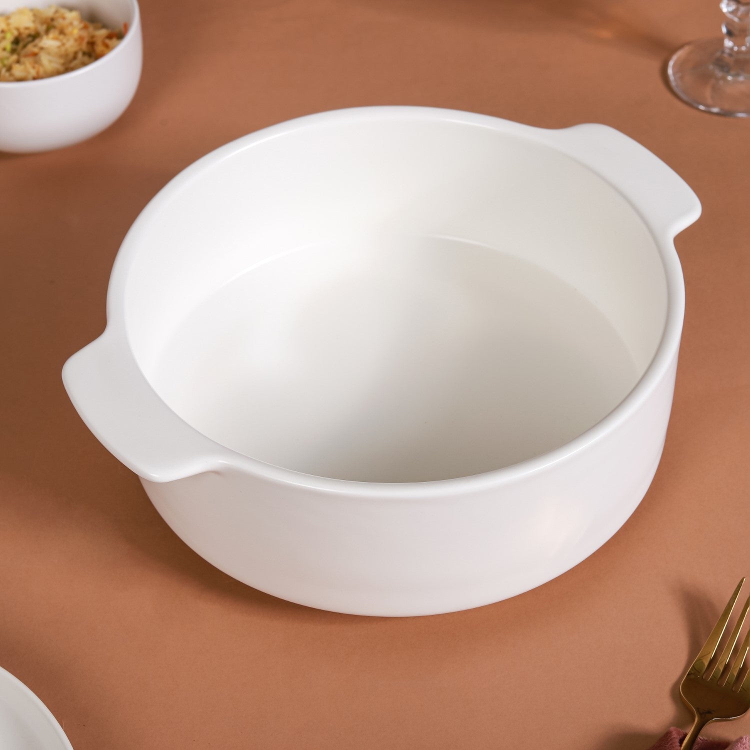 The ceramic baking bowl with a handle features a matte finish and a sturdy ceramic build. The bowl is ideal for being used as bakeware for making one-pot dishes like pasta, soup, and vegetable curry. The stark white colour of the bowl makes for a minimalistic addition to one's crockery collection.