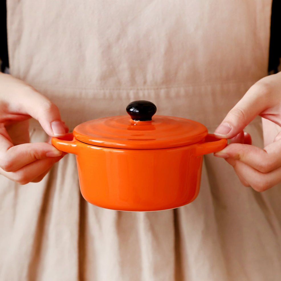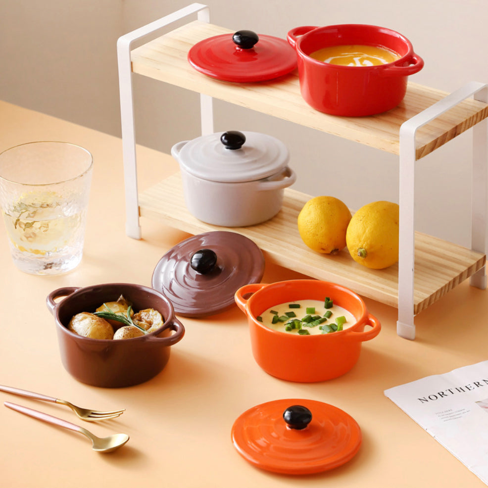 Ceramic casseroles with lid are small food bowls which can be used for individual servings of different food items. The bowls come with a lid which can keep the food hot and fresh for a longer time. The handles on each side of the food bowl, makes it easy for it to pick, place, and pass on a dining table. The bowl can be used as a snack bowl, pasta bowl, soup bowl, noodle bowl, or a fruit bowl.