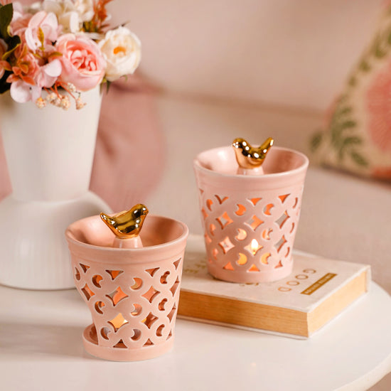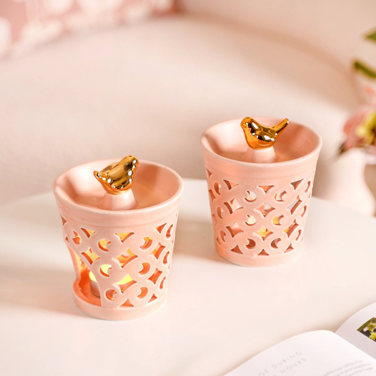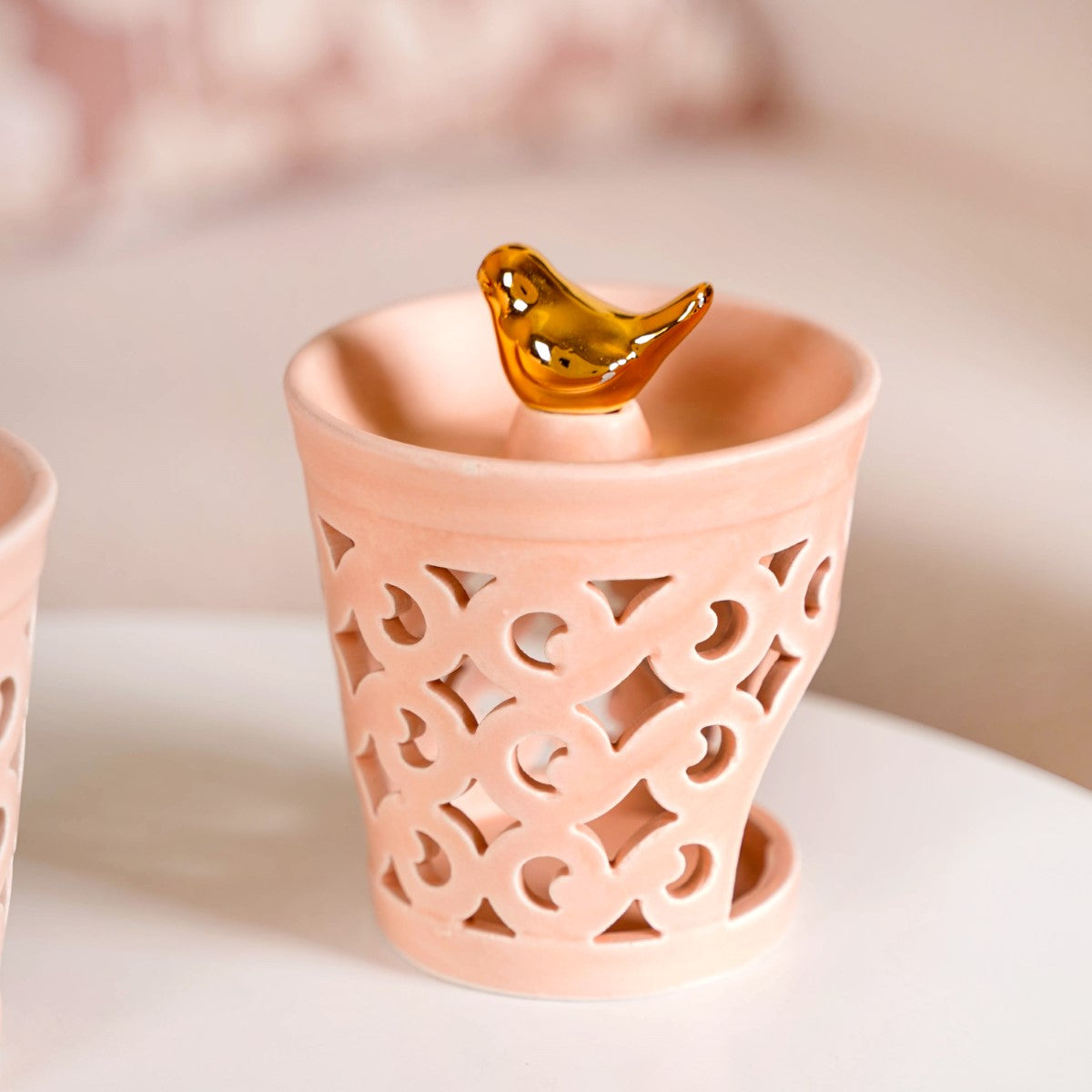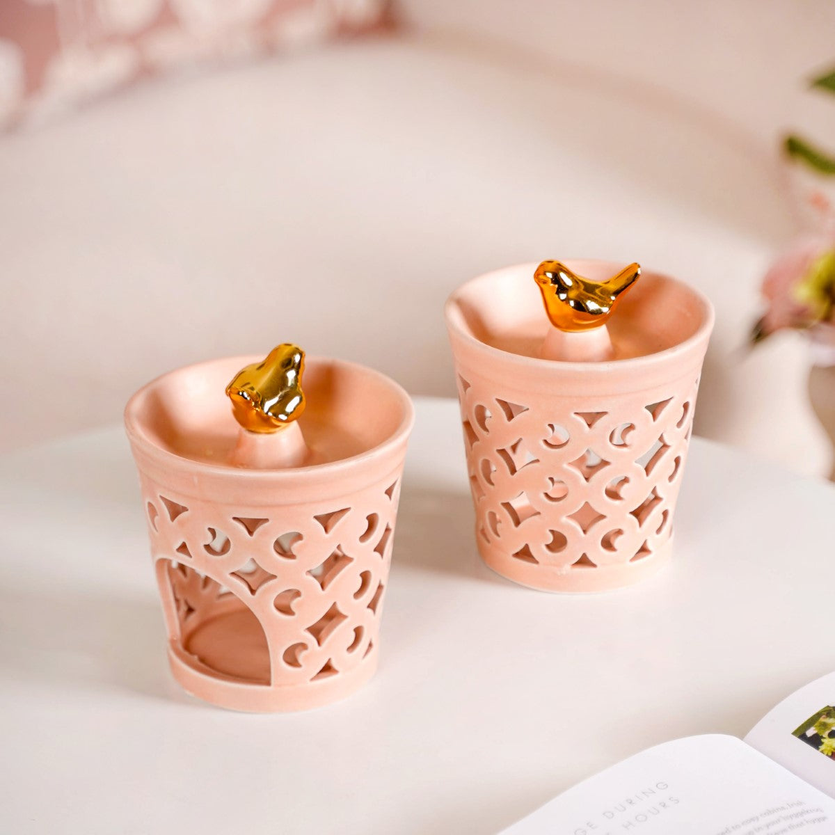 Elevate your festive ambiance with our exquisite lantern set, presenting two impeccably crafted ceramic lamp holders in a uniform design. Intricate cut-work details enrich the space, complemented by a charming golden bird atop the lids. Perfect for displaying tealights and diyas, these candle holders emanate a warm and inviting radiance. Whether it's Diwali, a special celebration, or any occasion, they infuse your space with timeless, captivating charm.