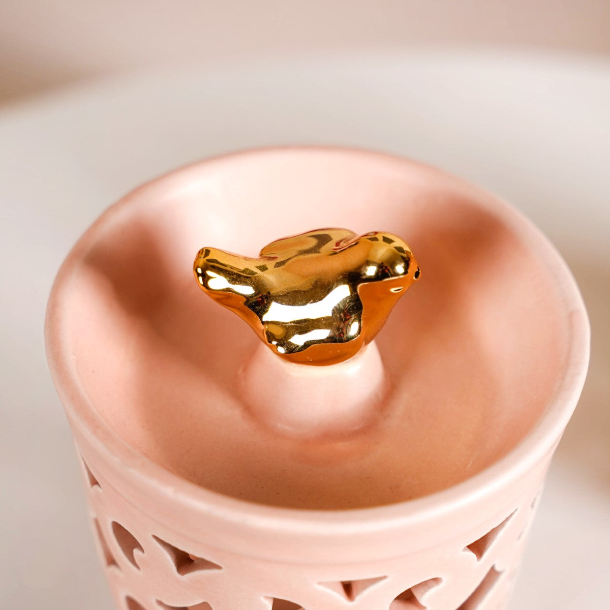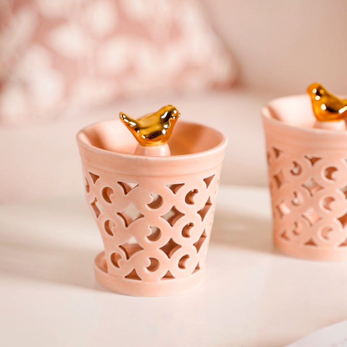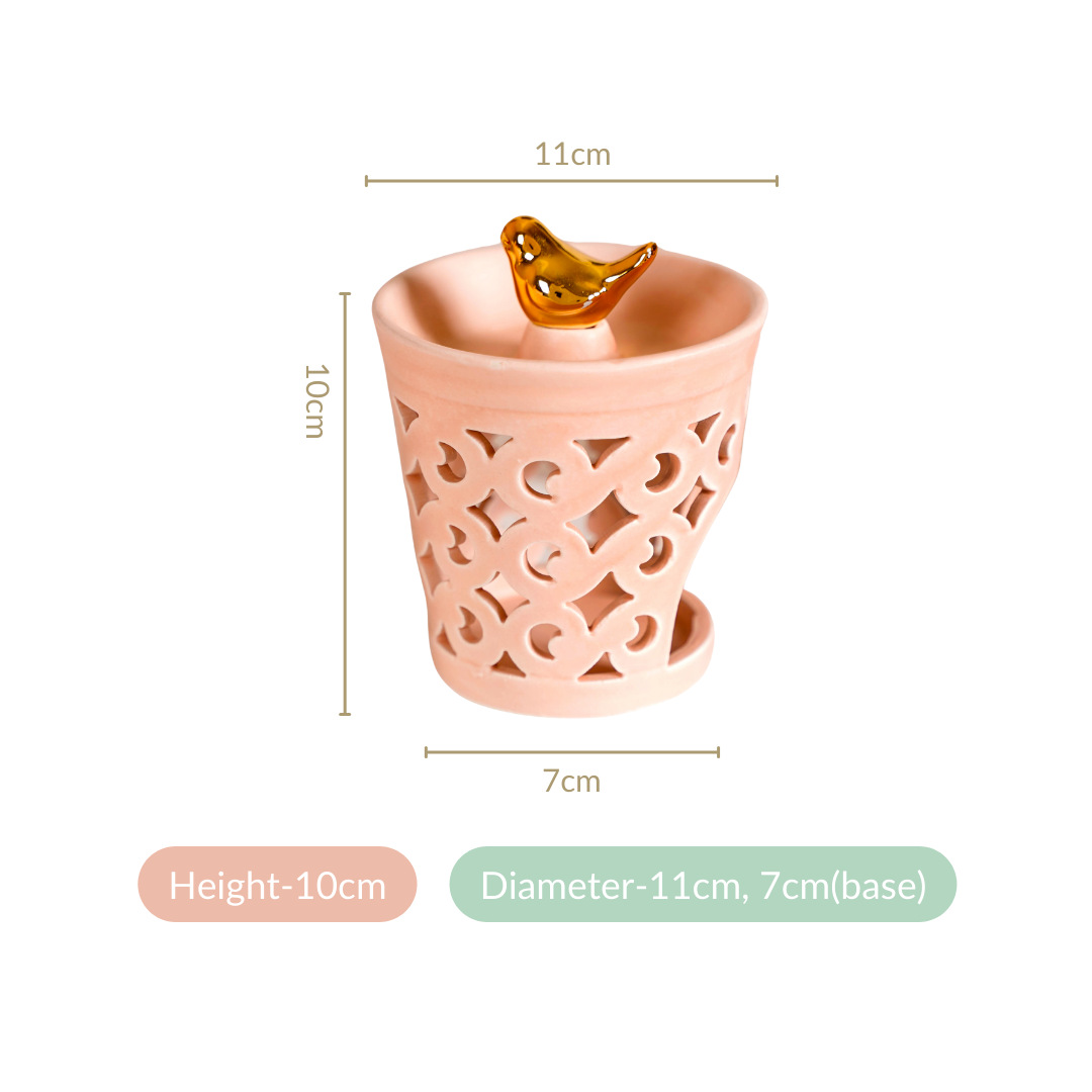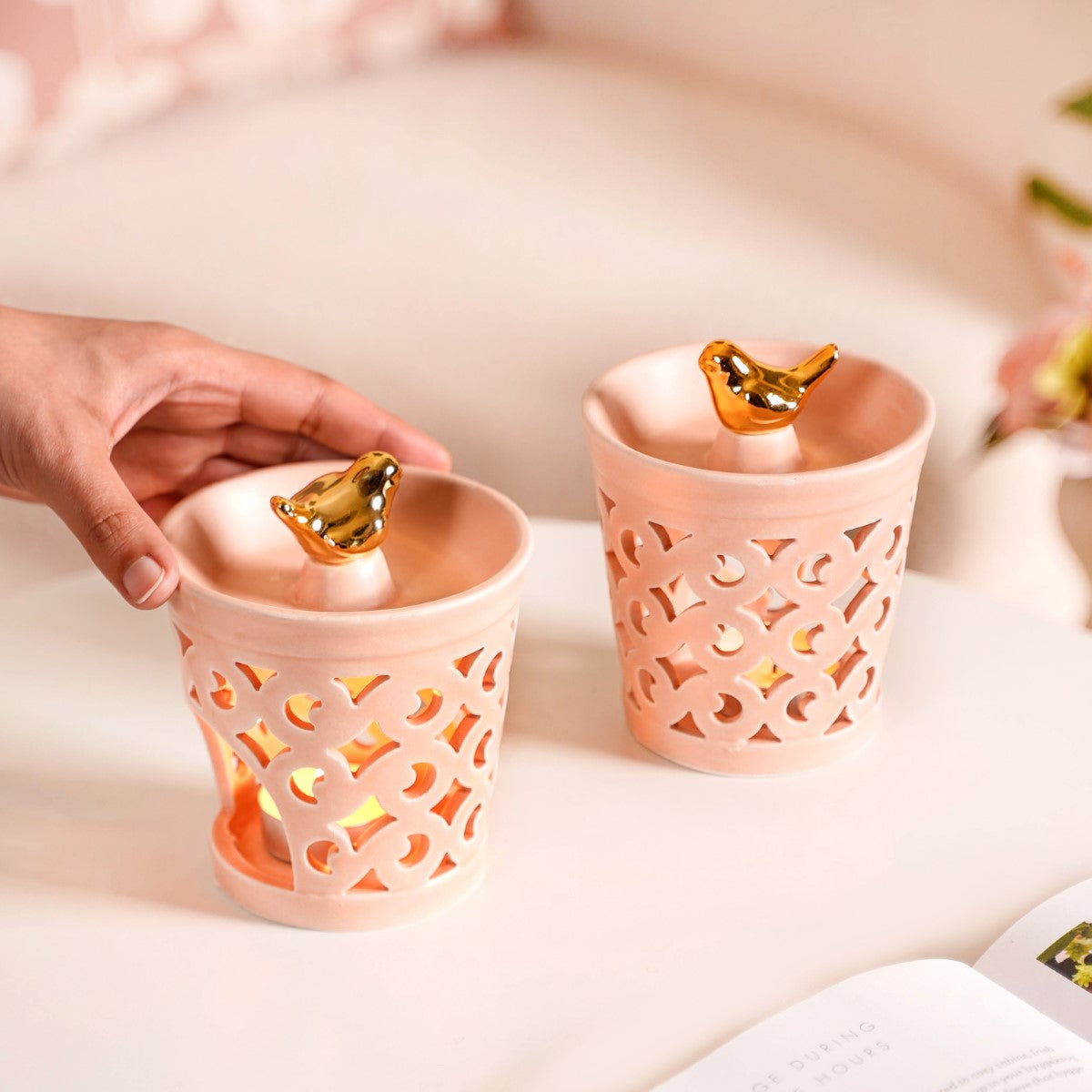 Elevate your festive ambiance with our exquisite lantern set, presenting two impeccably crafted ceramic lamp holders in a uniform design. Intricate cut-work details enrich the space, complemented by a charming golden bird atop the lids. Perfect for displaying tealights and diyas, these candle holders emanate a warm and inviting radiance. Whether it's Diwali, a special celebration, or any occasion, they infuse your space with timeless, captivating charm.