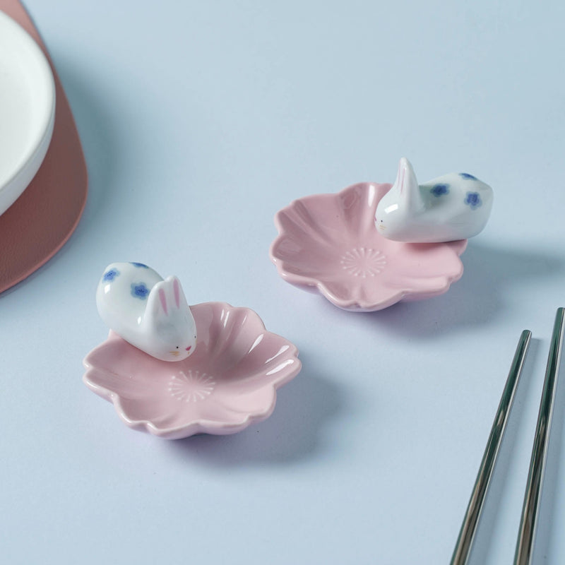 Bunny chopstick rest with a matching refreshment dish. The adorable ceramic chopstick rest helps in keeping the chopsticks clean and from rolling off the table. The pink dish can be used to serve wasabi or dips while eating snacks with the chopsticks. The chopstick holder adds dimension to the dining table with its quirky vibe.