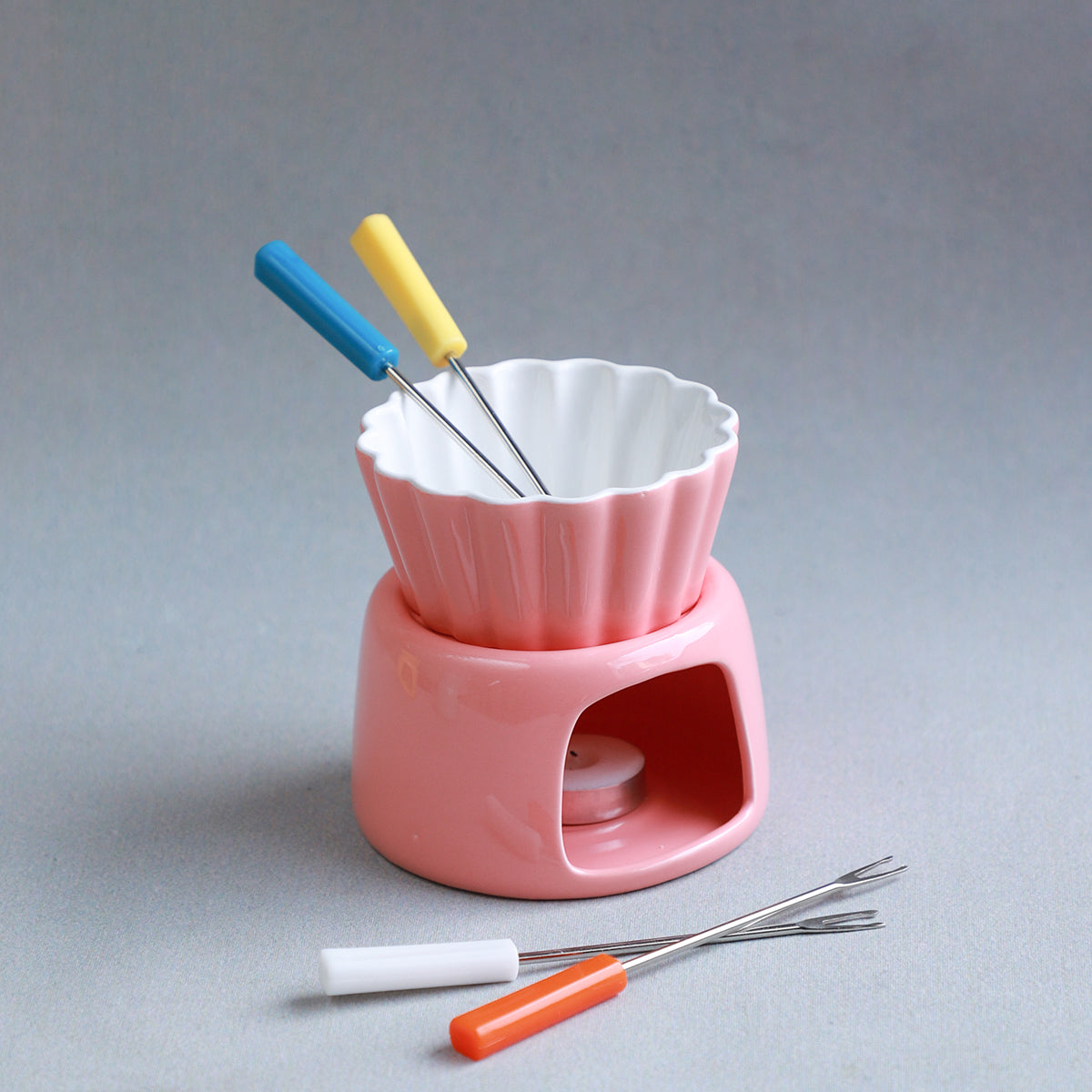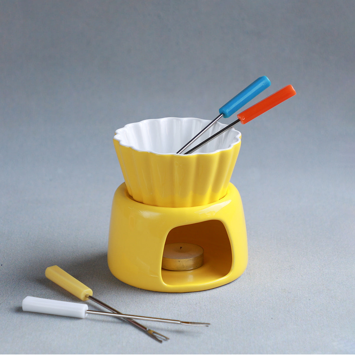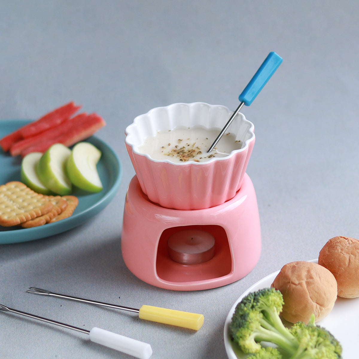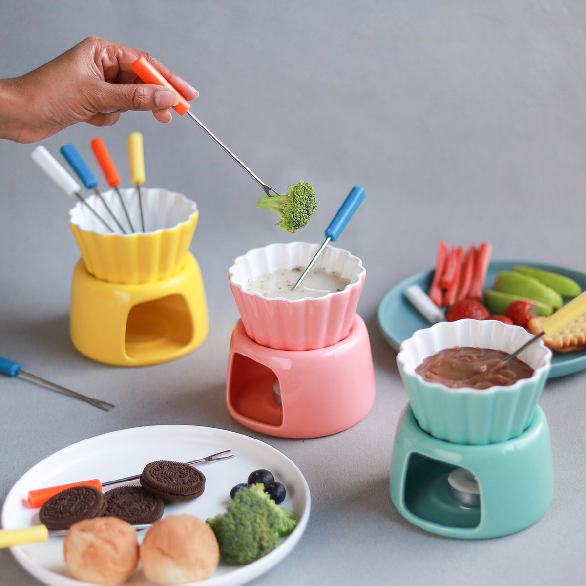 Ceramic fondue pots that come in different variants along with four colorful skewer sticks, a bowl and a warmer that can be used as a cheese fondue set or a chocolate fondue set. Fruits, marshmallows, vegetables, and bread croutons can be served along with cheese fondue or chocolate fondue for an enjoyable dining experience. The fondue dish can also be used keep appetizers warm.
