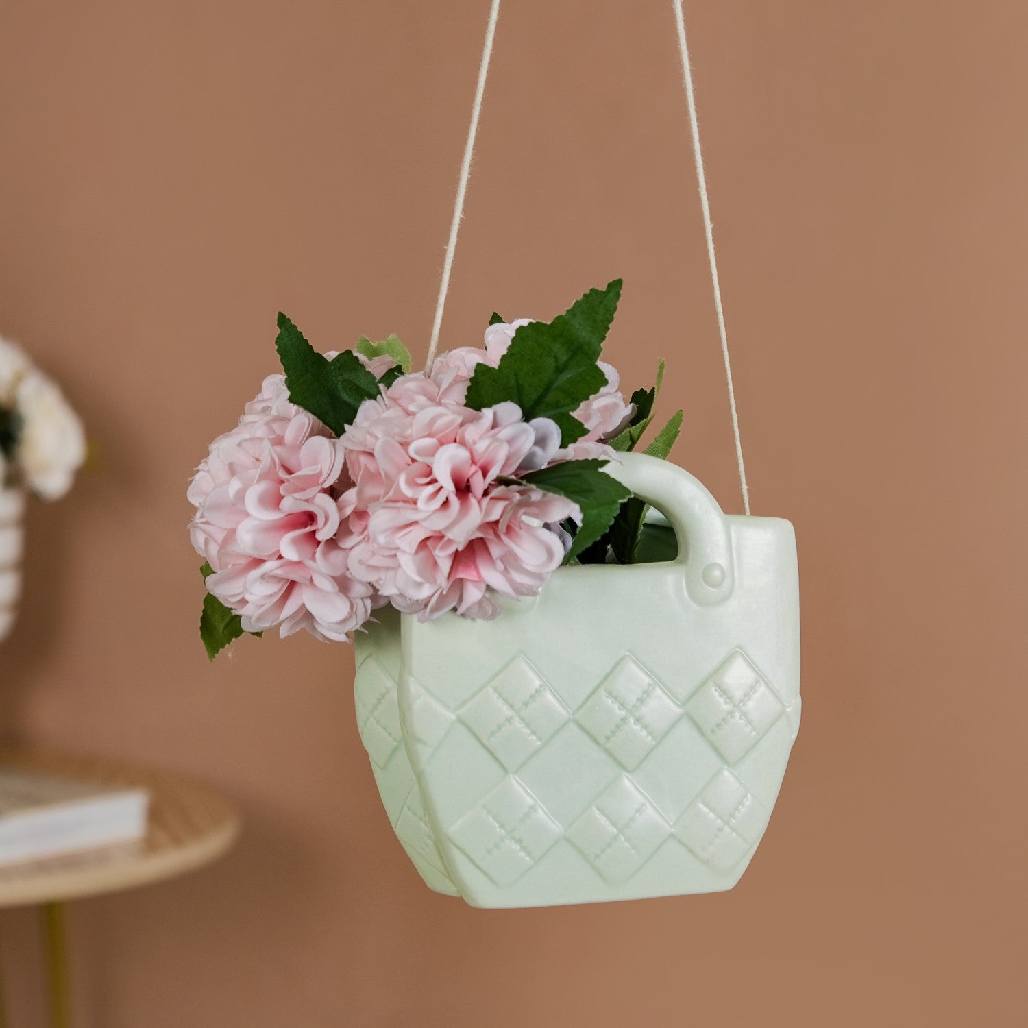 Infuse your space with personality and flair with our ceramic handbag-shaped vase in a captivating dark yellow shade. Its meticulously designed exterior, adorned with intricate diamond-patterned textures, adds a touch of sophistication to your home decor. The unique handbag shape injects whimsy, making it a standout piece in any room.