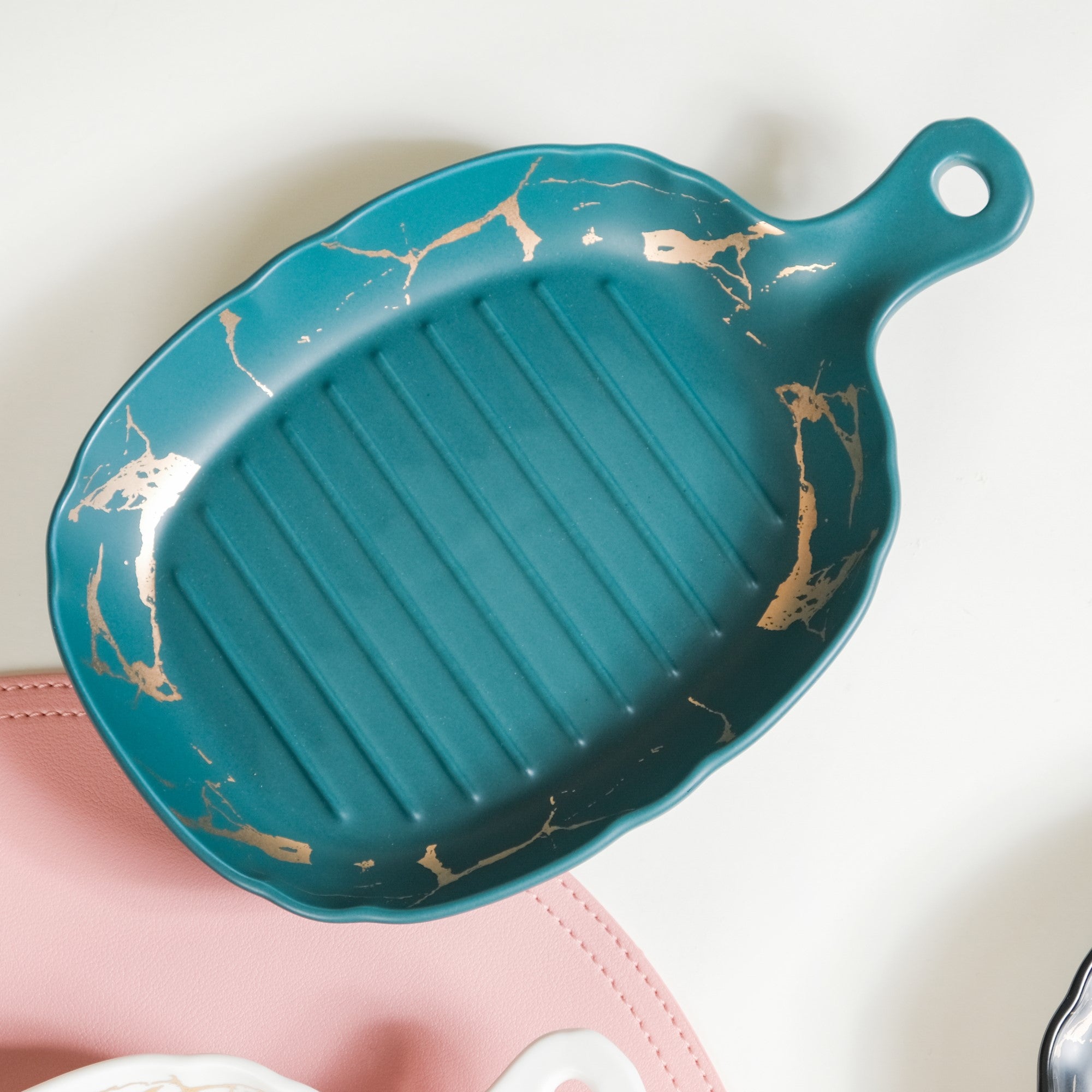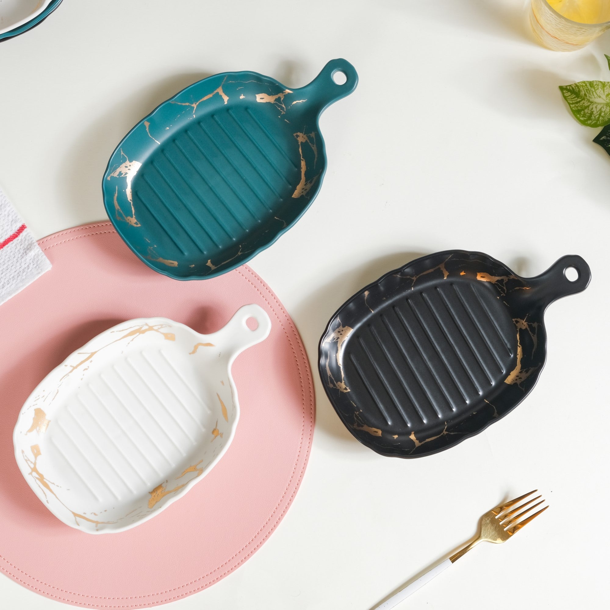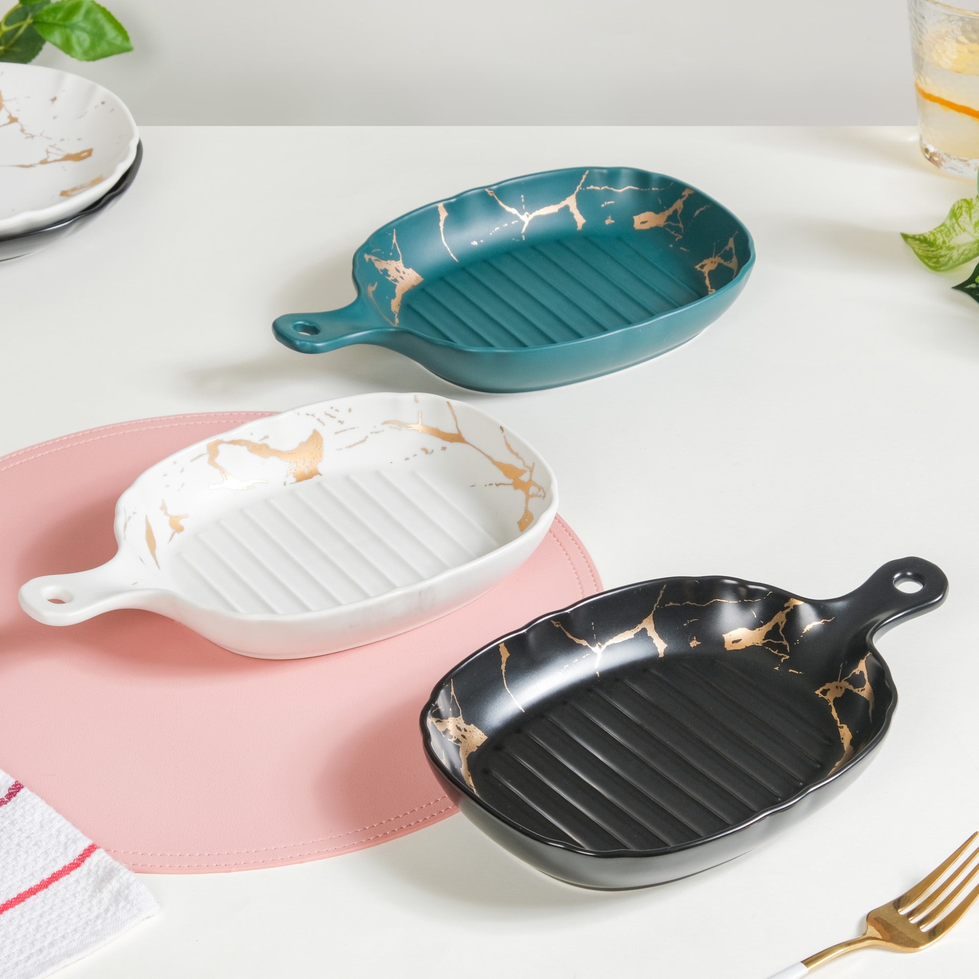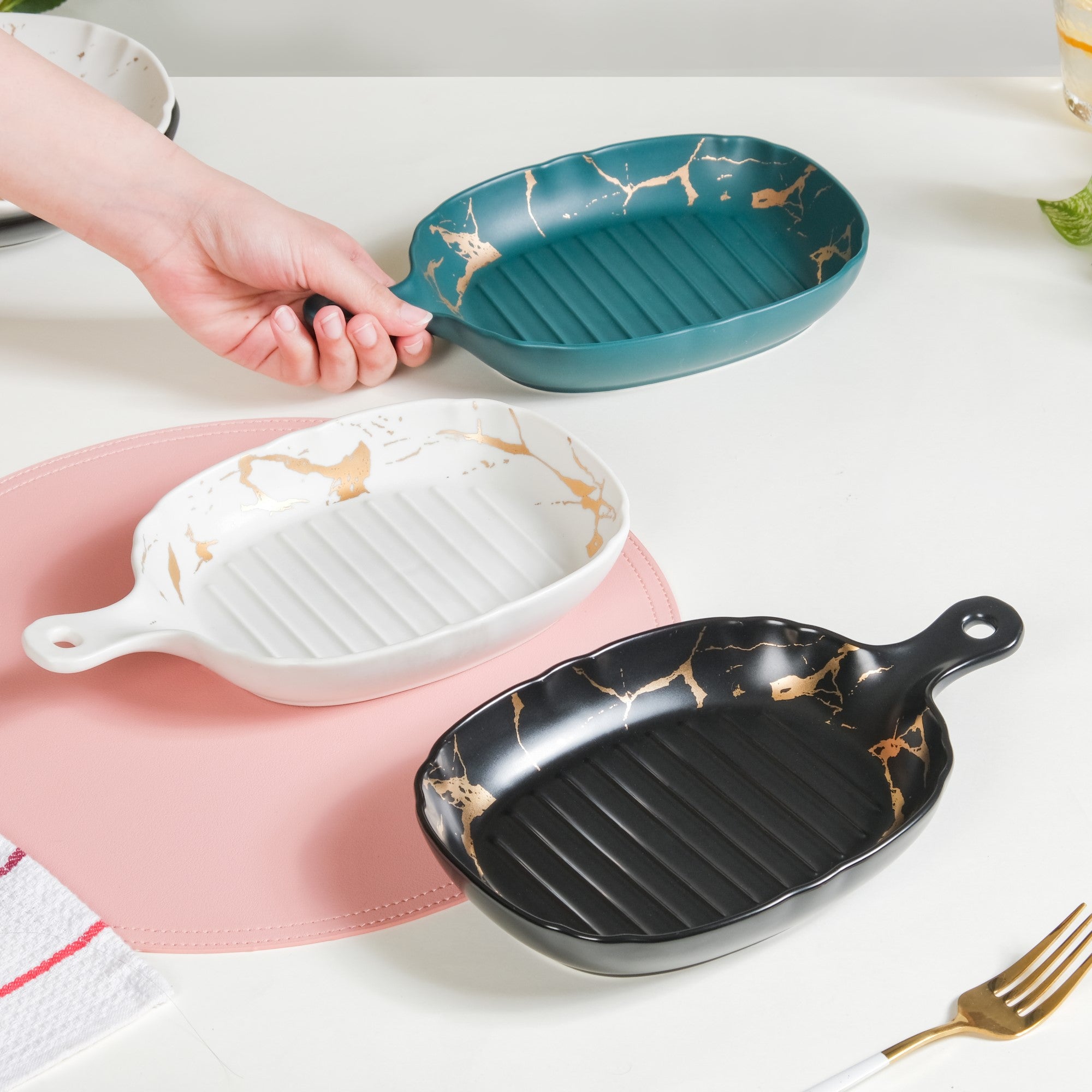 A ceramic serving dish that comes with a handle to make lifting and serving easy. Available in variant color options the dish would add definition to any table it is kept on. The serving dish looks very versatile and would be great for serving all cuisines.
