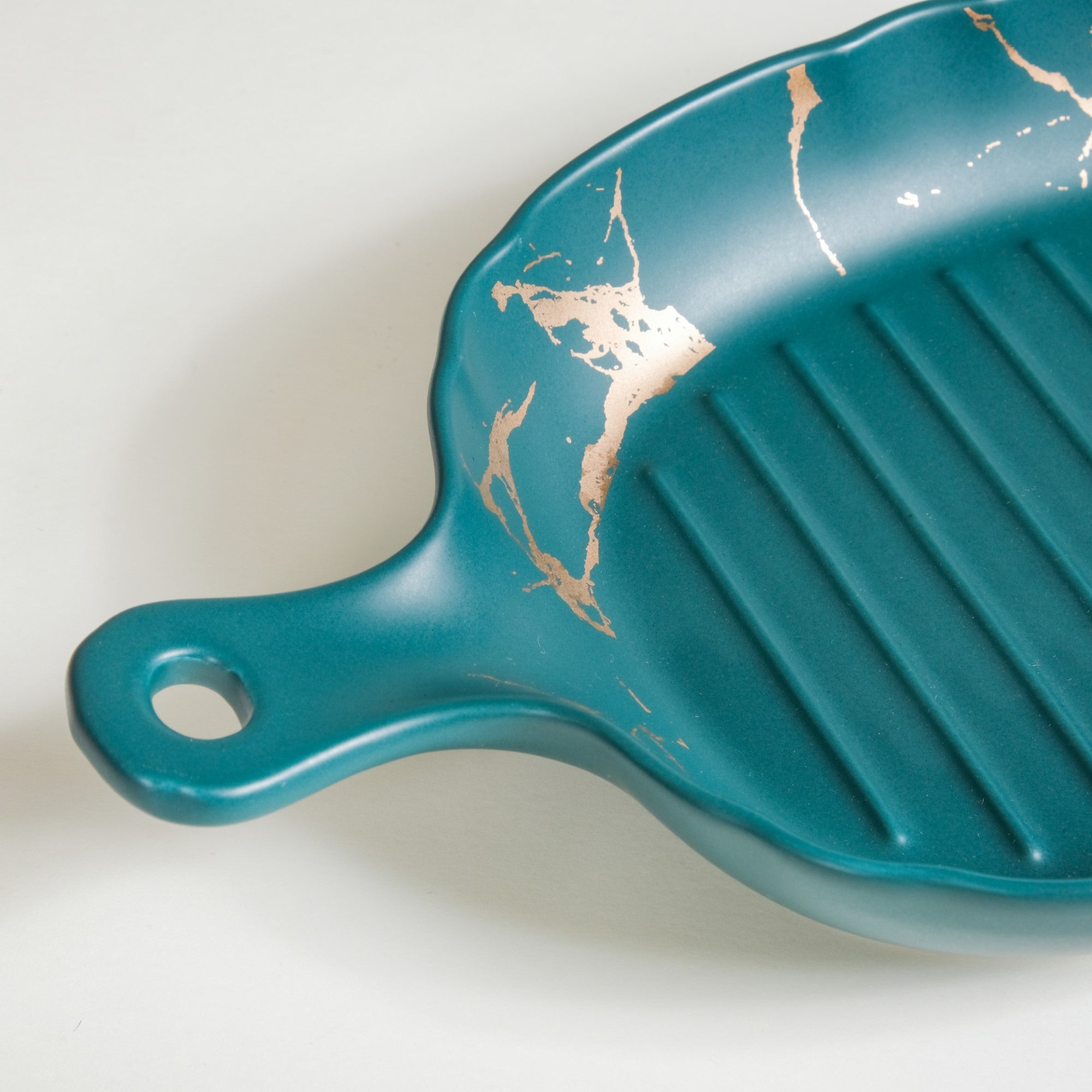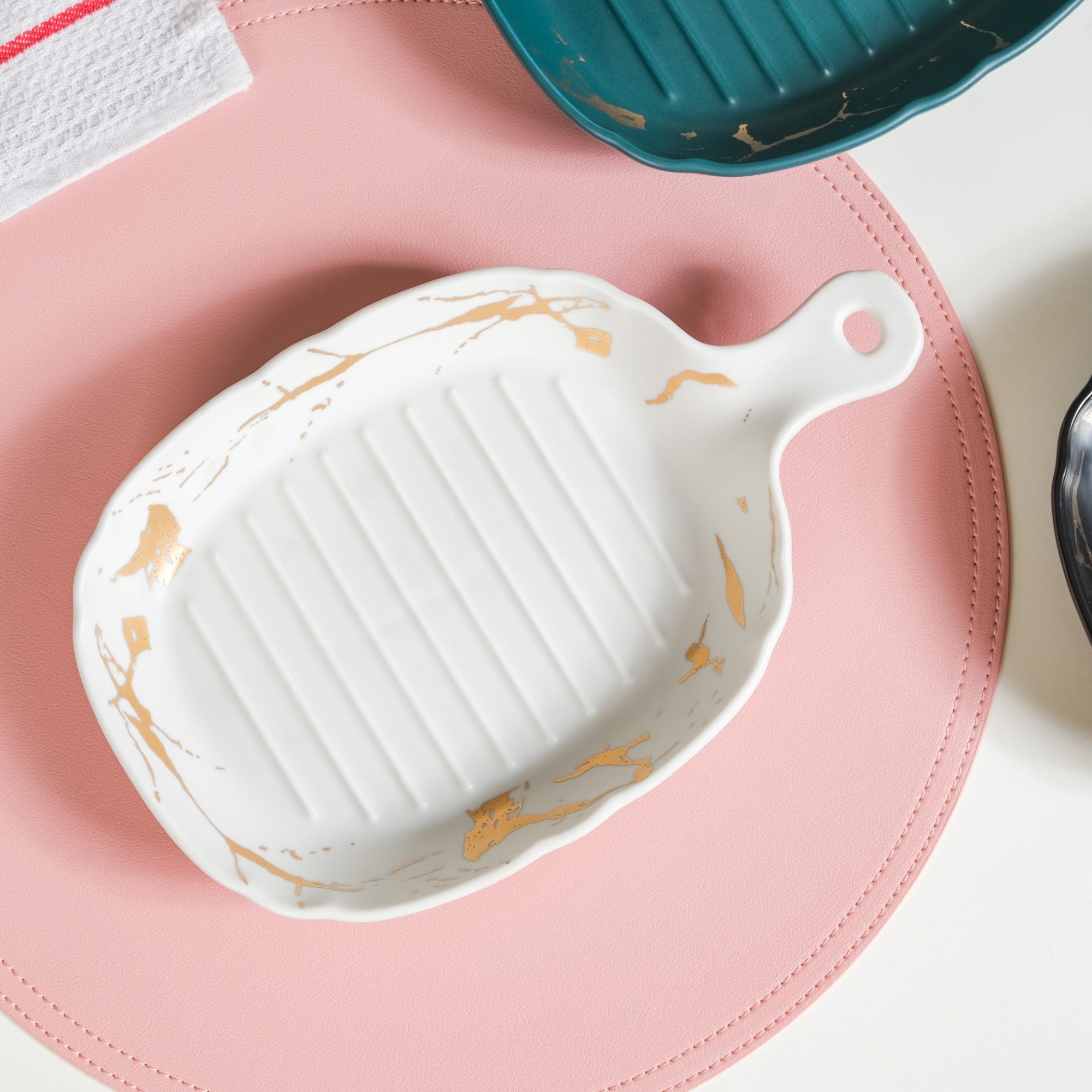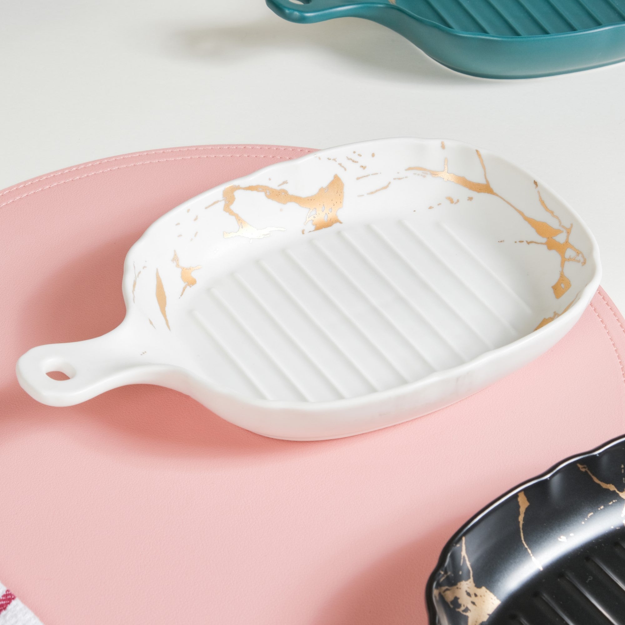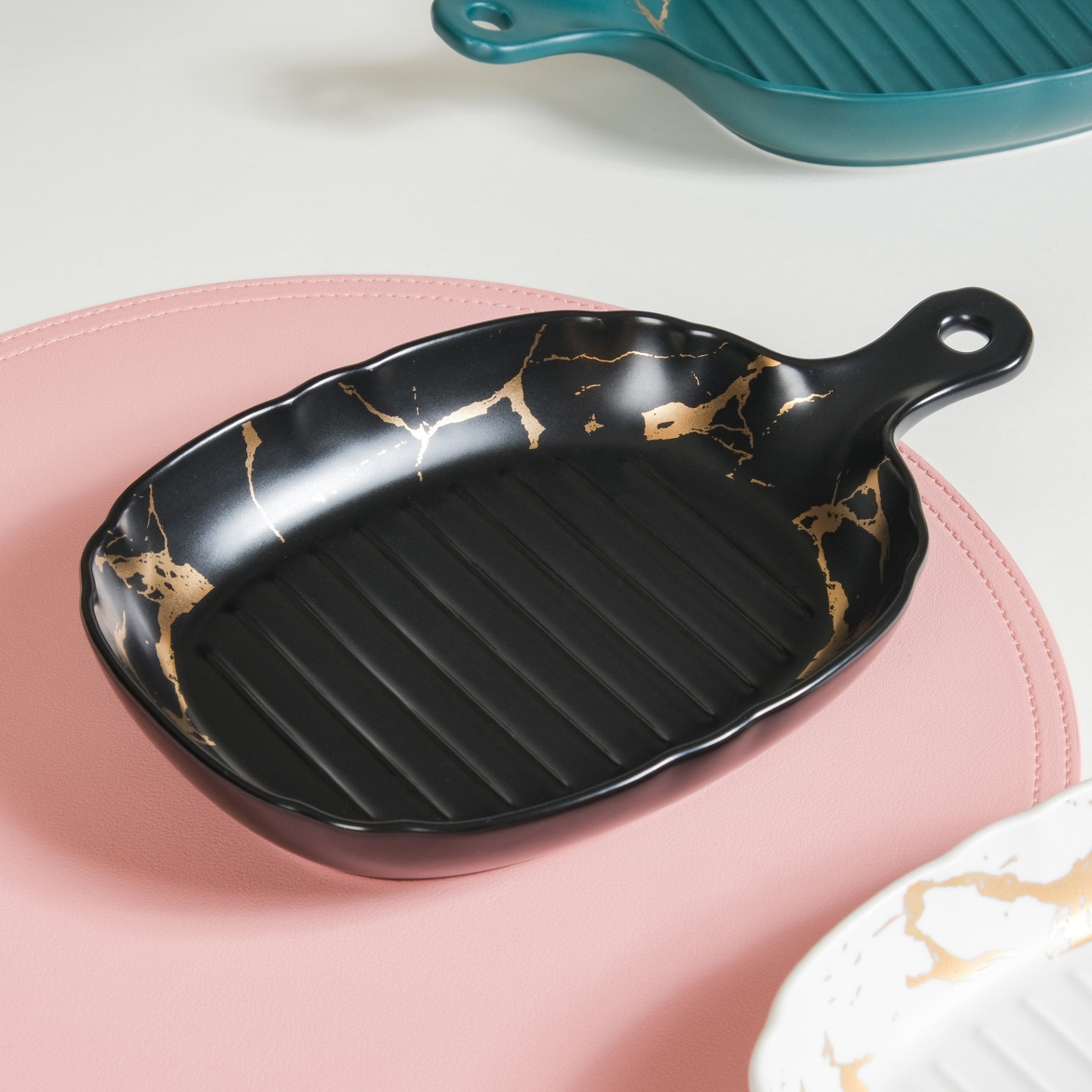 A ceramic serving dish that comes with a handle to make lifting and serving easy. Available in variant color options the dish would add definition to any table it is kept on. The serving dish looks very versatile and would be great for serving all cuisines.