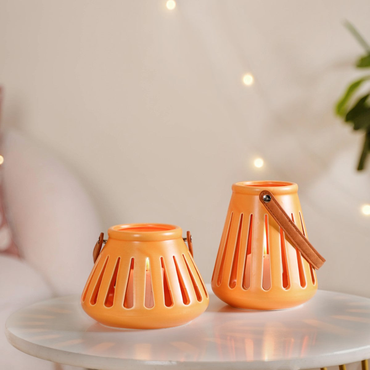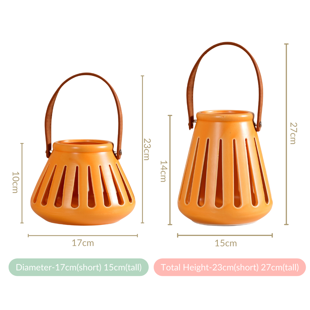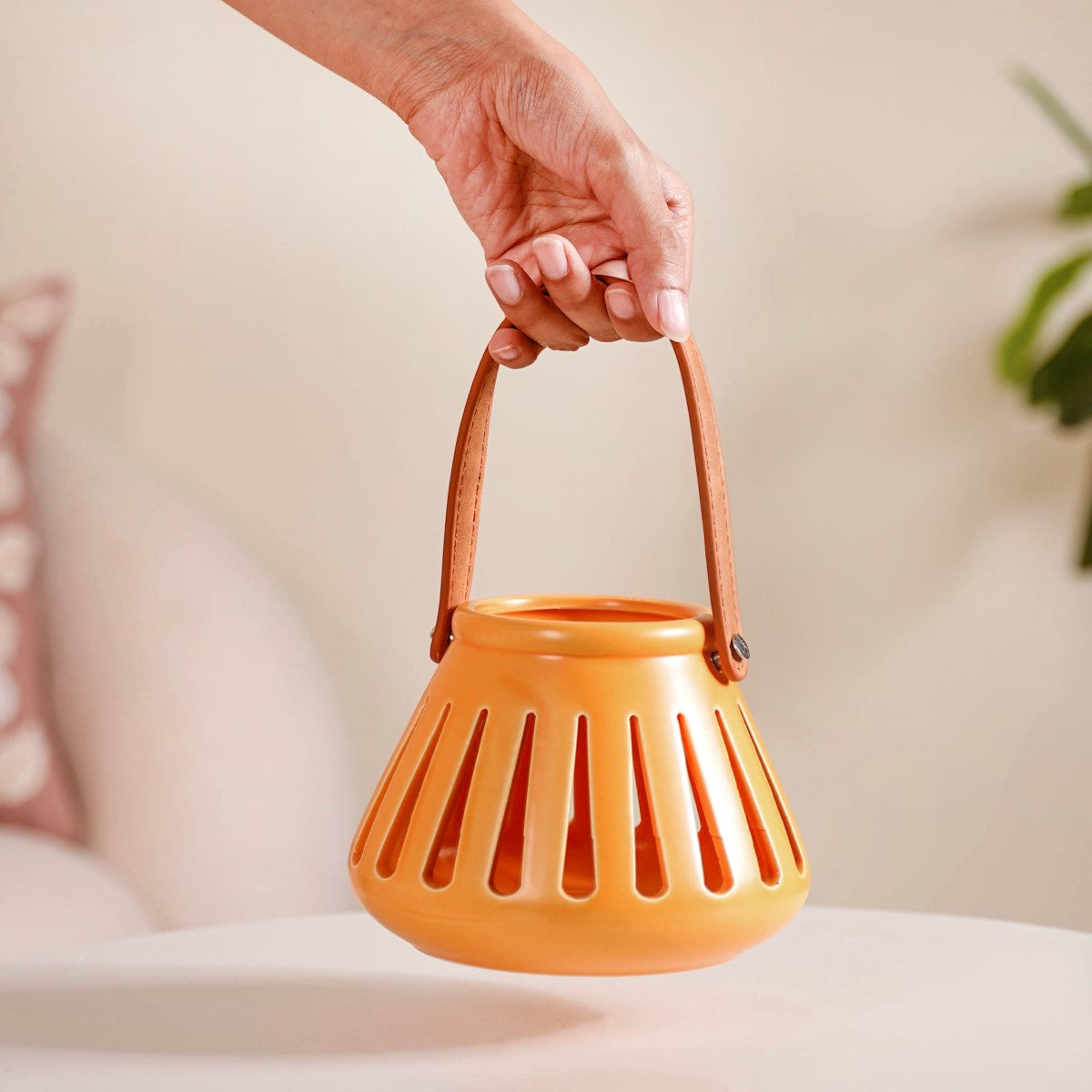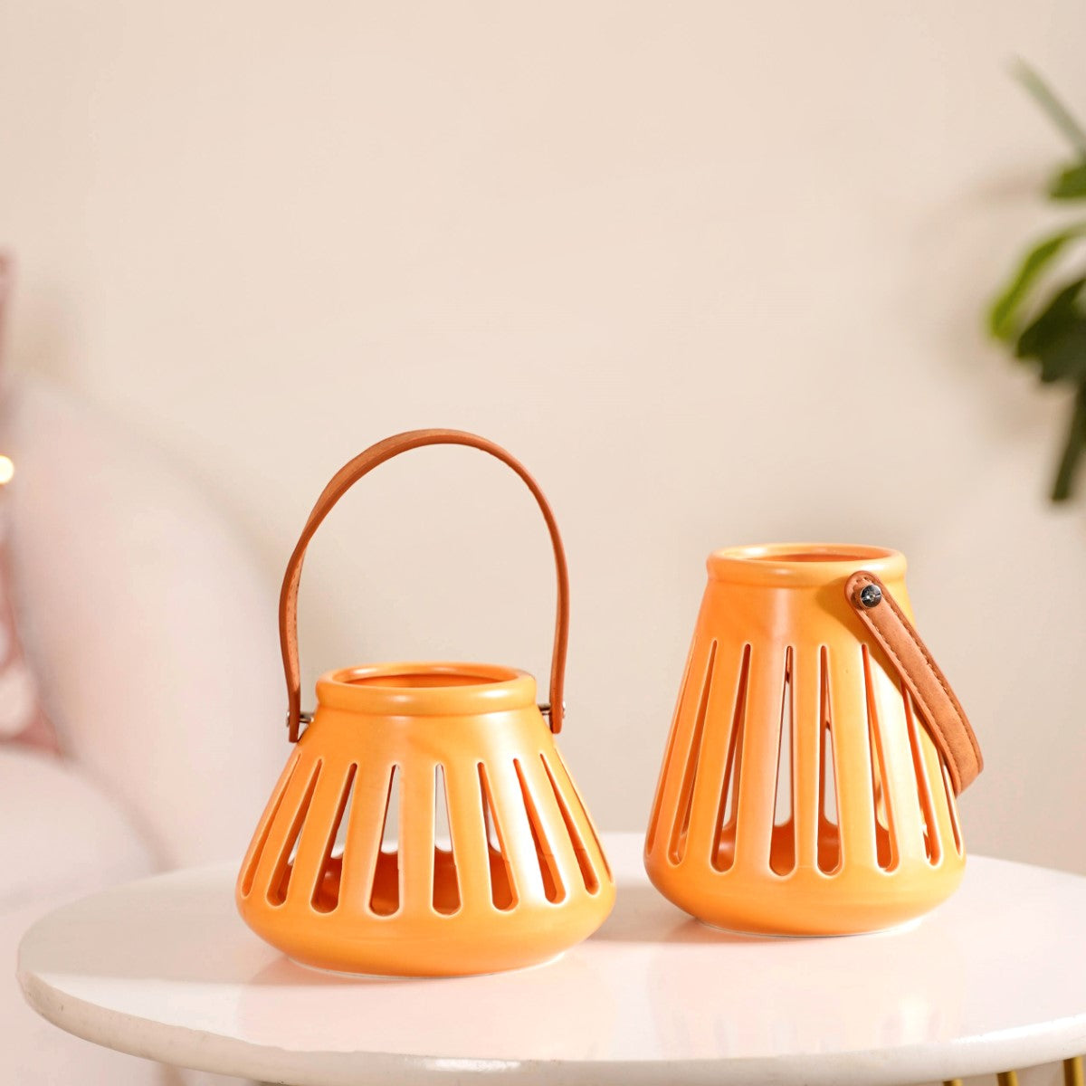 Lanterns go beyond their role as mere light sources; they symbolize unity and the unwavering human spirit. This festive season, elevate your home's ambiance with our stunning ceramic lantern set in vibrant yellow. It comprises two differently-sized lanterns adorned with intricate cut-work designs, effortlessly adding an elegant touch. The brown rexine leather handles provide a stylish contrast and a unique bucket shape. The short candle stand accommodates multiple diyas or candles, while the tall one elegantly displays both diyas and pillar candles.