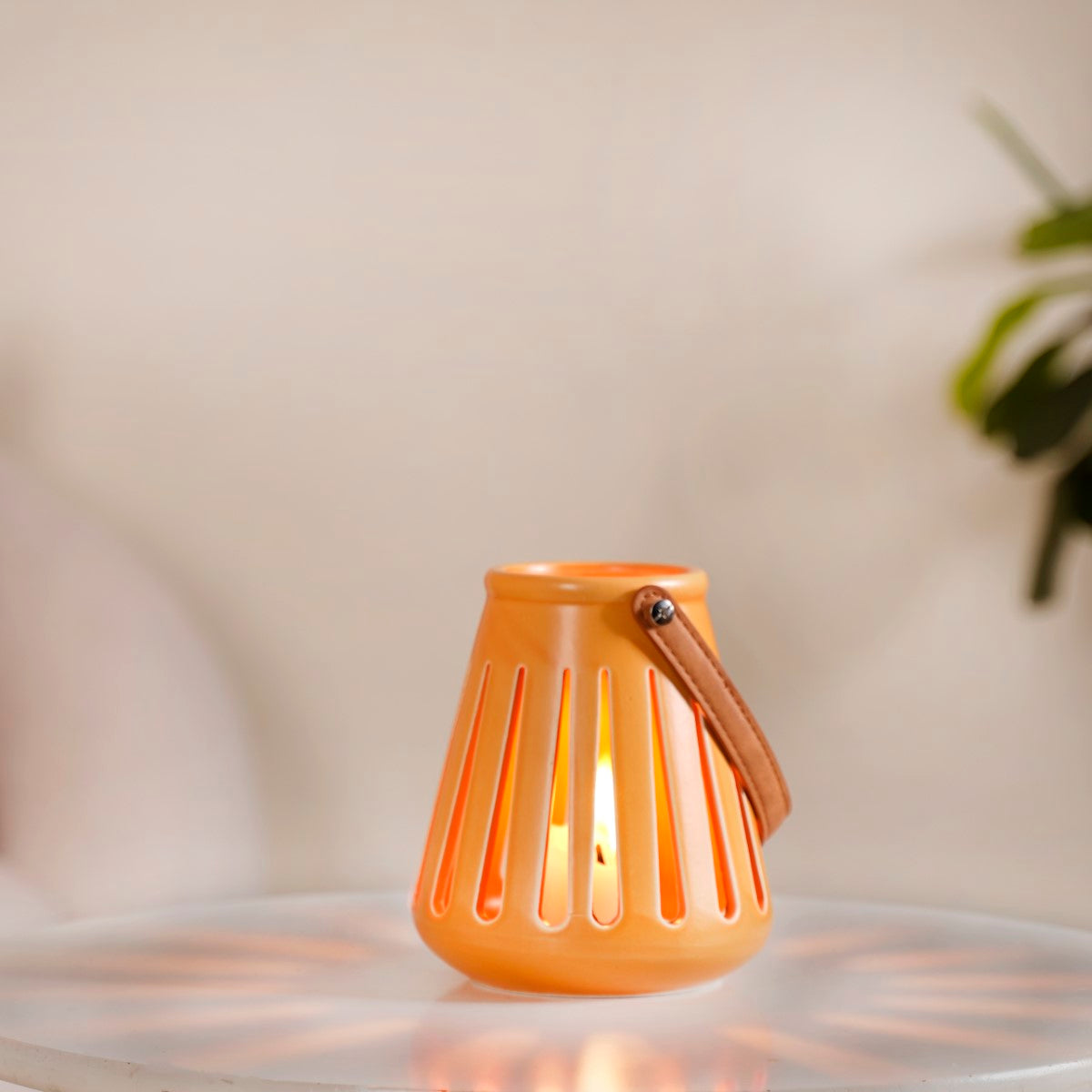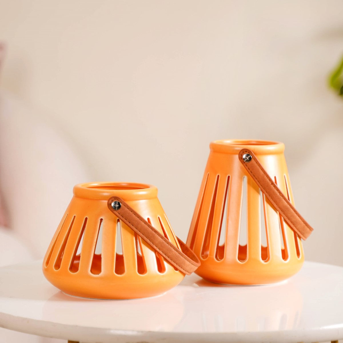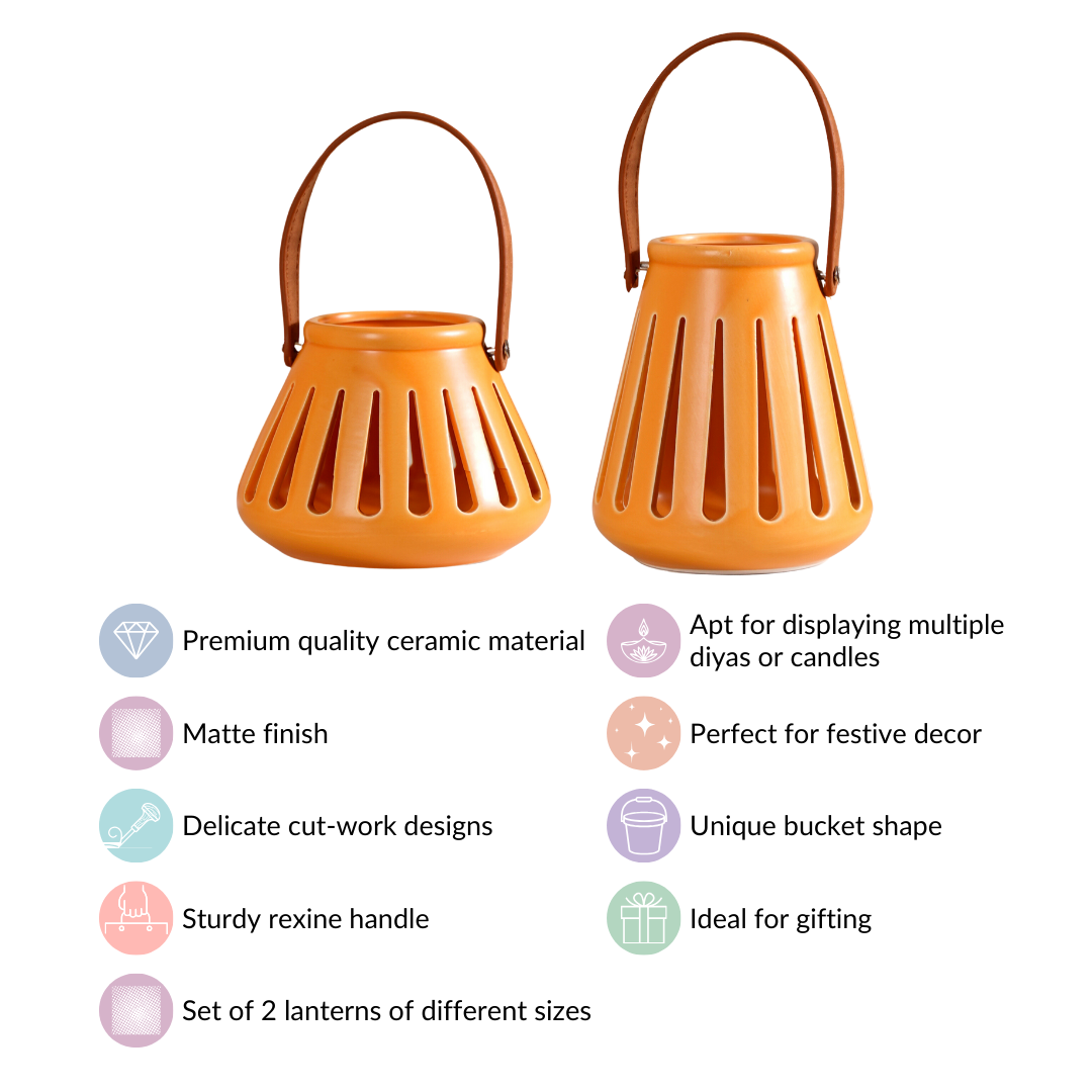 Lanterns go beyond their role as mere light sources; they symbolize unity and the unwavering human spirit. This festive season, elevate your home's ambiance with our stunning ceramic lantern set in vibrant yellow. It comprises two differently-sized lanterns adorned with intricate cut-work designs, effortlessly adding an elegant touch. The brown rexine leather handles provide a stylish contrast and a unique bucket shape. The short candle stand accommodates multiple diyas or candles, while the tall one elegantly displays both diyas and pillar candles.