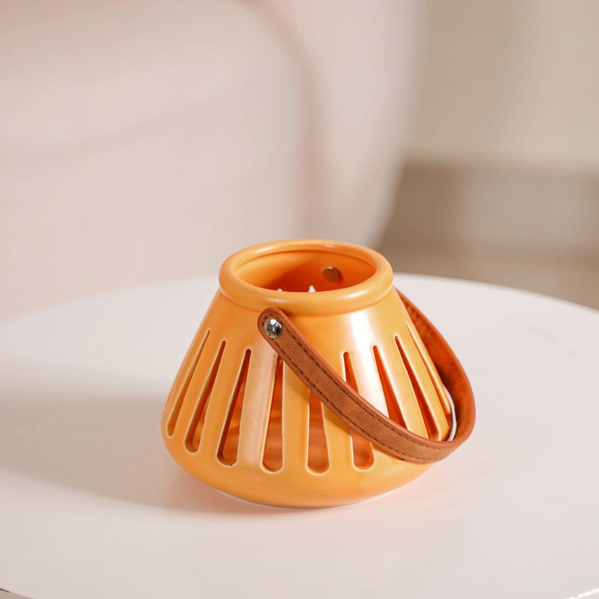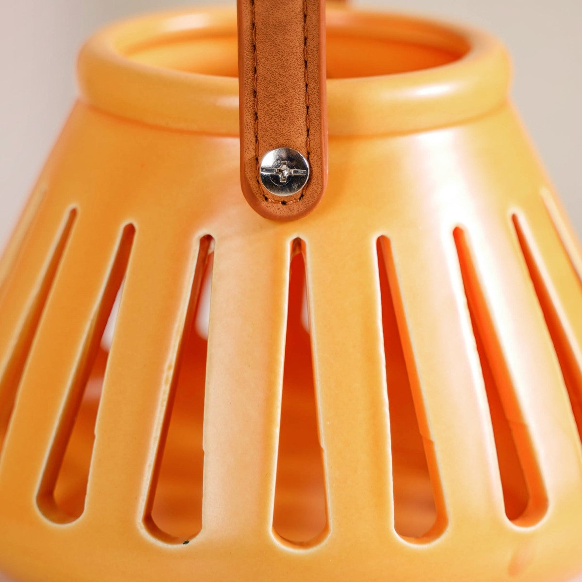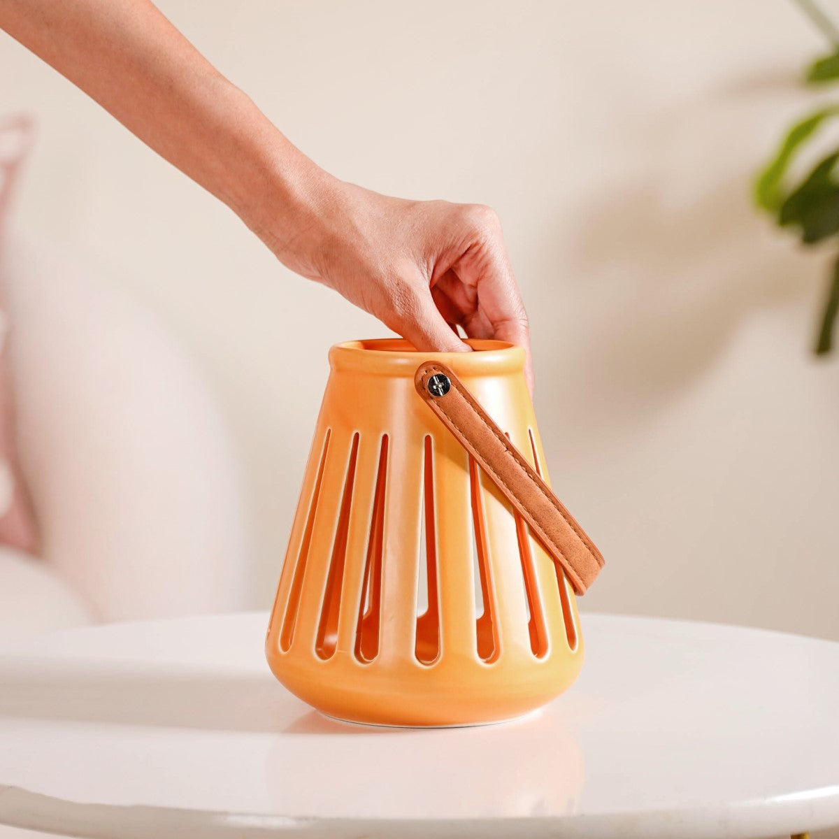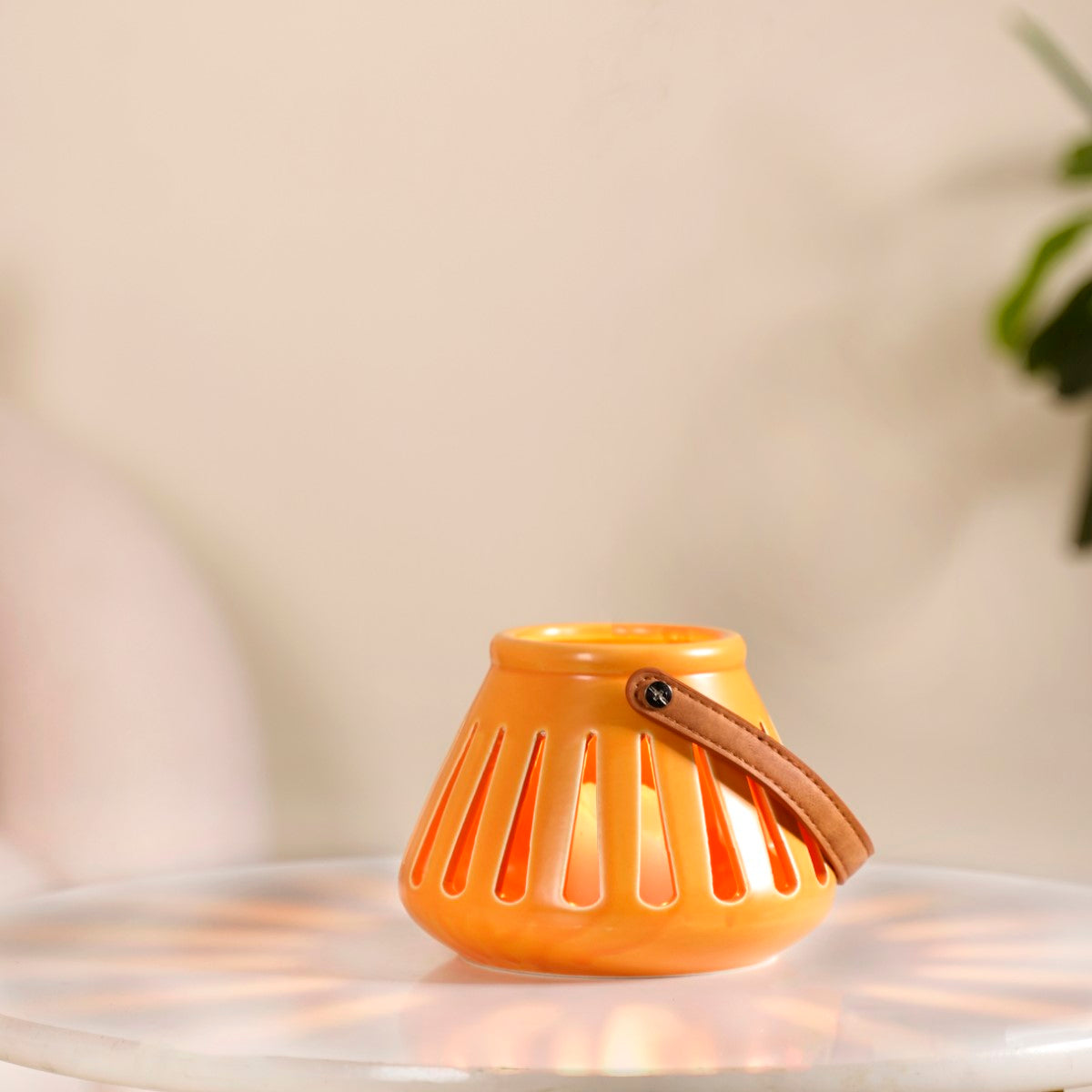 Lanterns go beyond their role as mere light sources; they symbolize unity and the unwavering human spirit. This festive season, elevate your home's ambiance with our stunning ceramic lantern set in vibrant yellow. It comprises two differently-sized lanterns adorned with intricate cut-work designs, effortlessly adding an elegant touch. The brown rexine leather handles provide a stylish contrast and a unique bucket shape. The short candle stand accommodates multiple diyas or candles, while the tall one elegantly displays both diyas and pillar candles.
