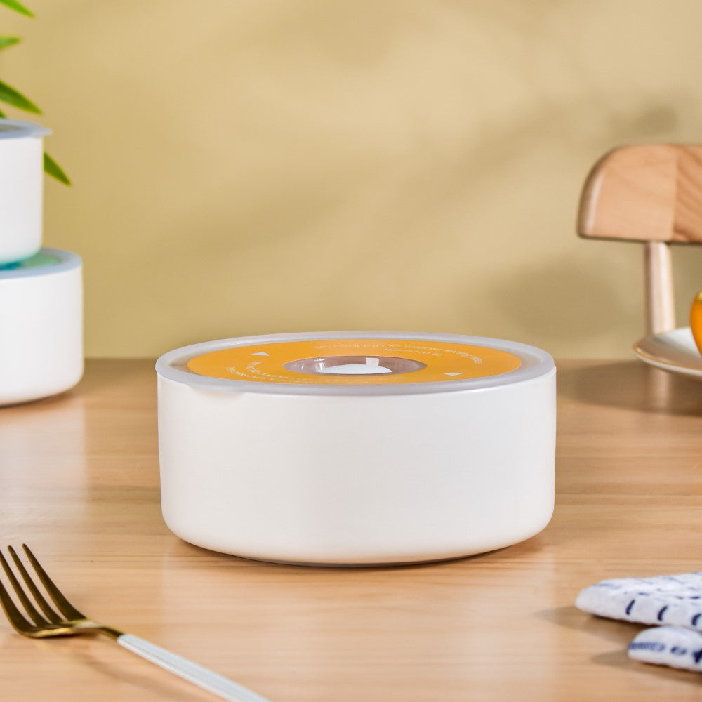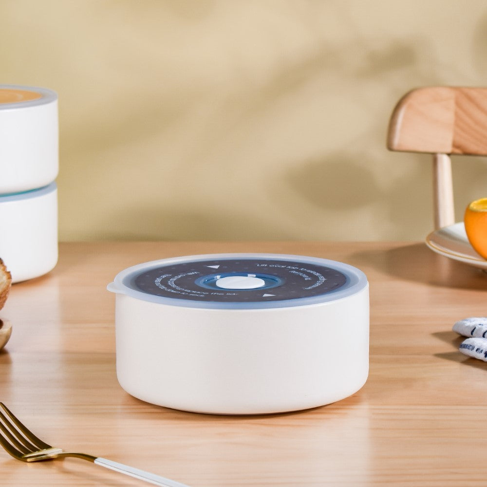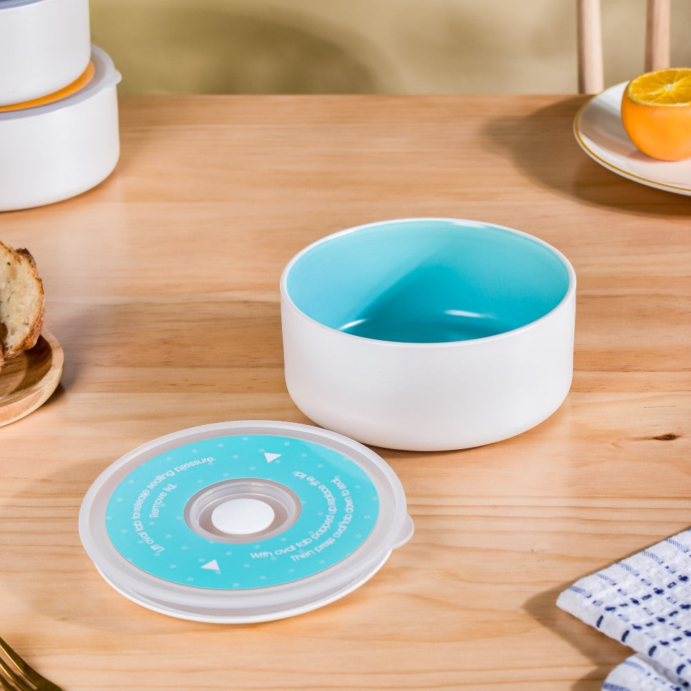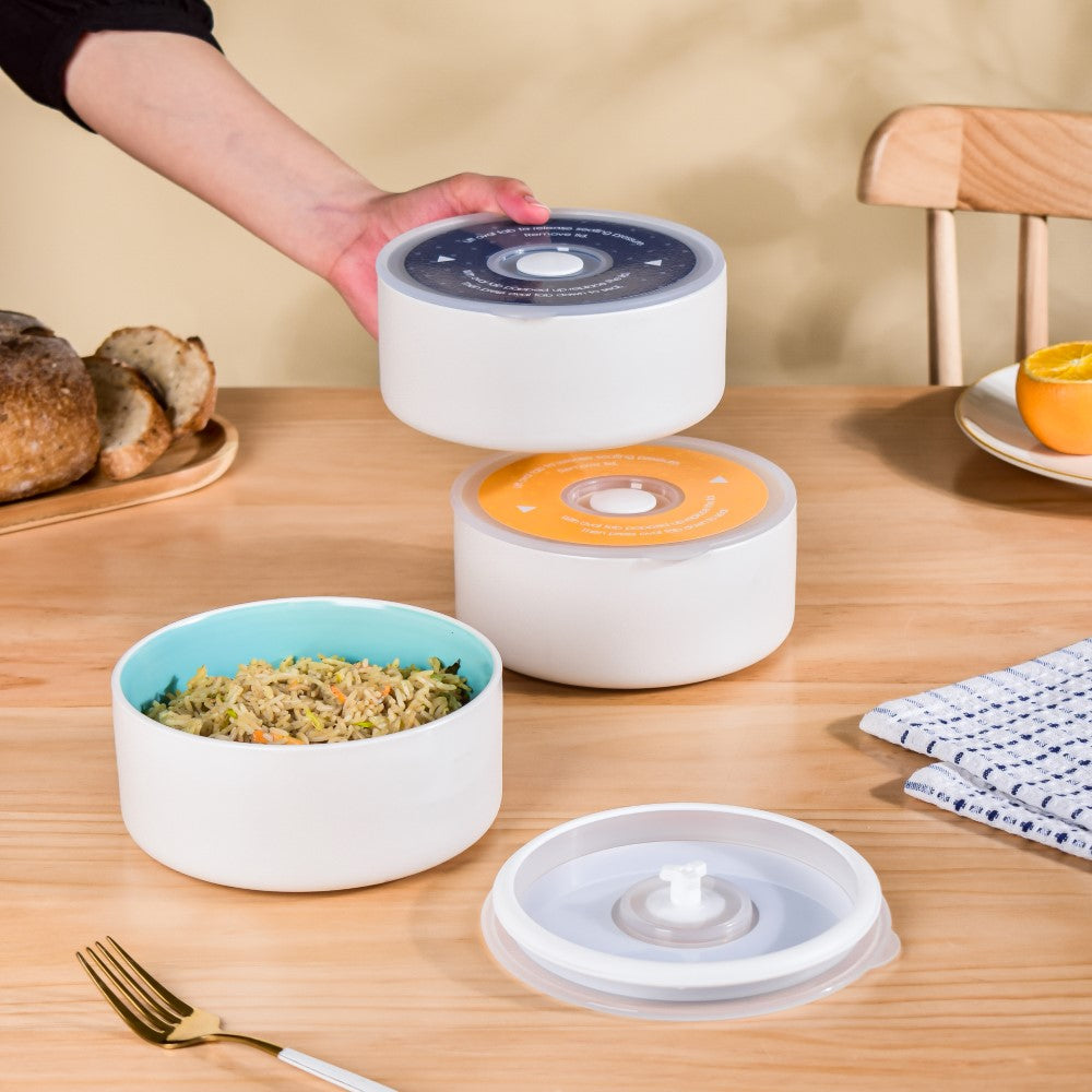 The ceramic lunch box with a clear PVC top helps keep food warm within. For lunch, the simple and sophisticated bowl is great for packing noodles or a whole meal with rice and grilled chicken. During movie nights, the lunch box can also be utilized as a snack bowl for serving popcorn. In the refrigerator, the bowl can also be used to store leftover pasta, rice, or noodles. The ceramic bowl is microwave safe when used without the PVC lid. The ceramic lunch box comes in three different color combinations. The lunchbox without the lid can be placed in the microwave oven or dishwasher.