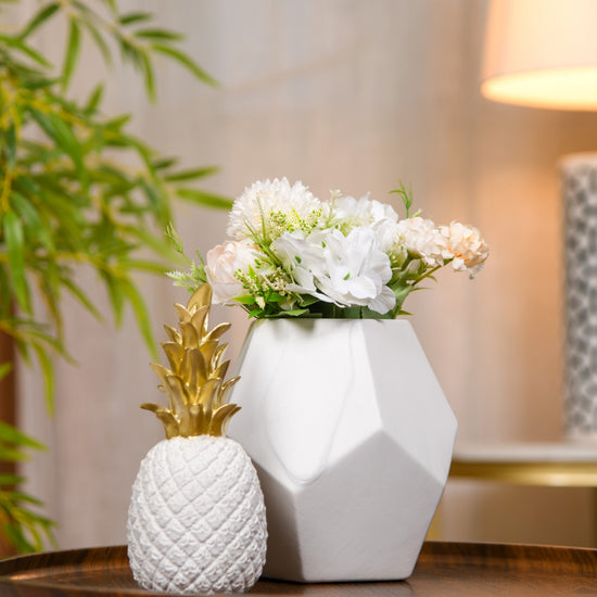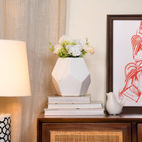 Discover our exquisite ceramic flower vase, a true masterpiece of artisanal craftsmanship. This decorative vase is meticulously handcrafted, featuring a unique 3D pentagon shape that sets it apart from the ordinary. With a smooth white matte finish and an elegant marble-patterned design inspired by Scandinavian aesthetics, it adds a touch of sophistication to any space. Designed for both beauty and practicality, this ceramic vase includes an anti-skid foam base for stability and surface protection. Effortless cleaning and maintenance make it a hassle-free addition to your decor, and it's perfect for showcasing vibrant floral arrangements, elevating your living room's aesthetics.