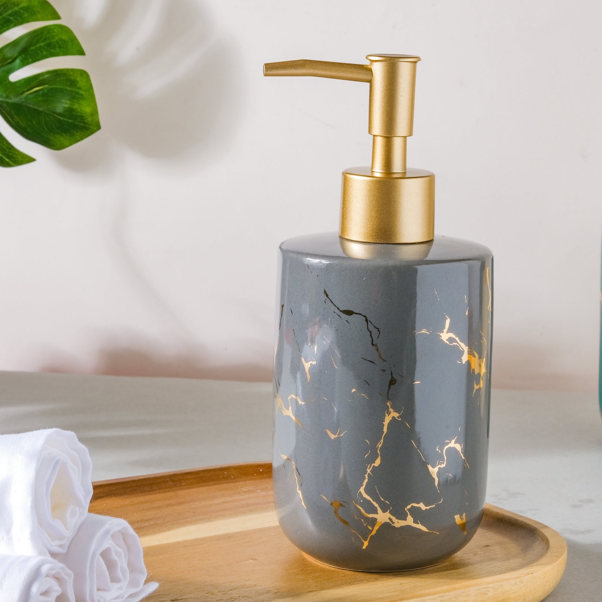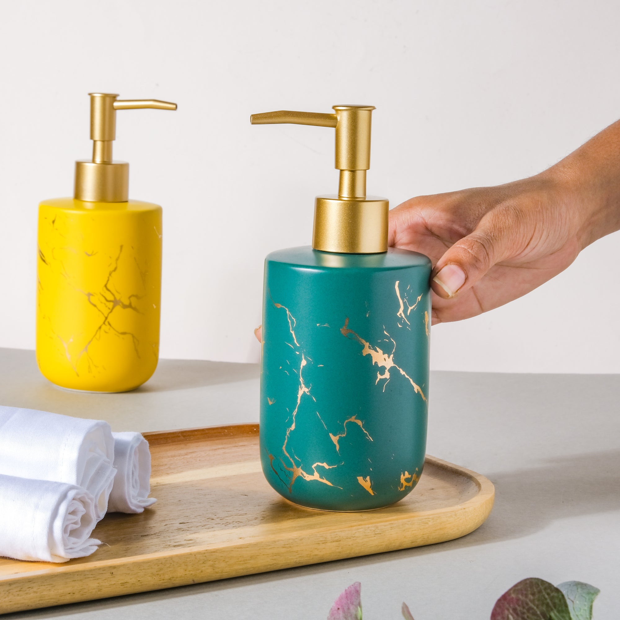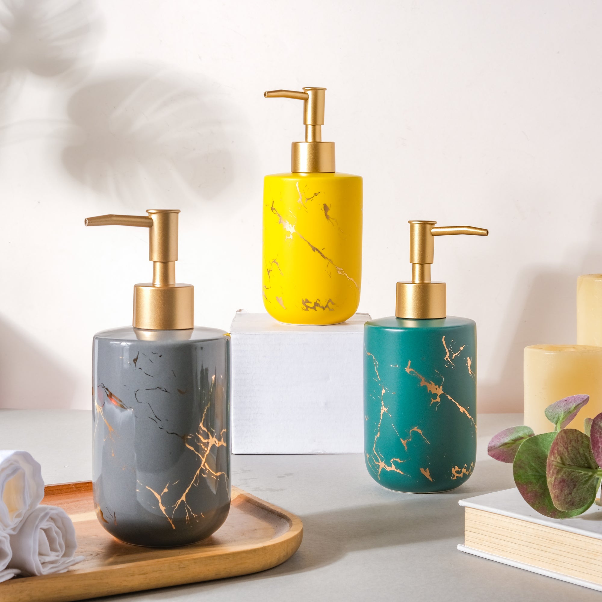 The ceramic dispensers, available in several color options, have been crafted to suit one's daily morning ritual, whether it is hand soap, face cream, face wash, or bathing soap that one decides to store in it. The dispenser comes in bright colors and has a metallic nozzle adding some shine to the matte finish body of the dispensers. The dispenser would make a quirky addition to any dull and drab space given its patterned surface. The dispenser helps make the kitchen counter look more organized and neat. Nestip: Use the dispenser to store kitchen soap. Size: 18.5cm H x 5.5cm diameterCapacity- 300ml Color: Green, yellow, grey, and gold Material: Ceramic and metal Products included: 1 dispenser Style: Green: NSA37A94 Yellow: NSA37A95 Grey: NSA37A96
