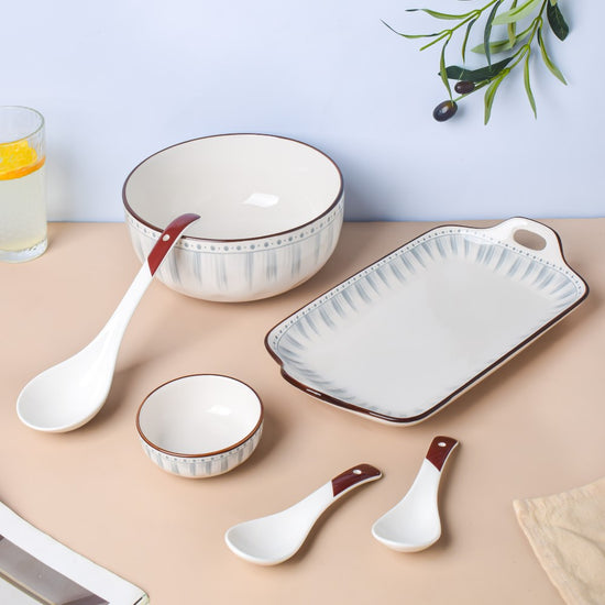 Yes, you can pair the soup spoon set with other dinnerware pieces, but make sure to maintain a uniform colour palette. Since the soup spoon set is white and brown, it's best to pair the set with crockeries having similar colours. Or, you can always pair the soup spoons with plain white dinnerware pieces for a sophisticated and elegant table setup.