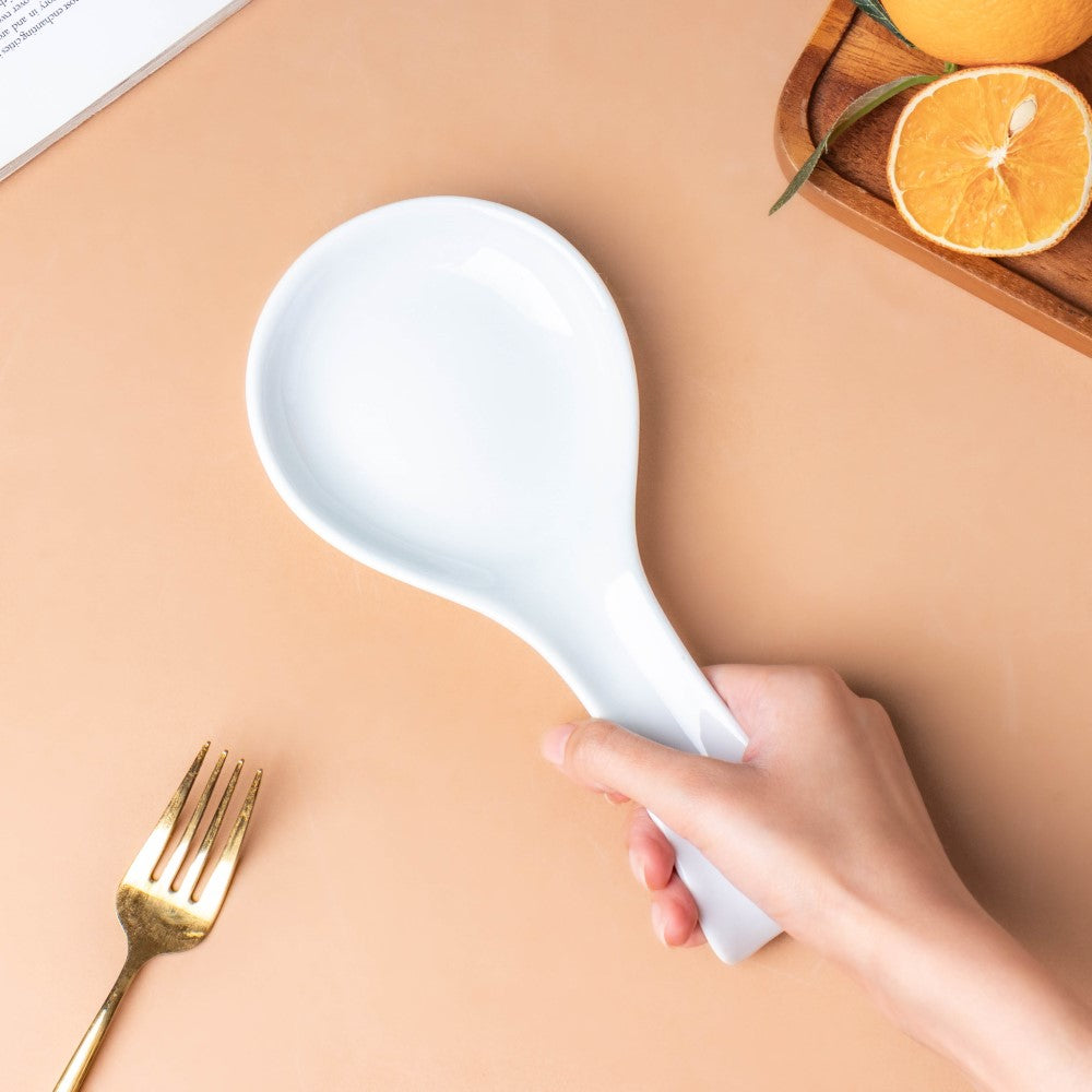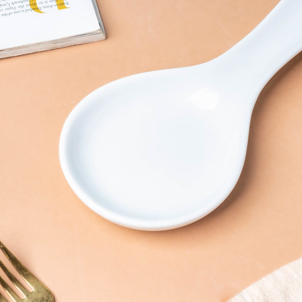 Keep the kitchen effortlessly clean and organised with the ceramic spoon rest. The ceramic spoon rest features a stark white colour that blends in with any decor and setup. The spoon holder is a utilitarian table accessory for keeping the servings clean and hygienic. The spoon rest is ideal to keep gravy-dipped spoons to avoid spillages and stains on the table.