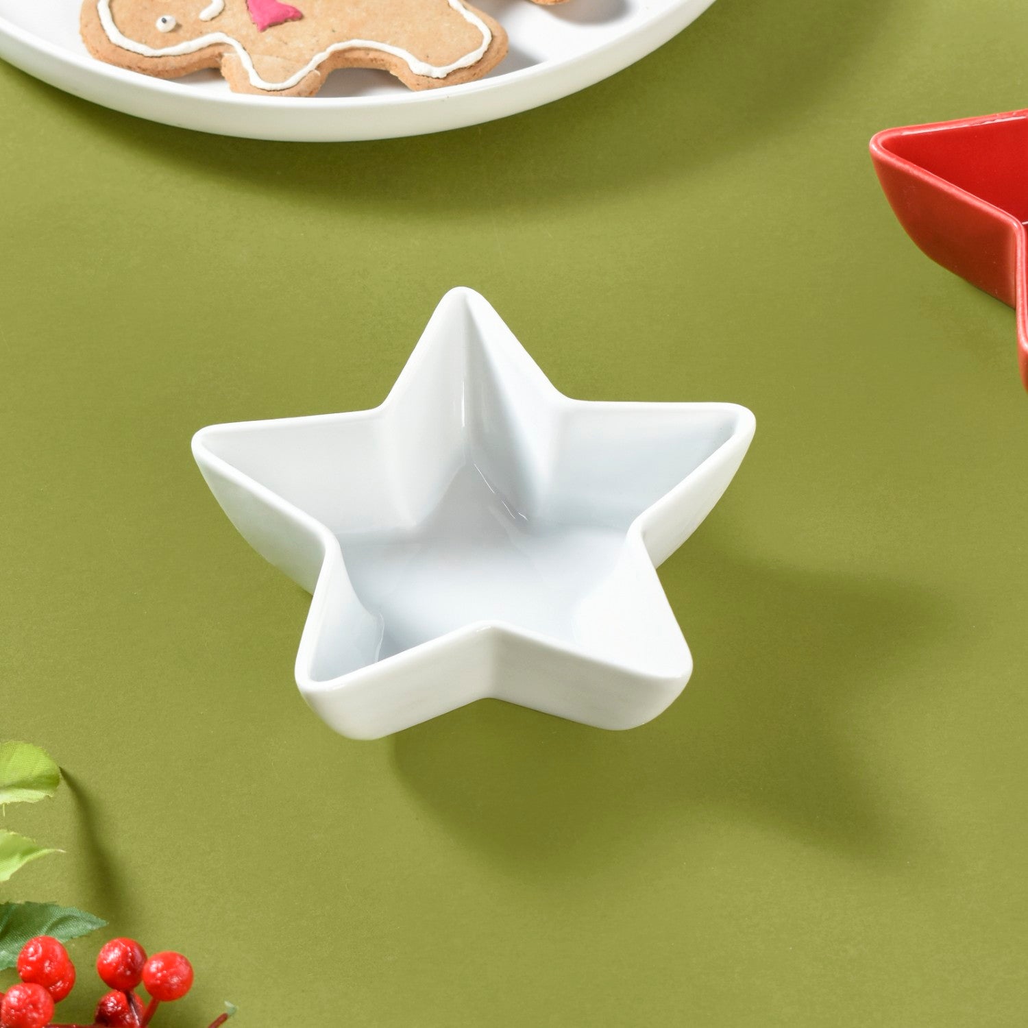 Design: This fun serving tray showcases three star-shaped ceramic bowls nestled securely on a bamboo tray. The design features a striking colour contrast, with two bowls in a vibrant, glossy red and the centre bowl in crisp white. The bowls are arranged linearly on the bamboo tray, creating an appealing and organised display. The unique shape and bold colours make this set instantly eye-catching and perfect for celebrating.