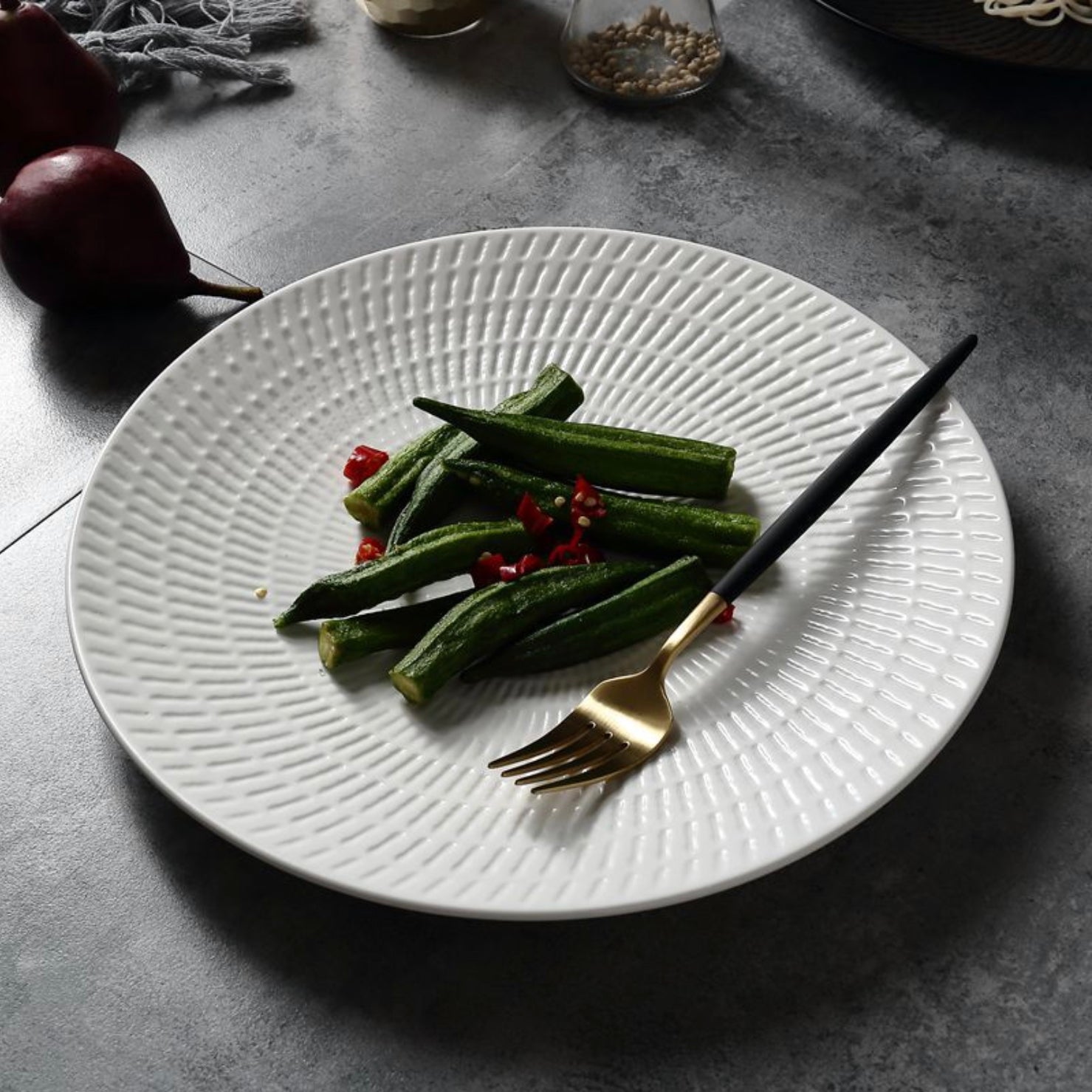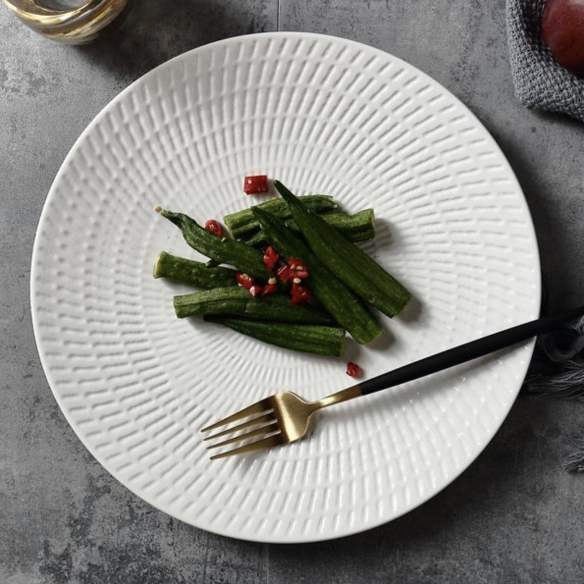 Nell K Paired the white dinner plates with white and black Siena side plates. Looks fabulous! The white plates have perfect texture that compliments a neo classic dinner table setting.