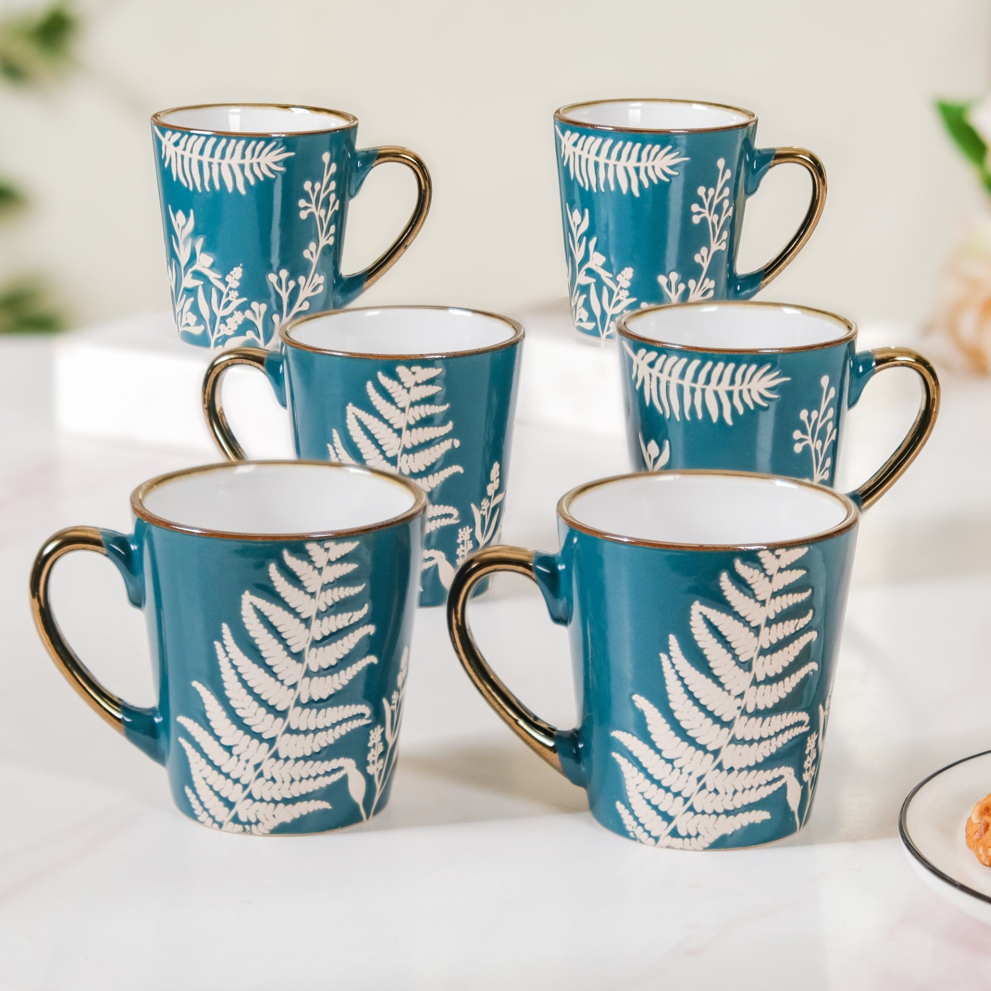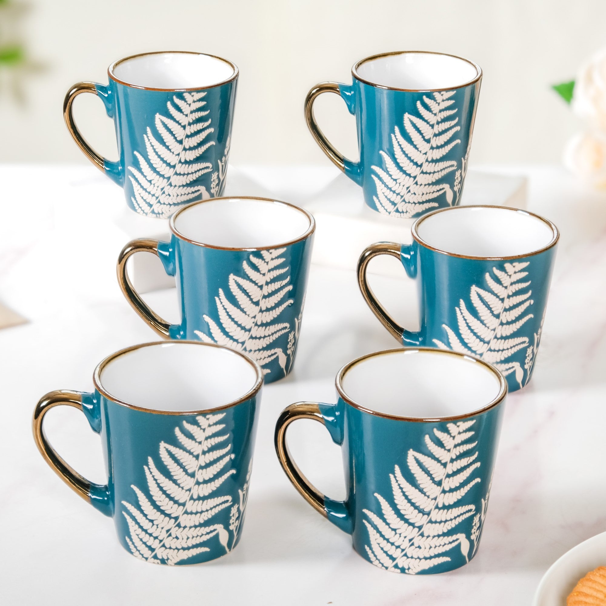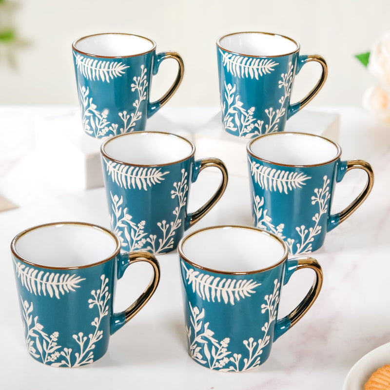 Start your day immersed in the serenity of nature with our leaves and flowers coffee mug set of 6 in teal. These exquisite coffee mugs feature delicate silk-screen printed designs of leaves and flowers against a deep green backdrop, inviting the essence of the outdoors to your morning ritual. Meticulously crafted from premium ceramic, these mugs effortlessly merge artistic beauty with practicality. The golden metallic accents on the rim and handle not only add a touch of opulence but also offer a comfortable, anti-slip grip.