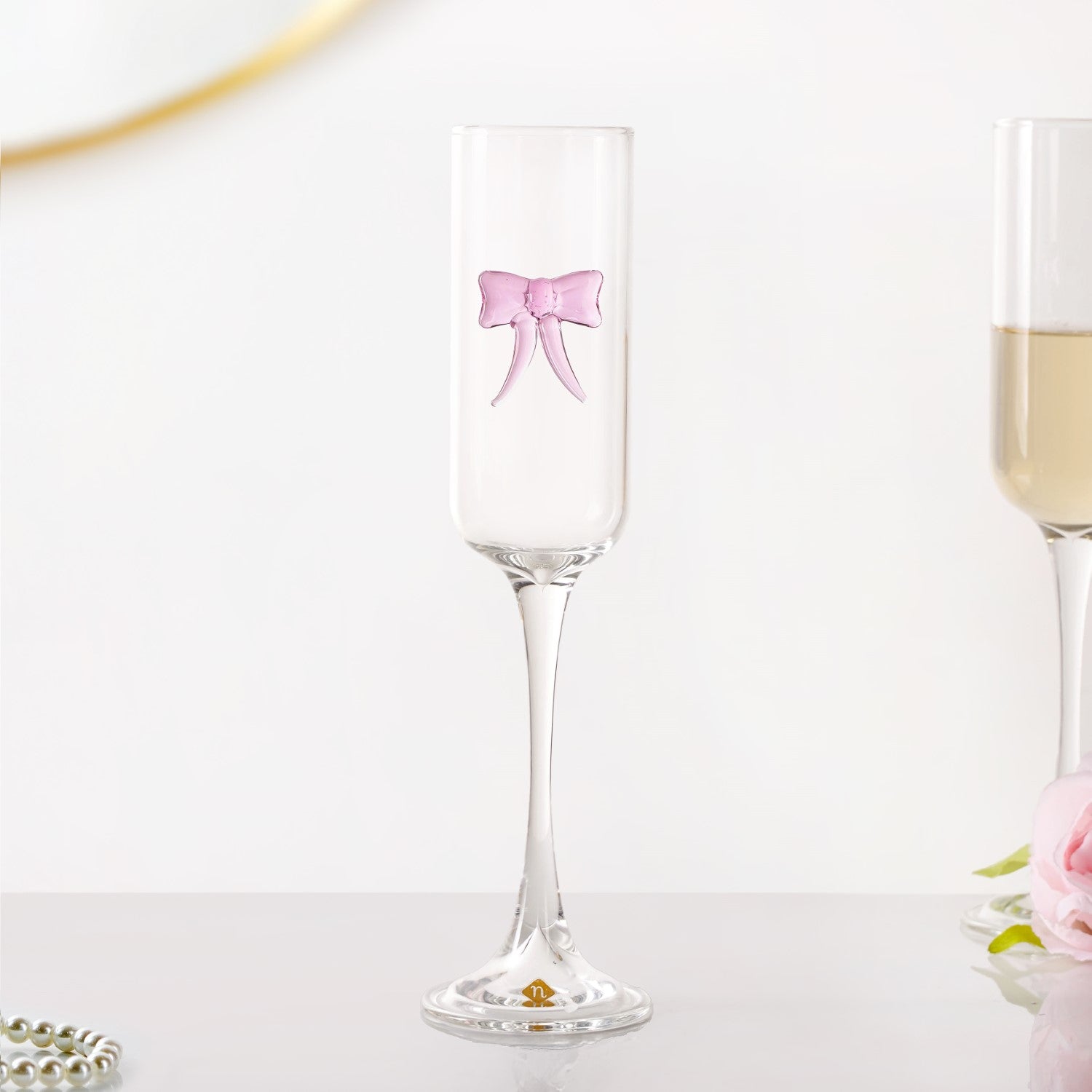 Design: Crafted from clear borosilicate glass, this champagne flute has a sleek, smooth silhouette with a tall, refined profile. Its signature feature is a blush-pink bow, crafted from borosilicate glass and placed on the exterior as a small sculptural accent. The combination of the minimalist shape and the softly tinted bow creates a visually feminine, contemporary look.